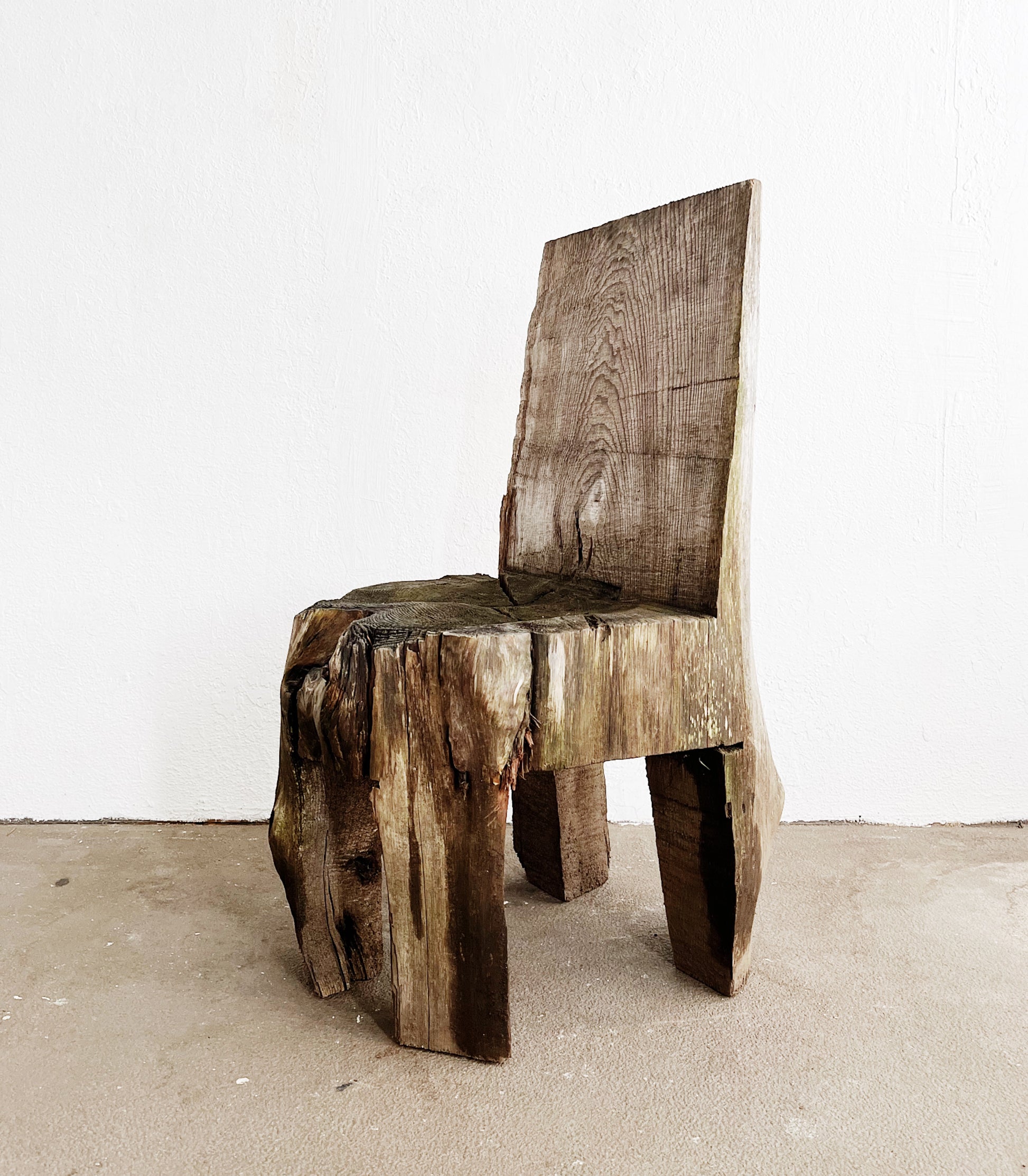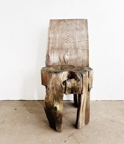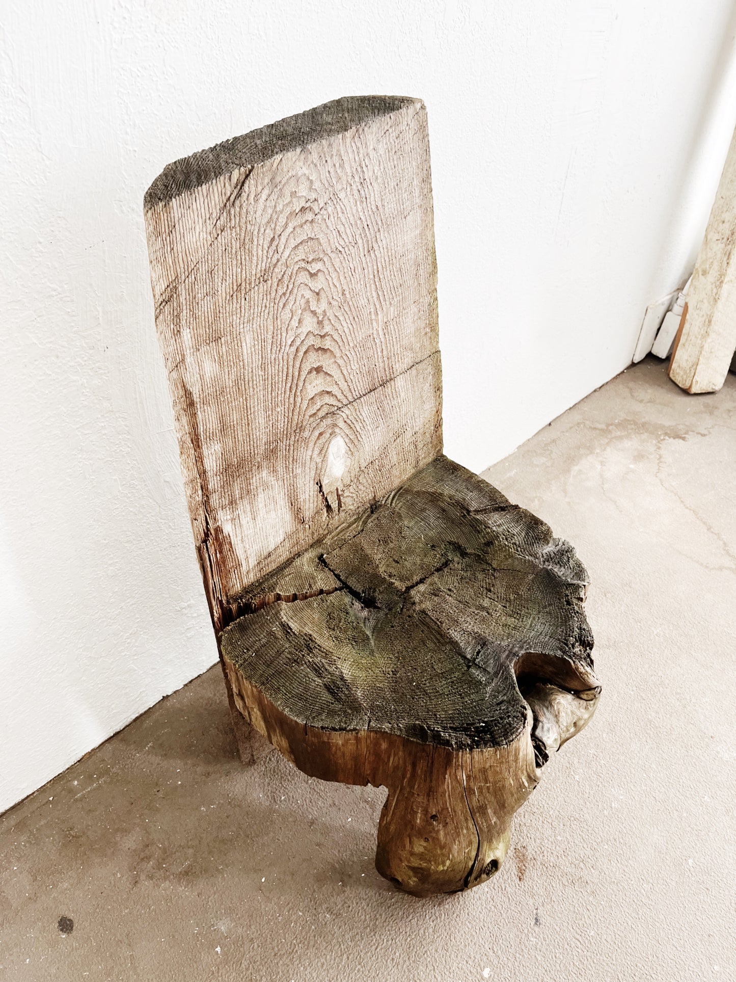 In the spirit of Nakashima and more recently Vince Skelly, this chair is carved from a single trunk. Age rings are visible, as are the natural burls. This is sturdy and actually a pretty comfortable spot to rest your bottom, thanks to the formed seat. We recently washed this down, but dry it fades to a lovely weathered pale grey. You could stain it too.
