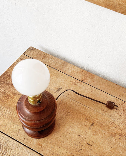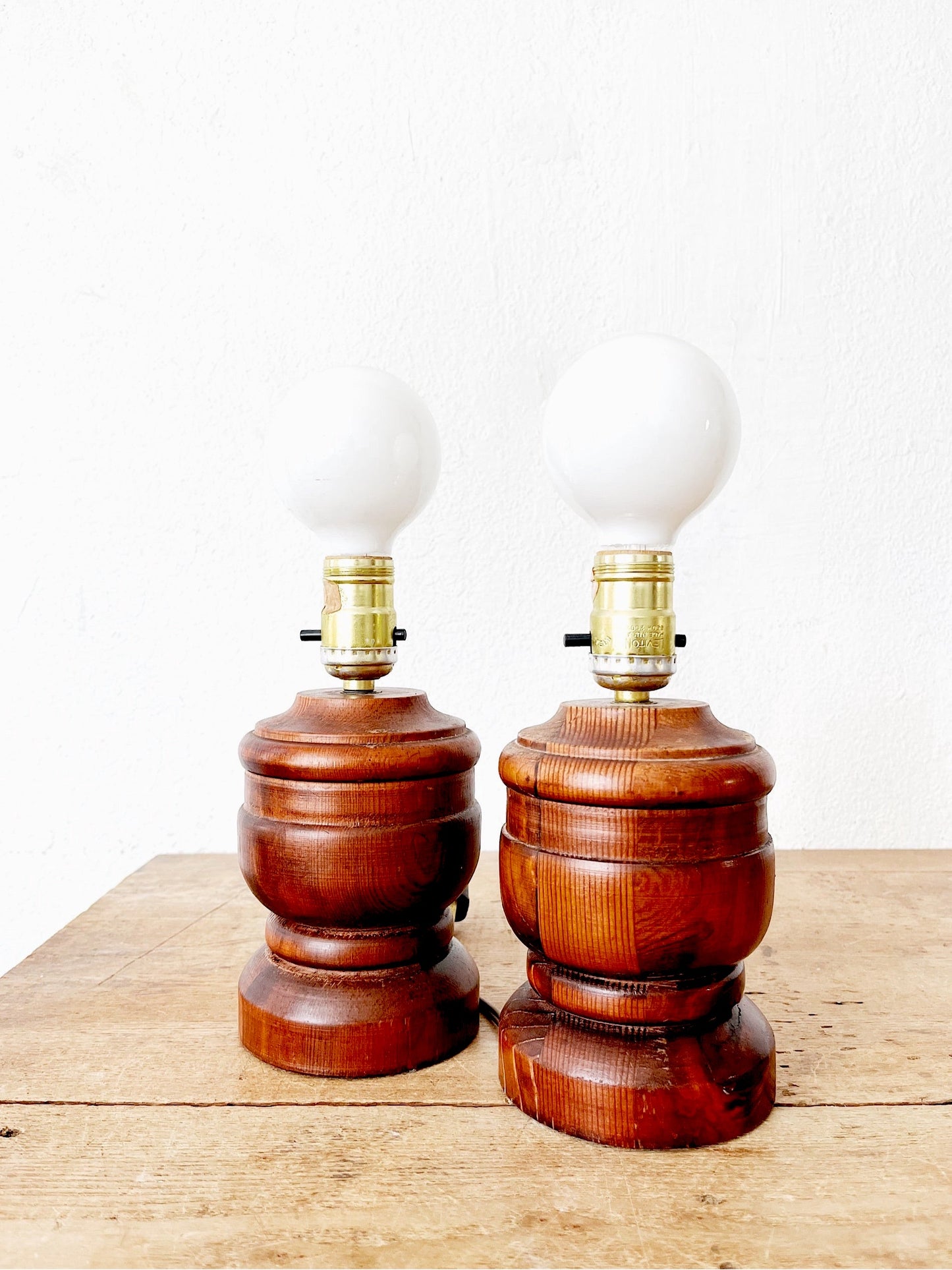 Hand turned wood lamps. Wonderfully grained little cuties. In great condition but please note the short plugs. They were most likely mantle lamps at one point.