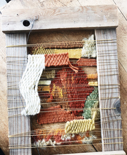 Double sided loom with a project intact. Wood frame. Makes a wonderful art piece