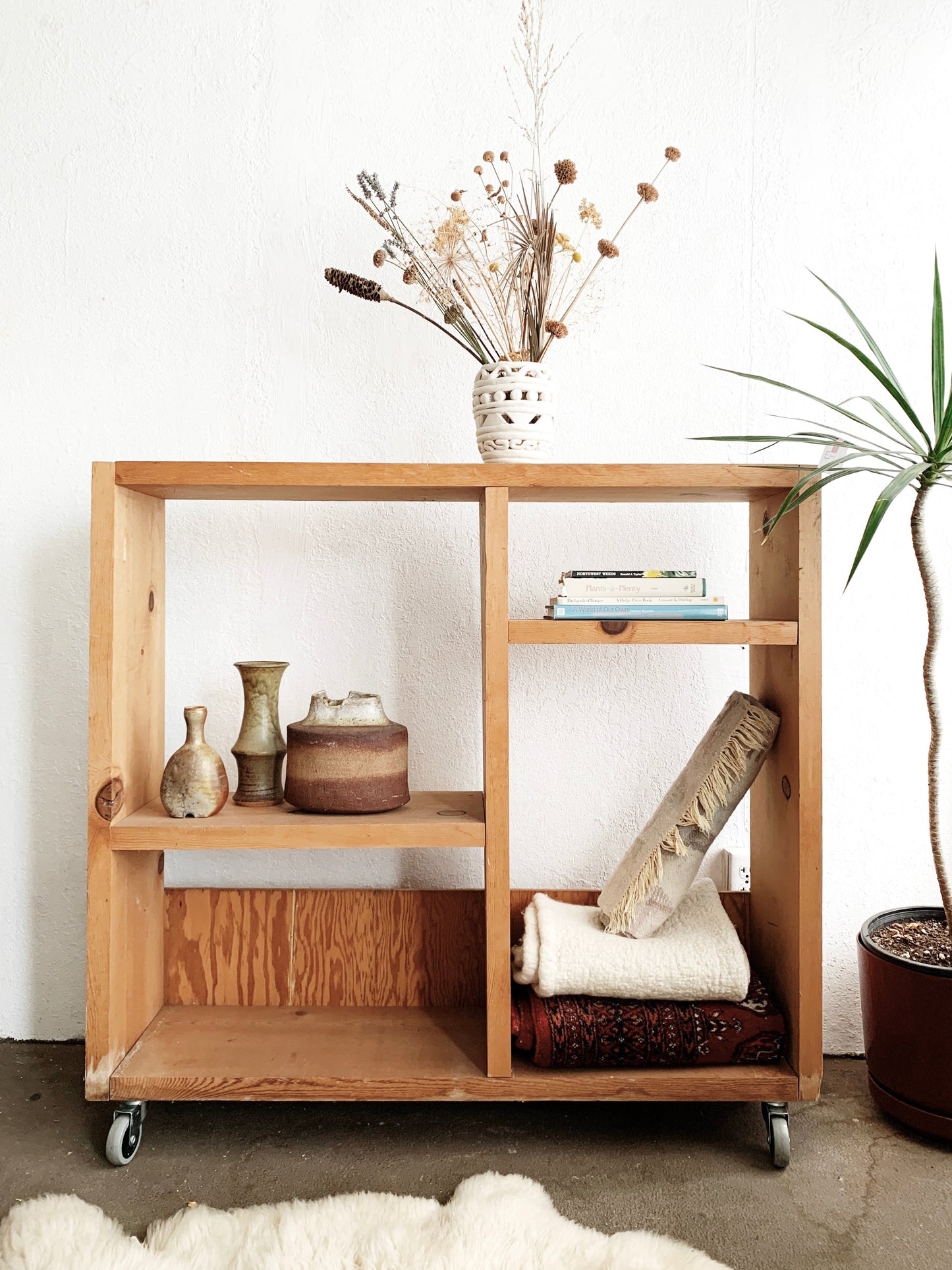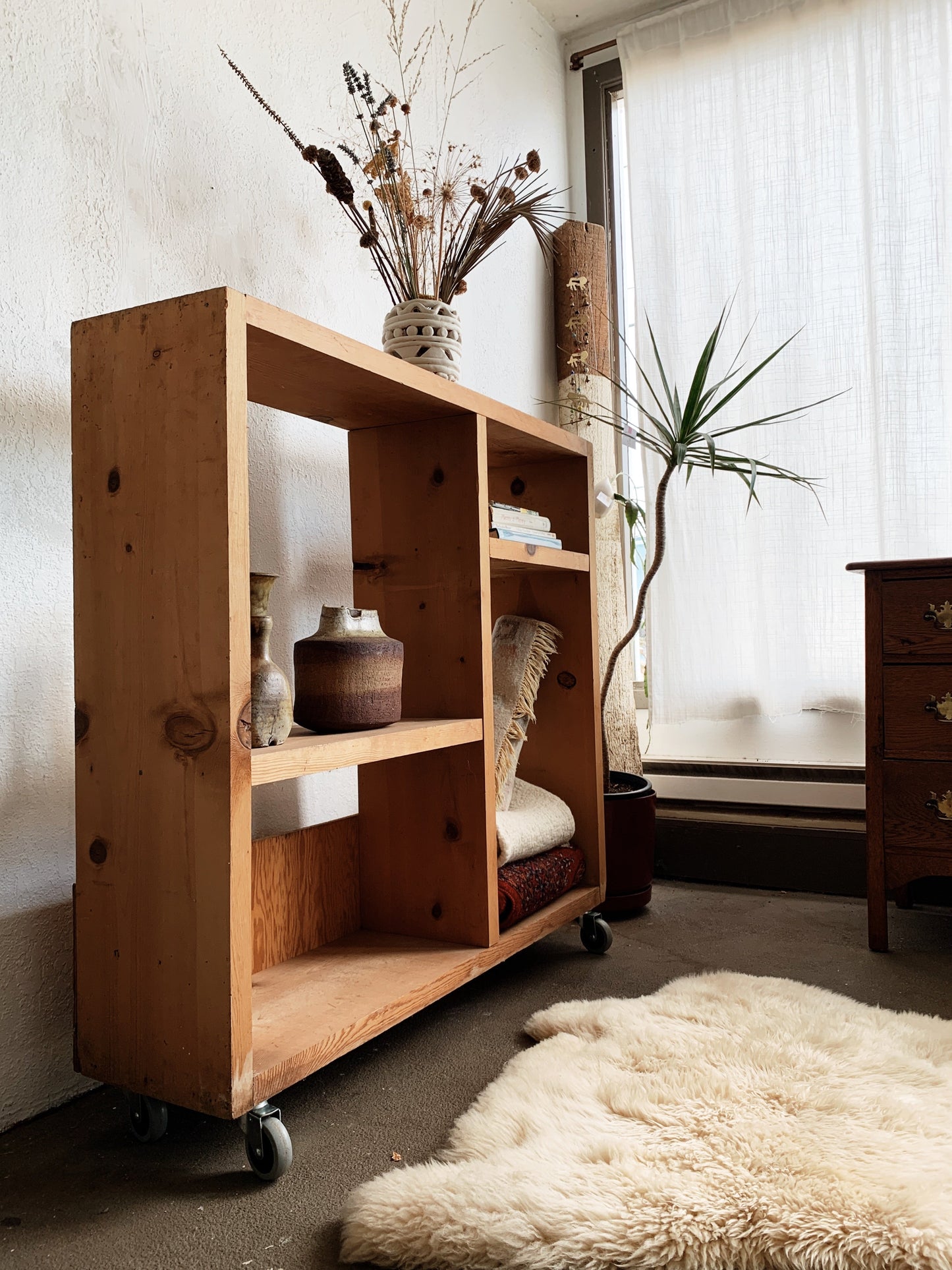 Fantastic sturdy handmade solid wood shelf on wheels! Super versatile, great as a space divider too. Moves smooth and easy.