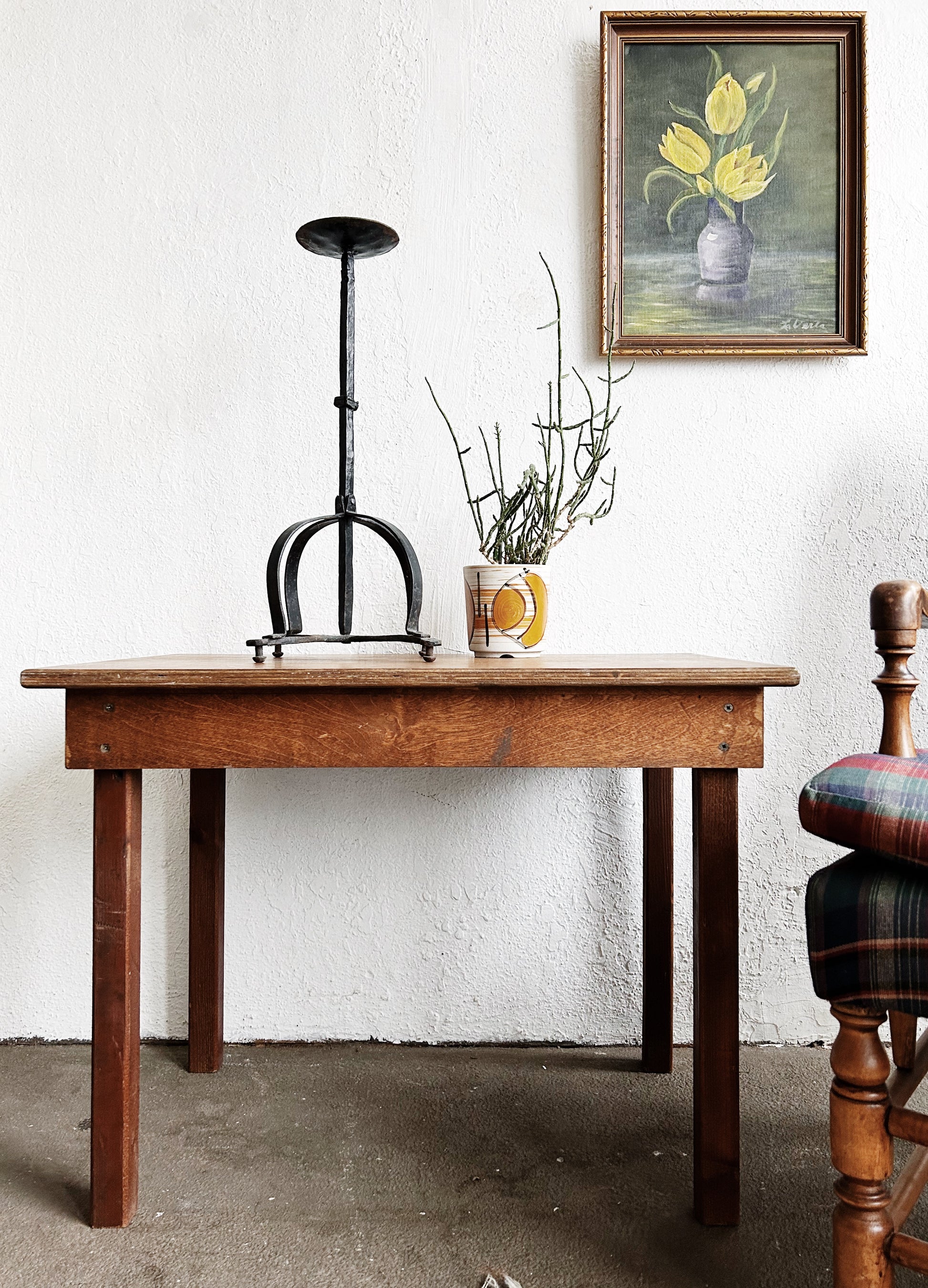 Handmade sturdy wood table. Has that modern craft vibe we’re all into. Made by grandpa at the farm. Overall in nice condition and sturdy. Some paint marks to the top which adds to its charm.