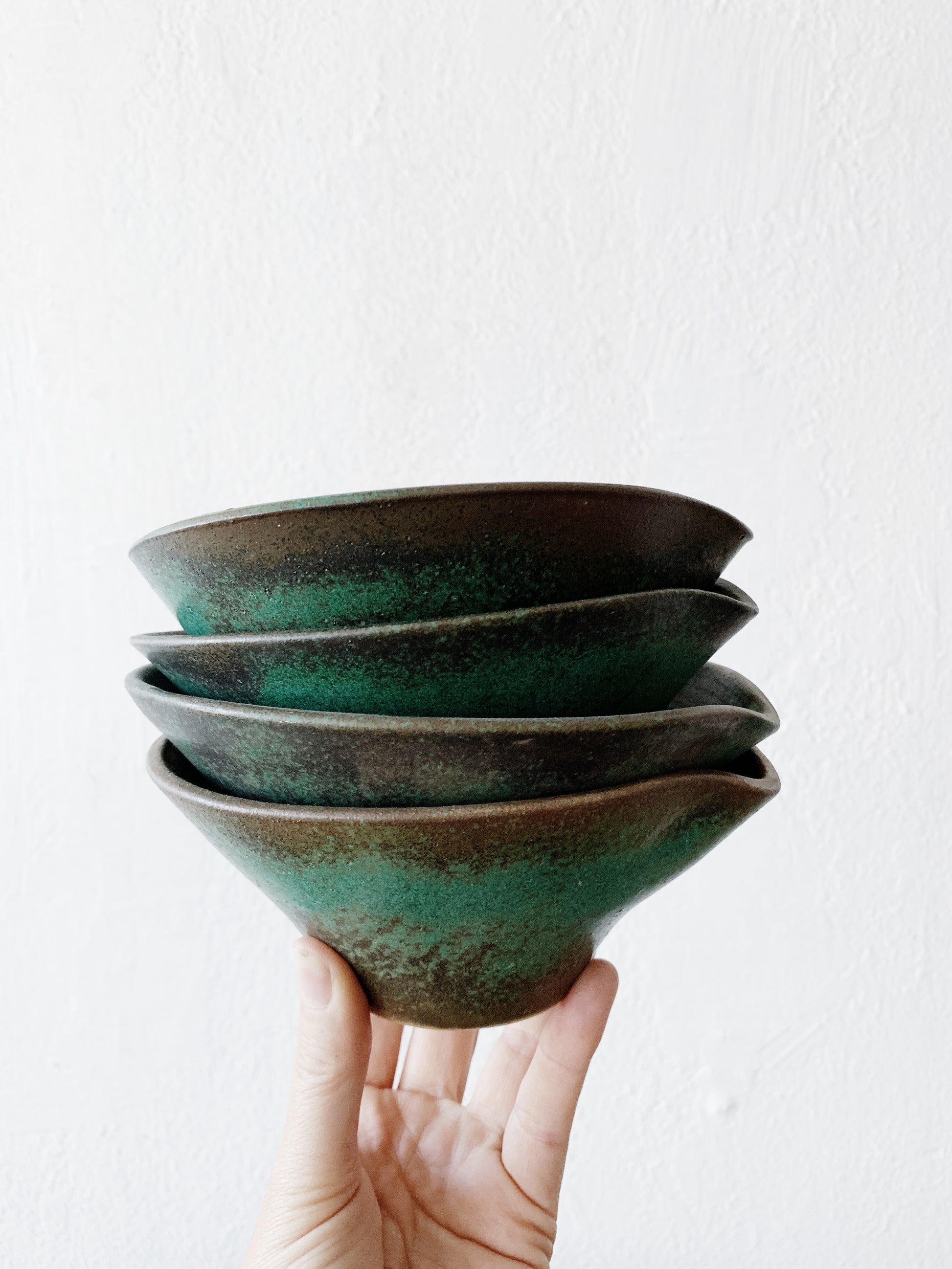 ramen/ miso bowls: set of four beautifully made bowls. Cutout fir chopsticks. The glaze on these is stunning, matte mottled turquoise and brown. 6x2.5”. All in perfect condition.