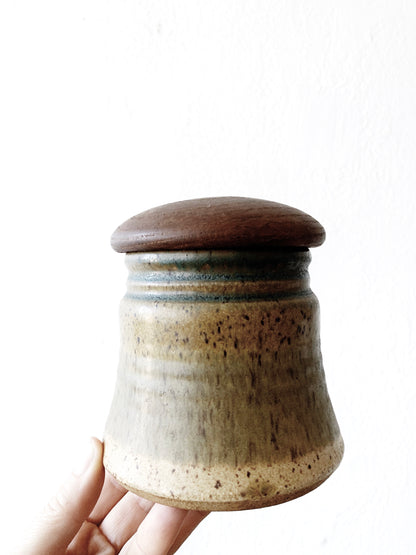 wood lidded vessel, has a small non structural crack on one side. Really beautiful regardless, nice hand carved wood lid. 4.5x5”