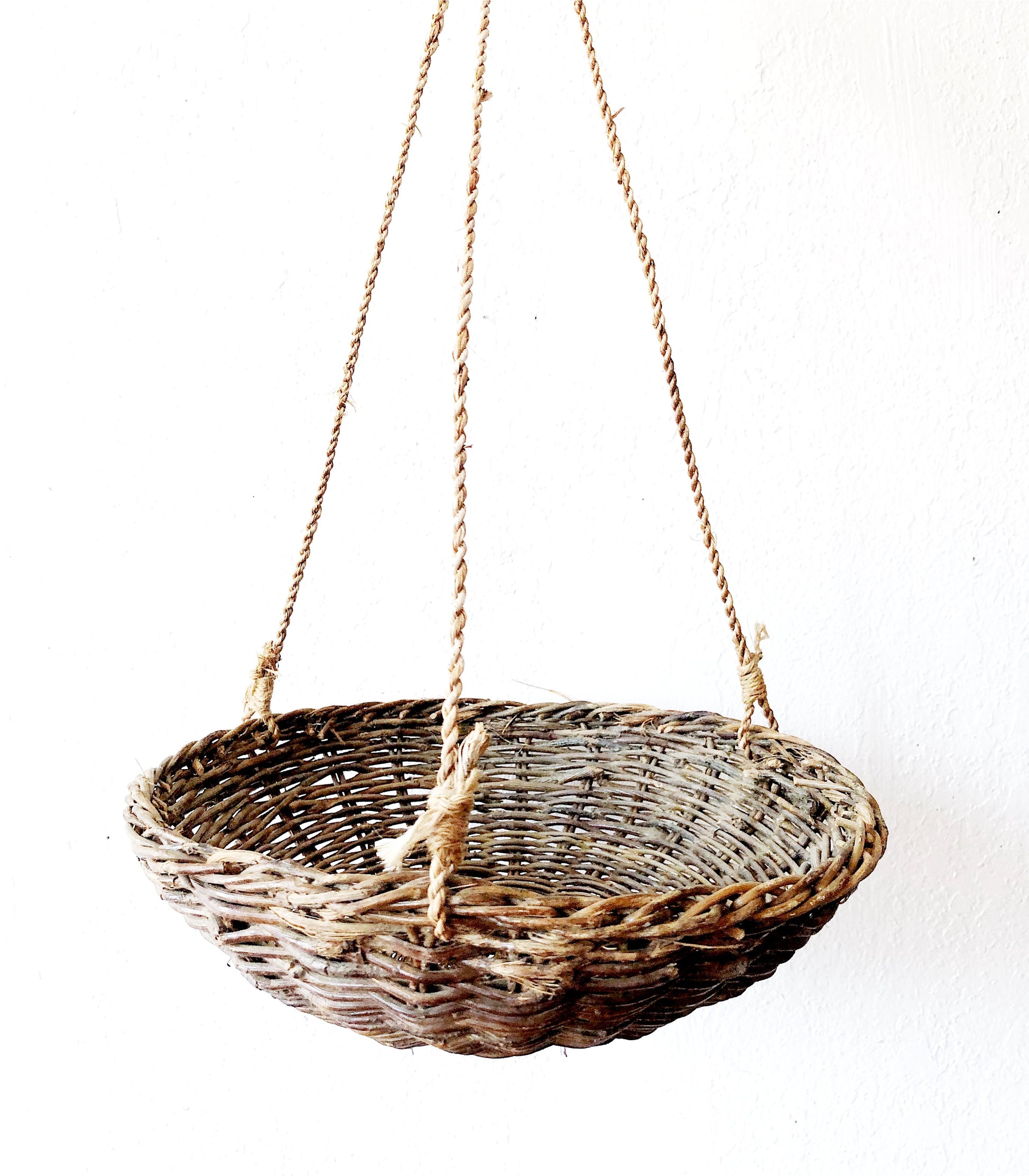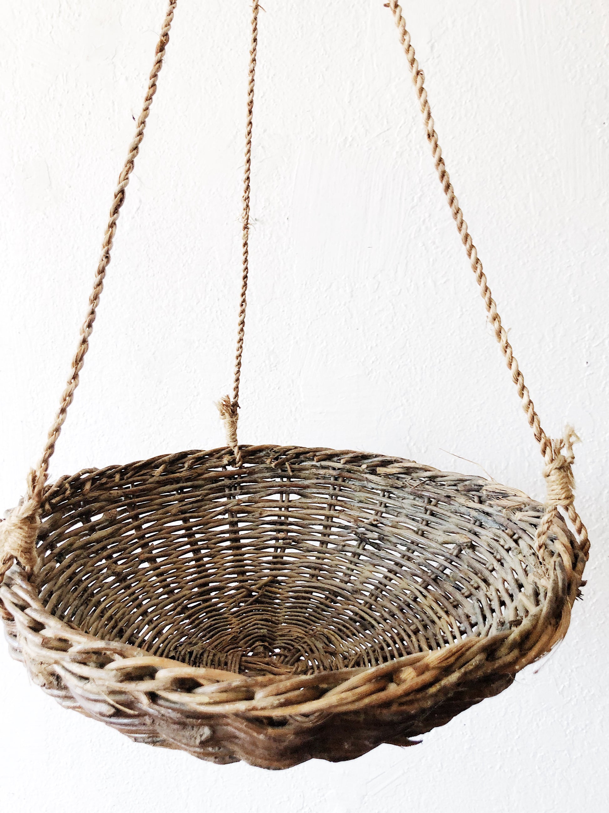 A delicately woven grapevine basket for hanging fruit or plants. Attractive catch all