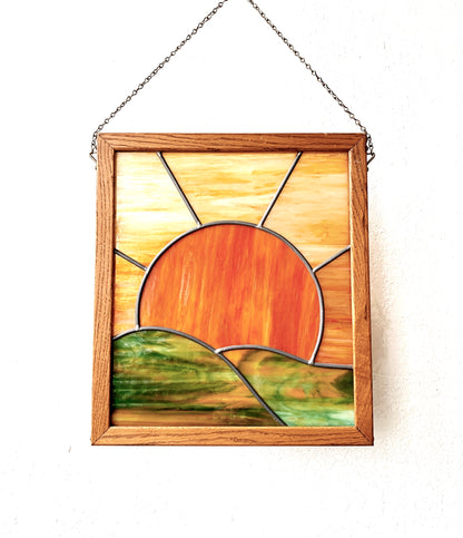 Absolutely beautiful leaded stained glass art panel. This will brighten your day for sure hanging in a window. Beautifully made! Framed in oak with brass chain.