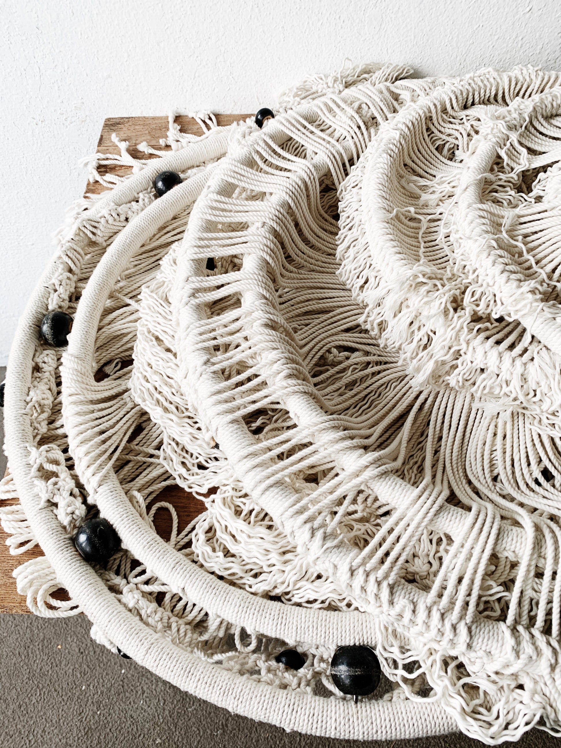Massive vintage hanging macrame with round glass table top. Cotton rope with wood beads in pristine condition! Purchased in the Philippines in the 1960’s from the maker.