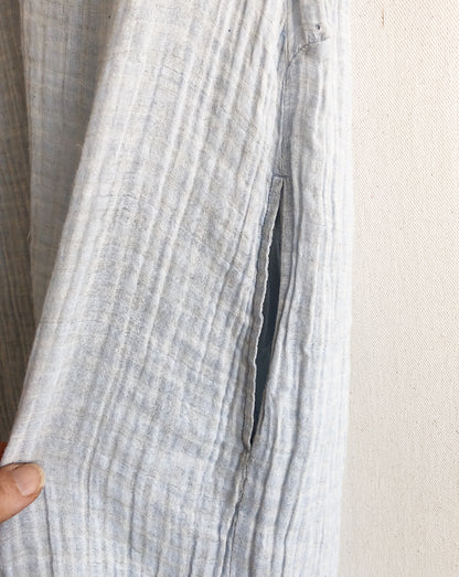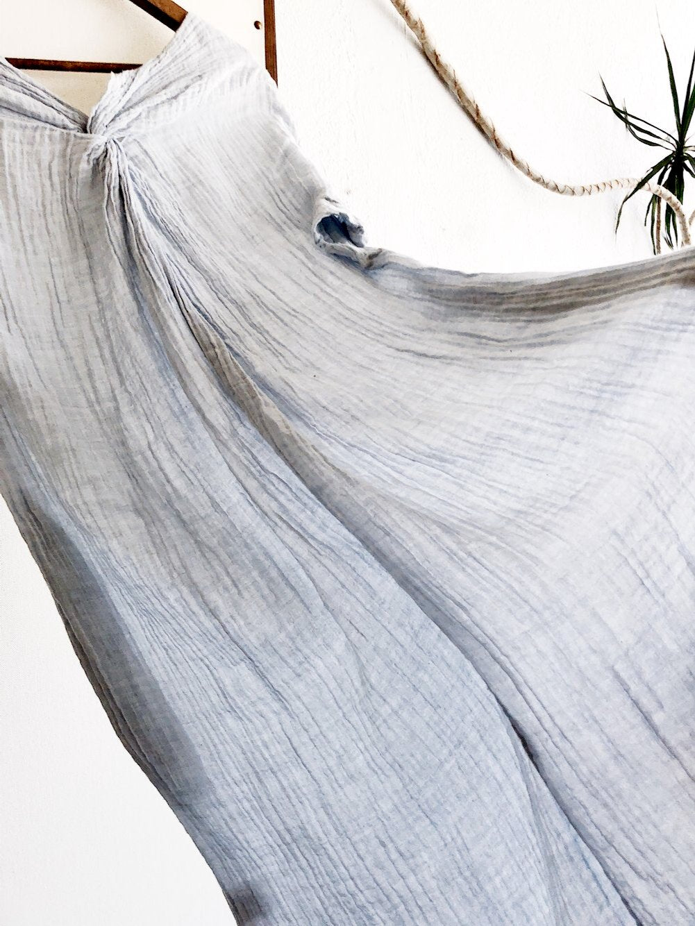 like new Issey Miyake dress from the passport line. This is light as a cloud, pale sky blue. Classic Miyake pleats at the neckline. A line bodice and barely there sleeves. Pockets!