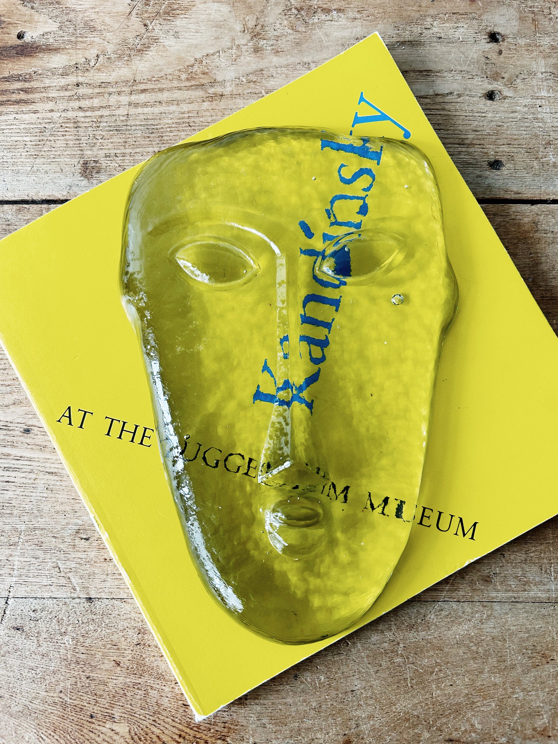 Sky Dreamer mask by the Jarimillo Bothers. Mexico. Heavy blown and bubbled glass with a green tint. Looks wonderful placed upon a favorite art book or propped on an easel