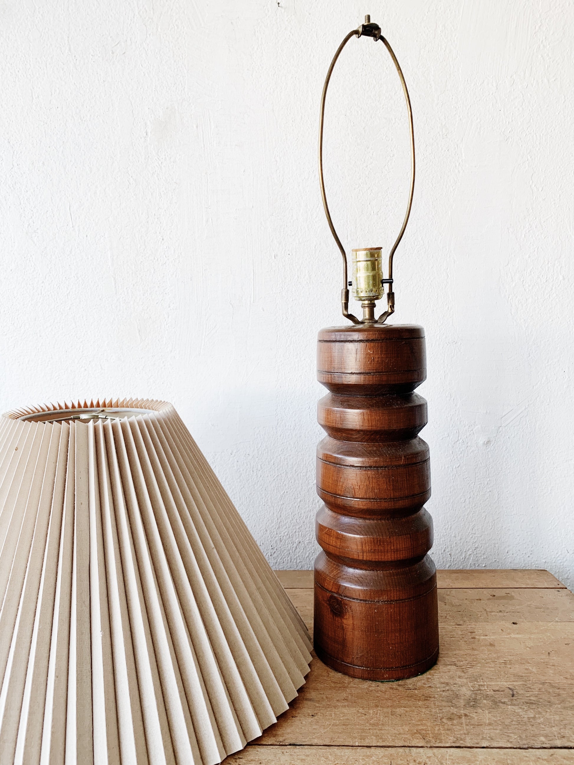 Fantastic vintage turned wood lamp with pleated shade. Includes a brass harp and finial.