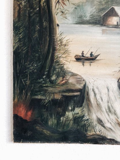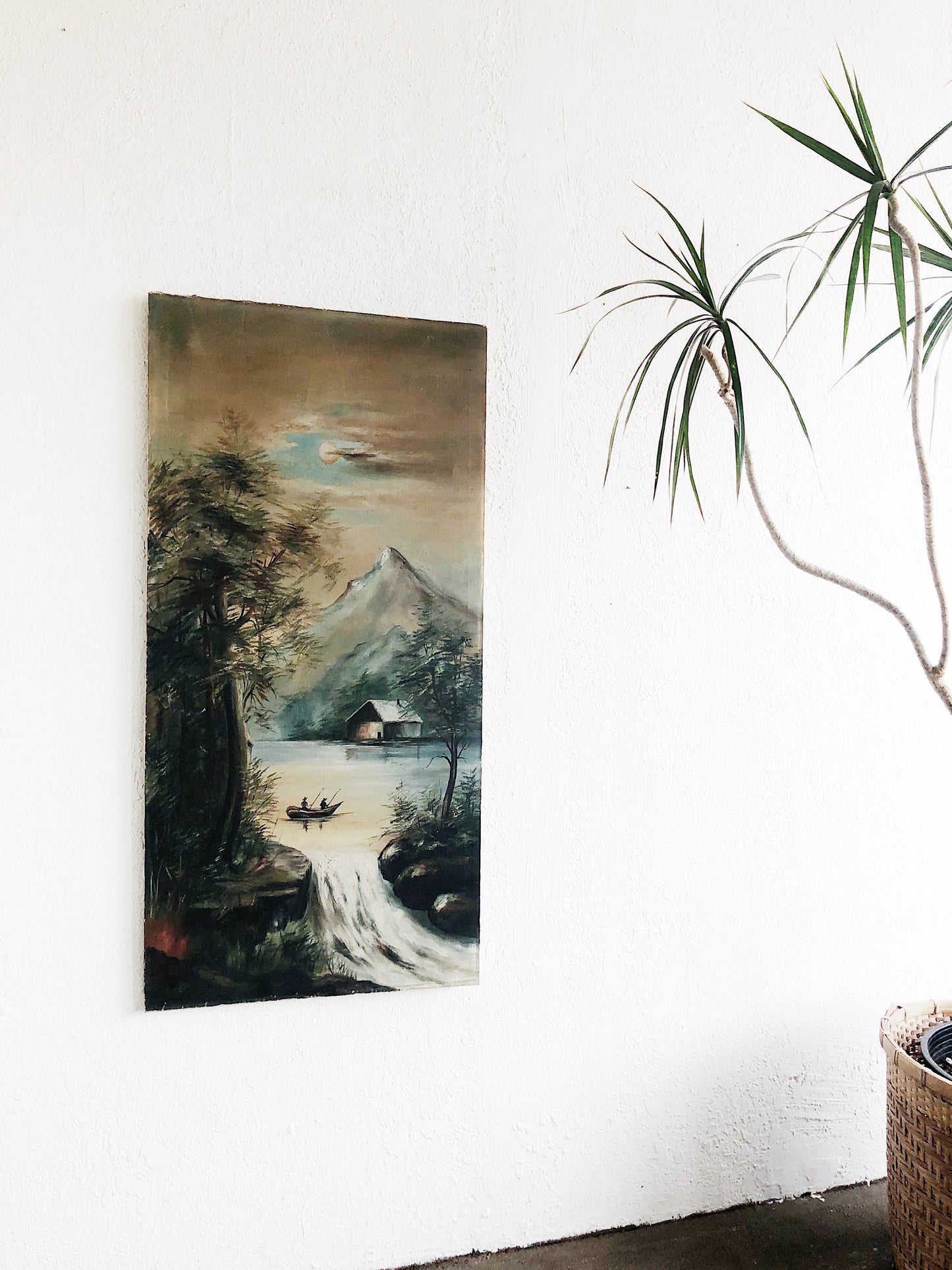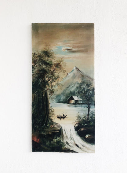 A large and stunning antique oil painting. Mountains and moons, campfires and rivers. Very old stretched linen.