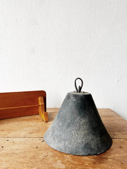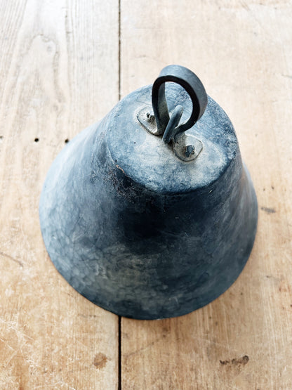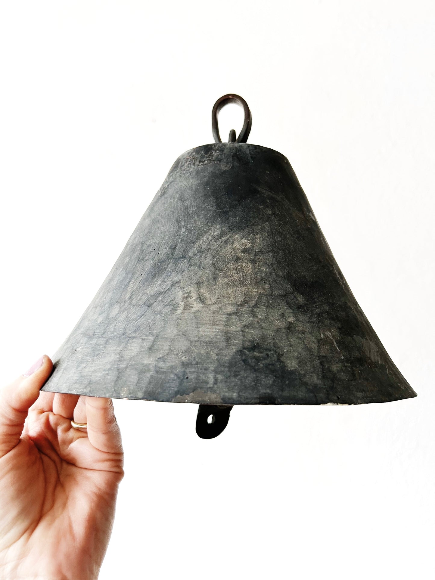 Large cast iron bell with excellent patina. Has a nice organic, hand hammered texture. A beauty! Will come with a simple chain for hanging.