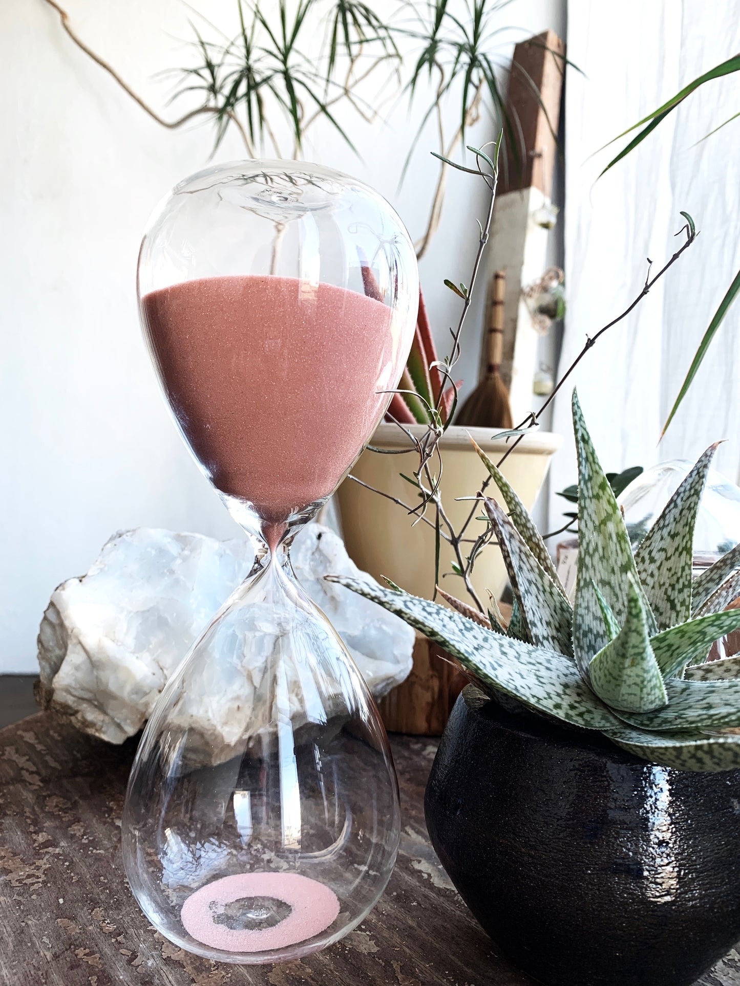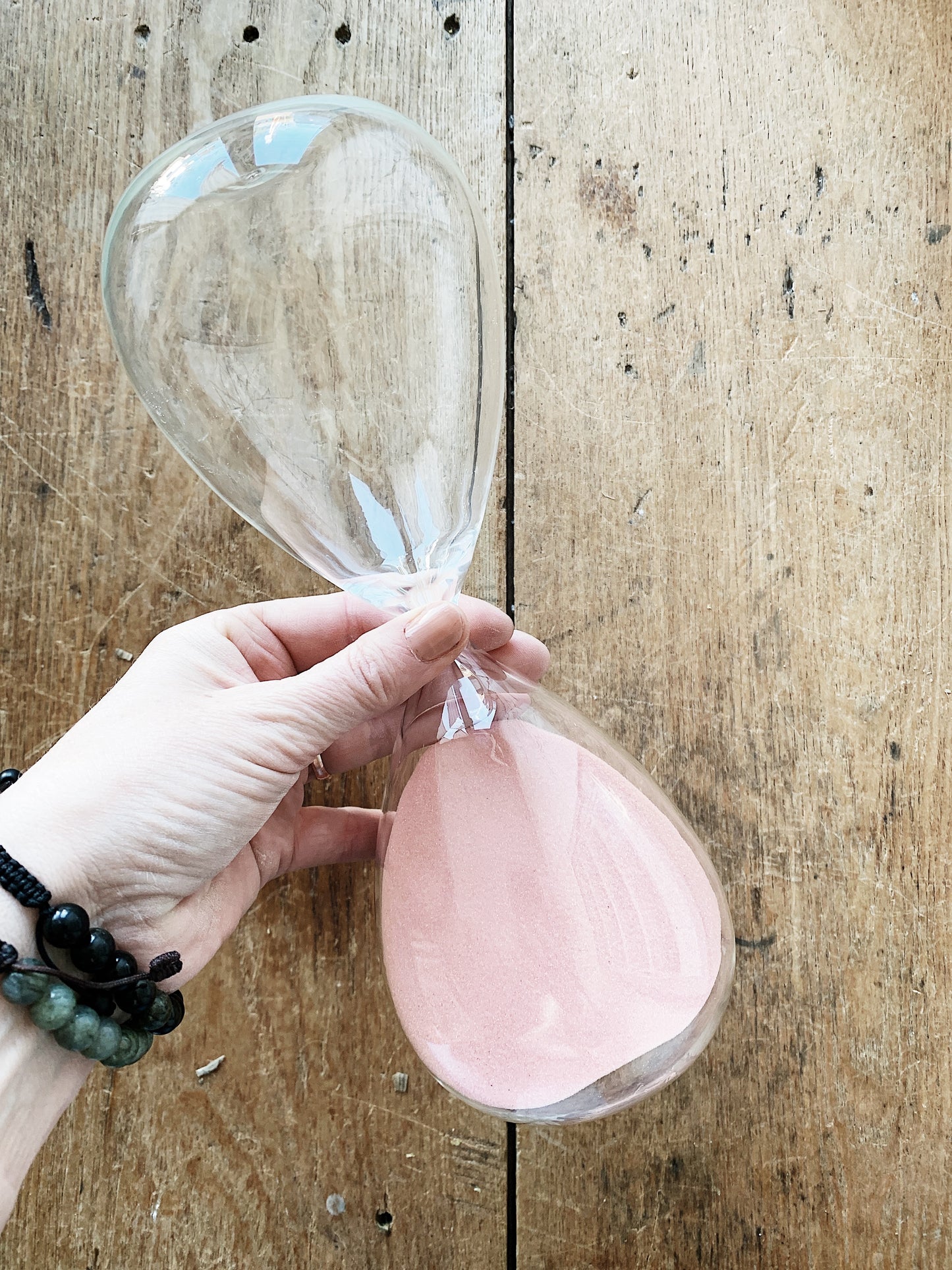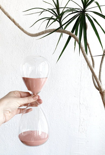 A nice large blown glass hourglass with salmon colored sand. Works great and pretty taboos!