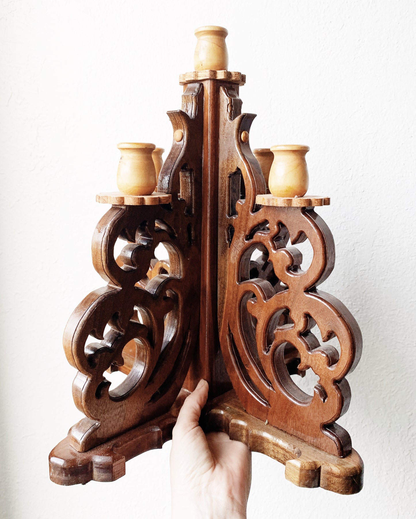 Stunning large wood candelabra. Hbeautifully carved! Holds five standard tapers