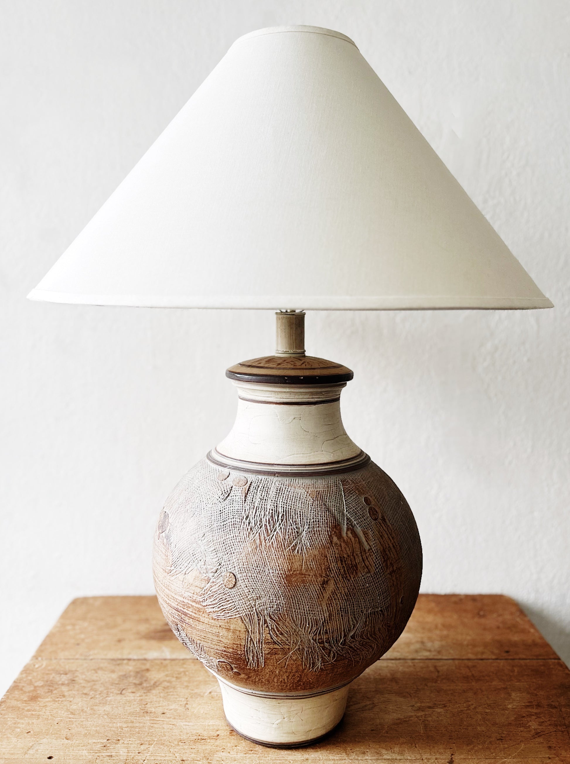 Extra large lamp by Casual Lamps of California with sgraffito and relief design in creamy earth tones. Locals will also receive the triangular linen saucer shade which caps it off perfectly. Three way switch and plug end. In great condition.