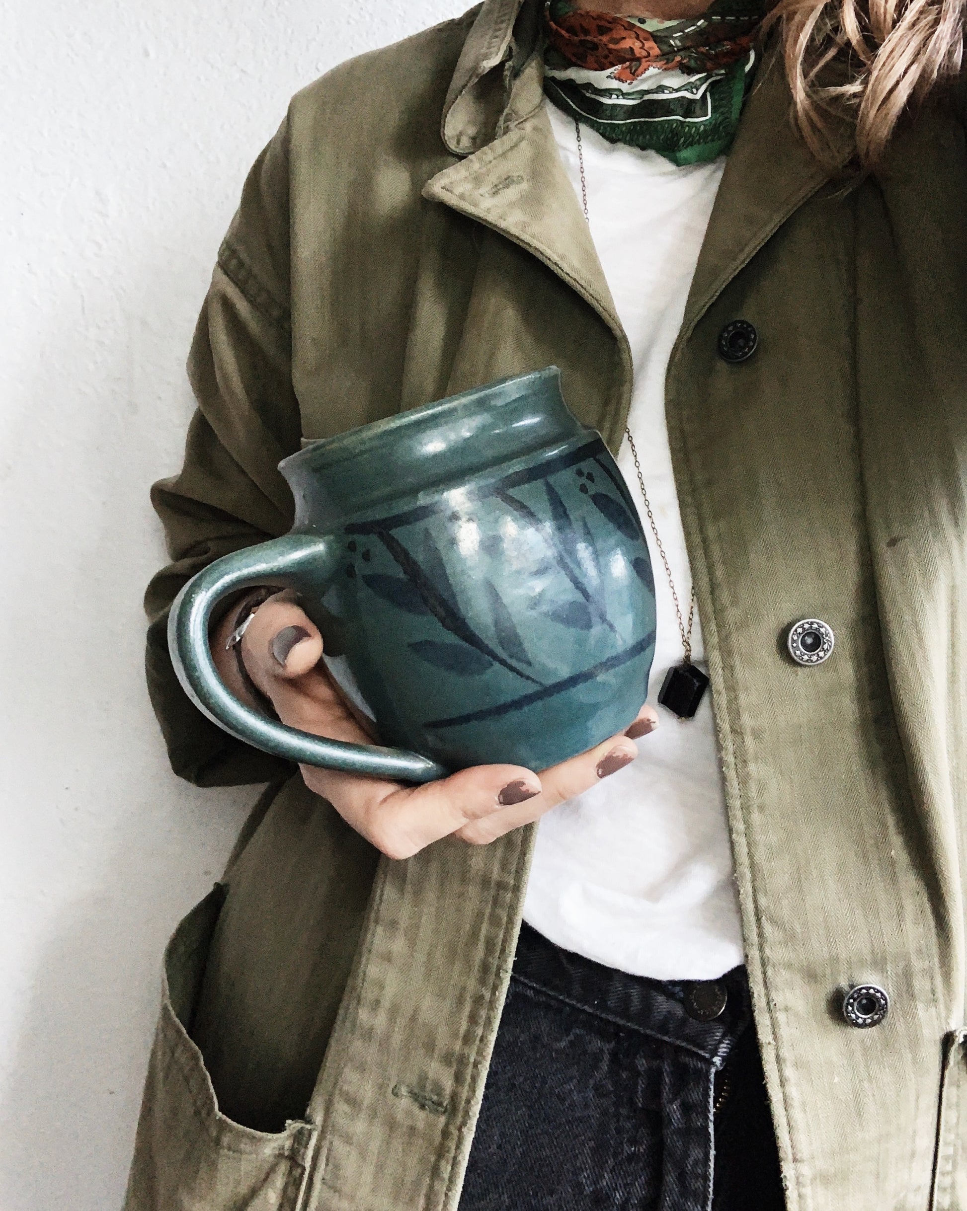 Beauties! Weighty deep blue green floral pattern matte glaze mugs. One of them has a tiny chip under upper lip. Otherwise excellent.