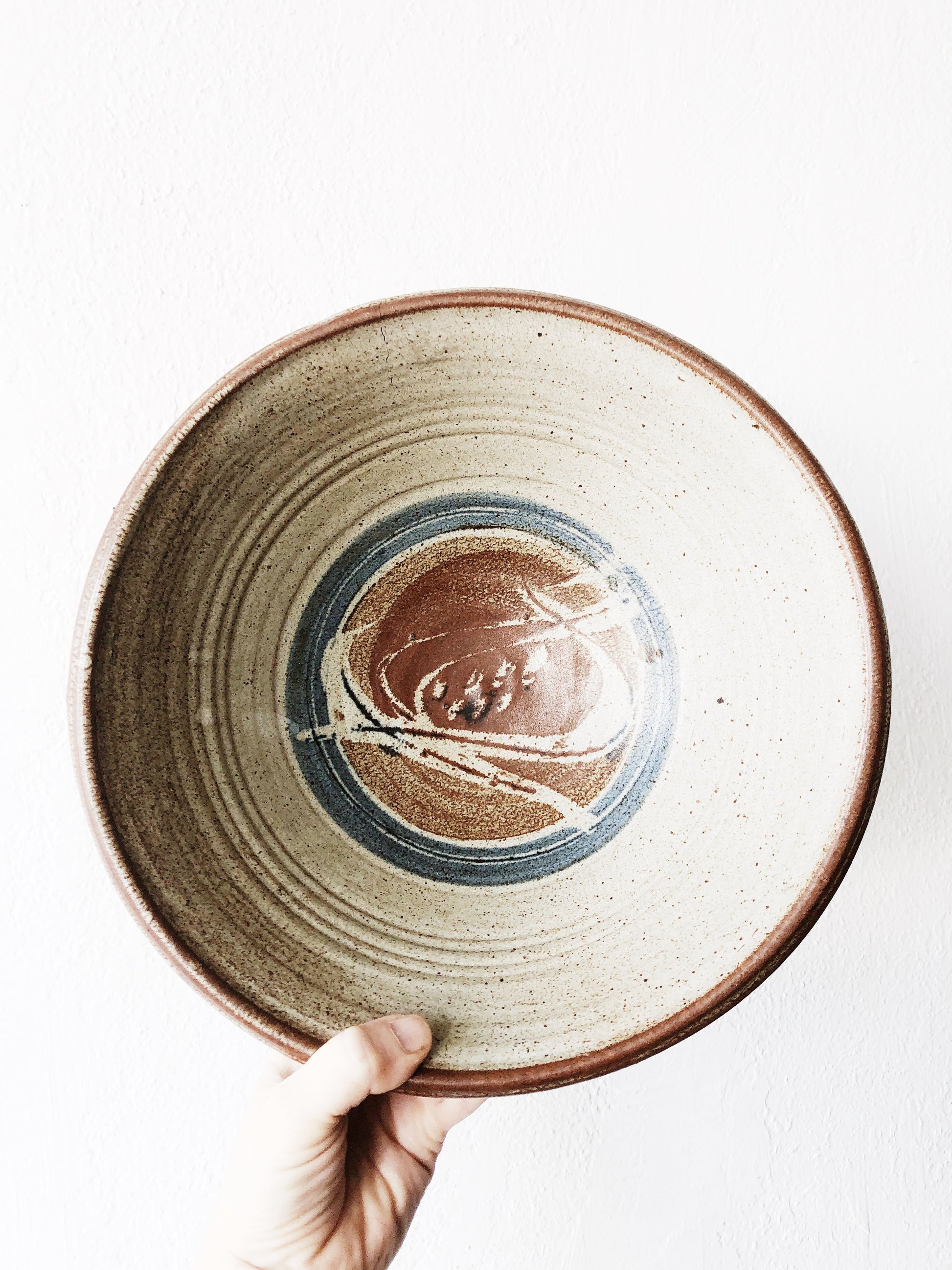 A larger sized Vintage stoneware pottery bowl. Great colors and patterning. Perfect as a bowl for a giant salad, pasta or lots of fruit