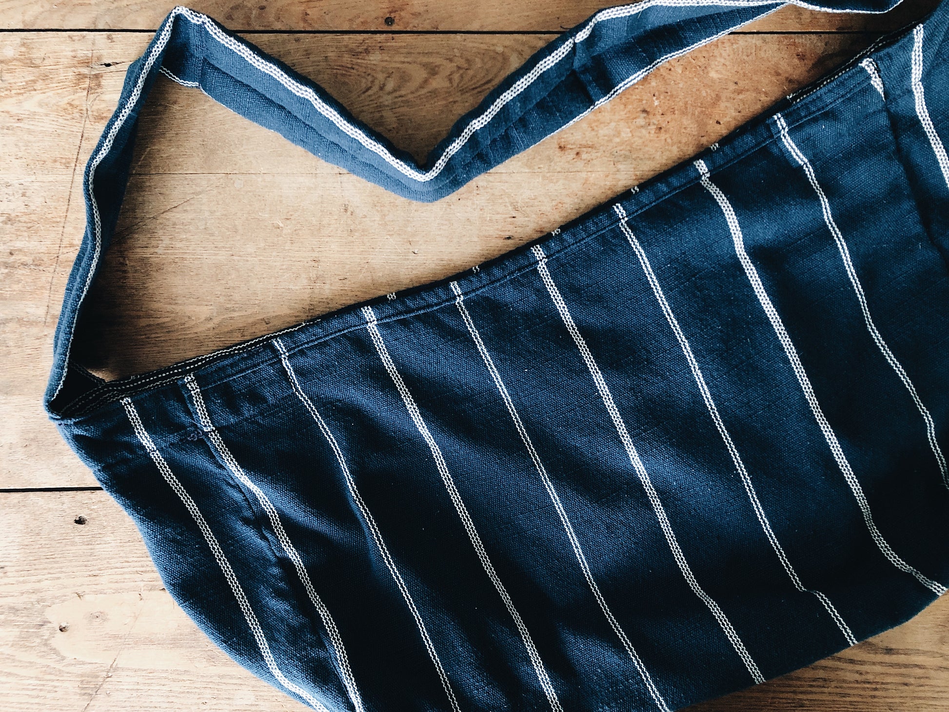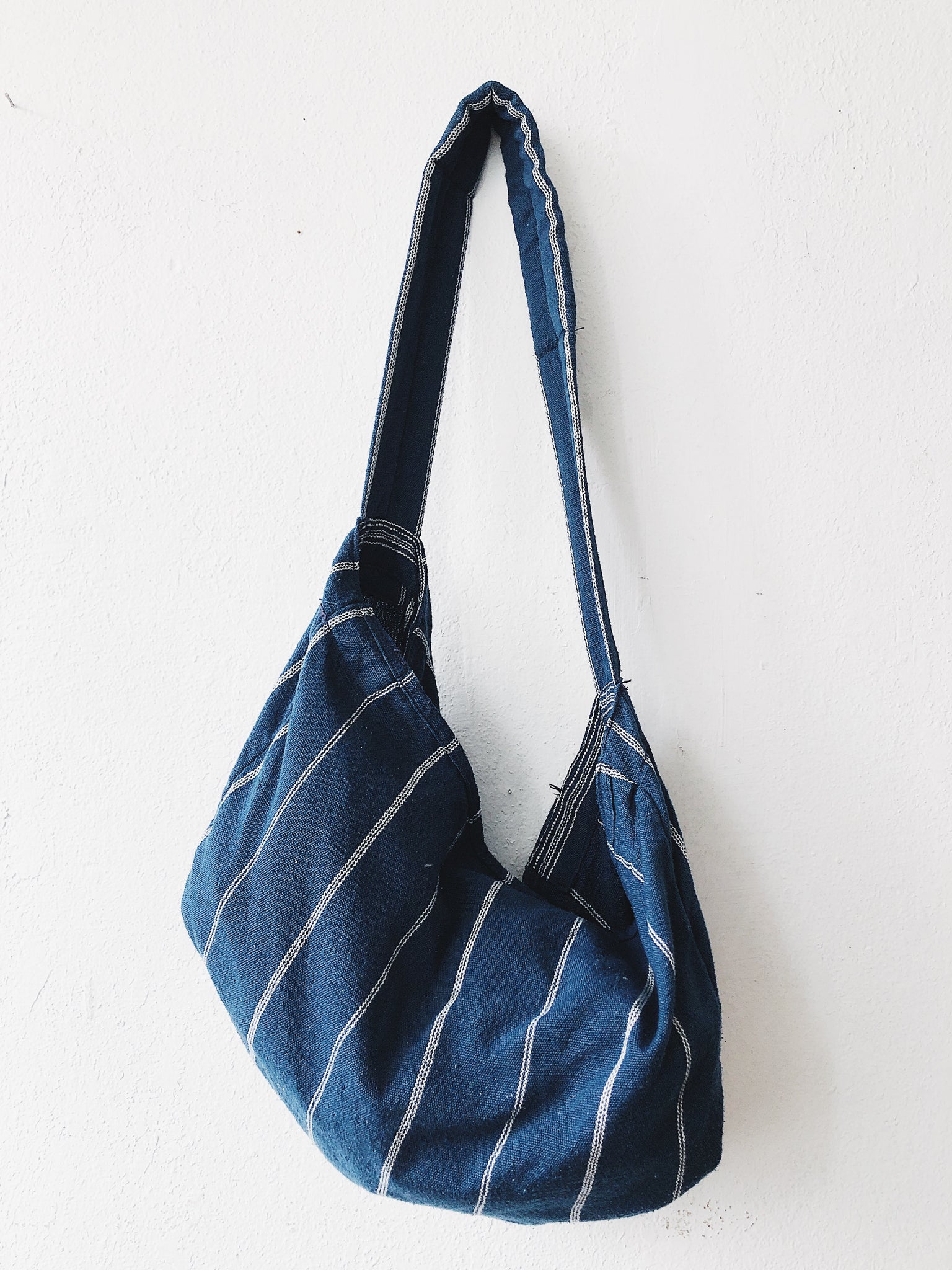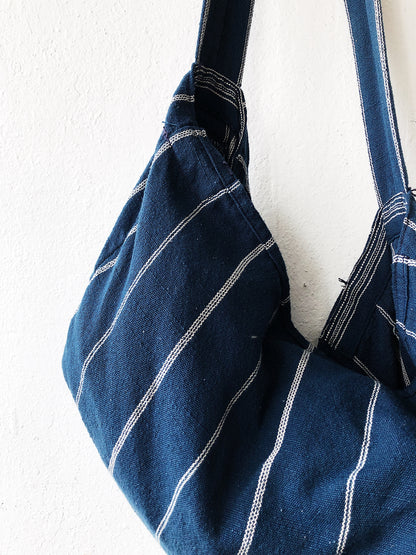 Larger sized tote with a crescent shape. Indigo colored woven cotton. Padded shoulder strap. Can be used cross body as well