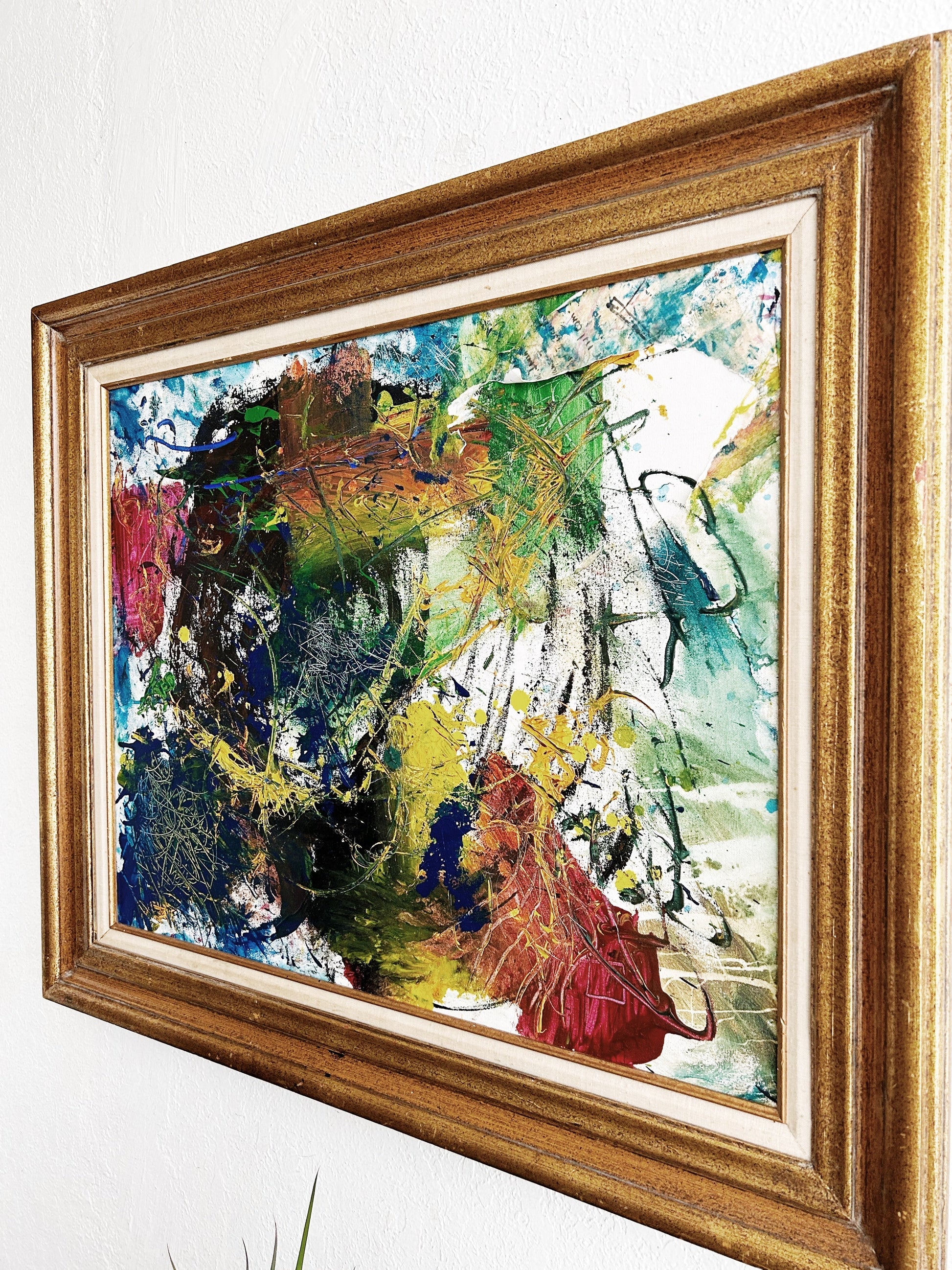 Gorgeous! Large abstract painting with a touch of mixed media collage upper right. Love colors and energy of this one. I’m a nice old frame with linen fillet and hanger on back.