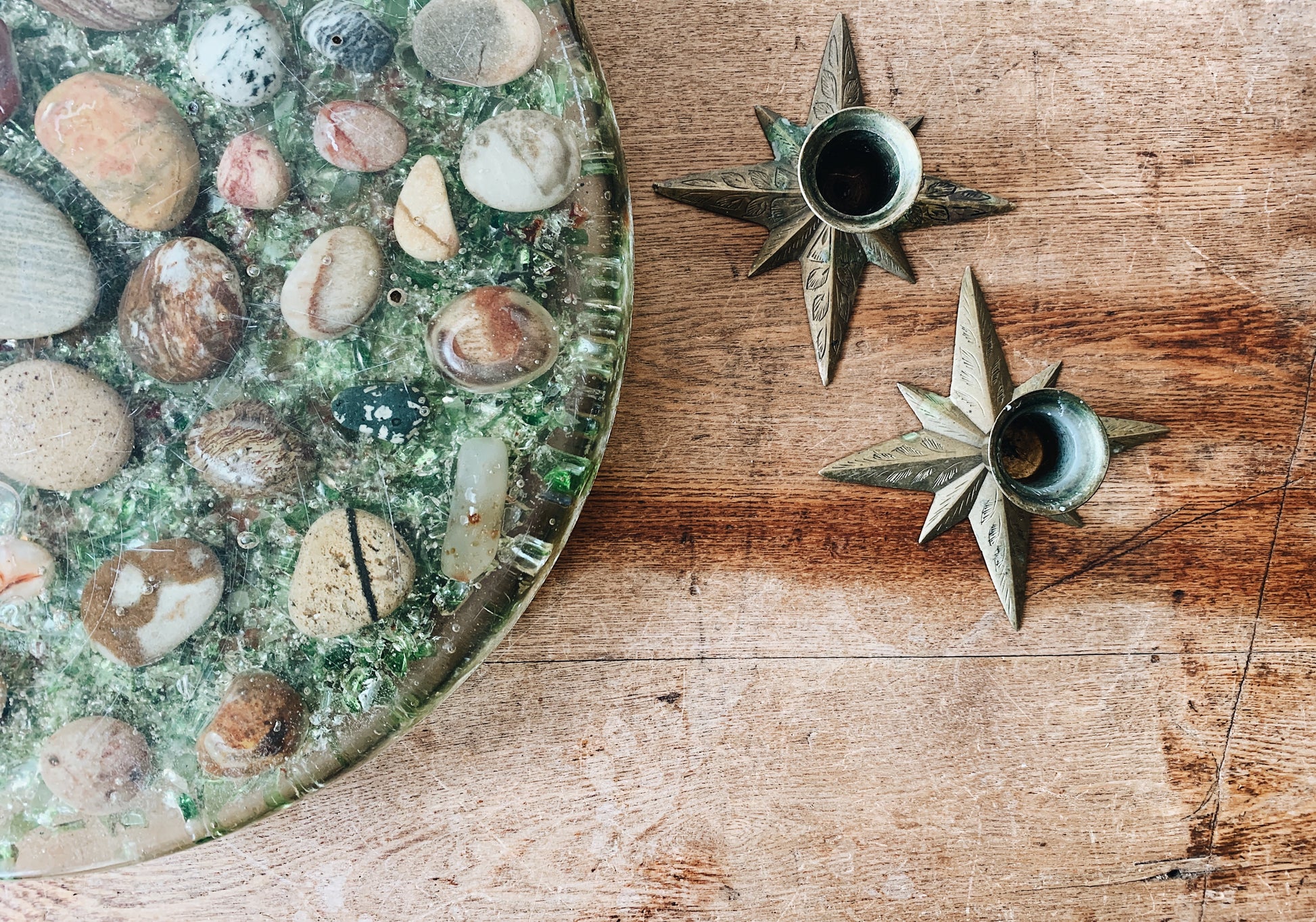 Awesome large resin and agate trivet / tray / or just an art piece. Heavy! Mounted on a wood base.