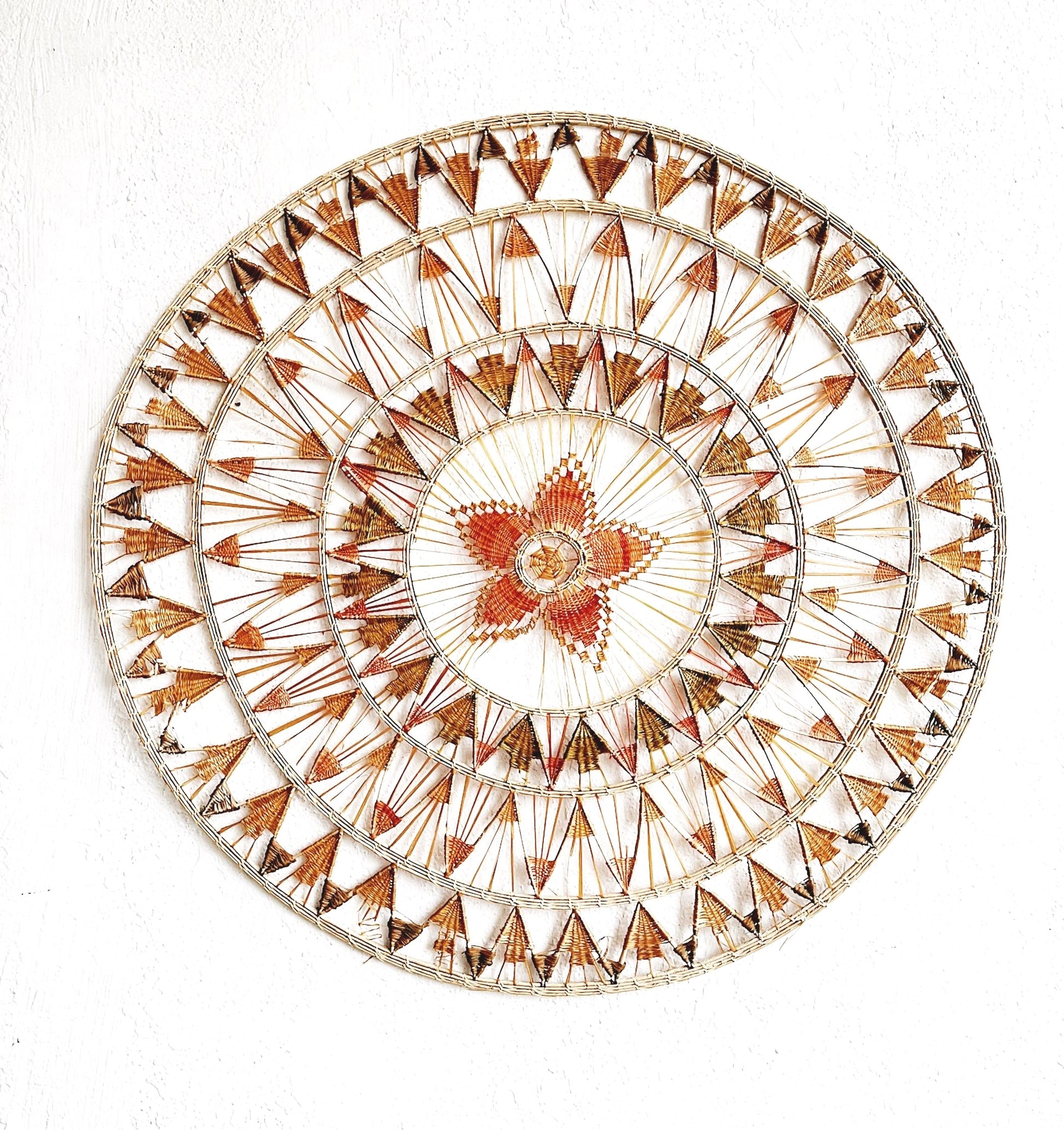 Large woven basket in a mandala shape. Neutral peachy colors.