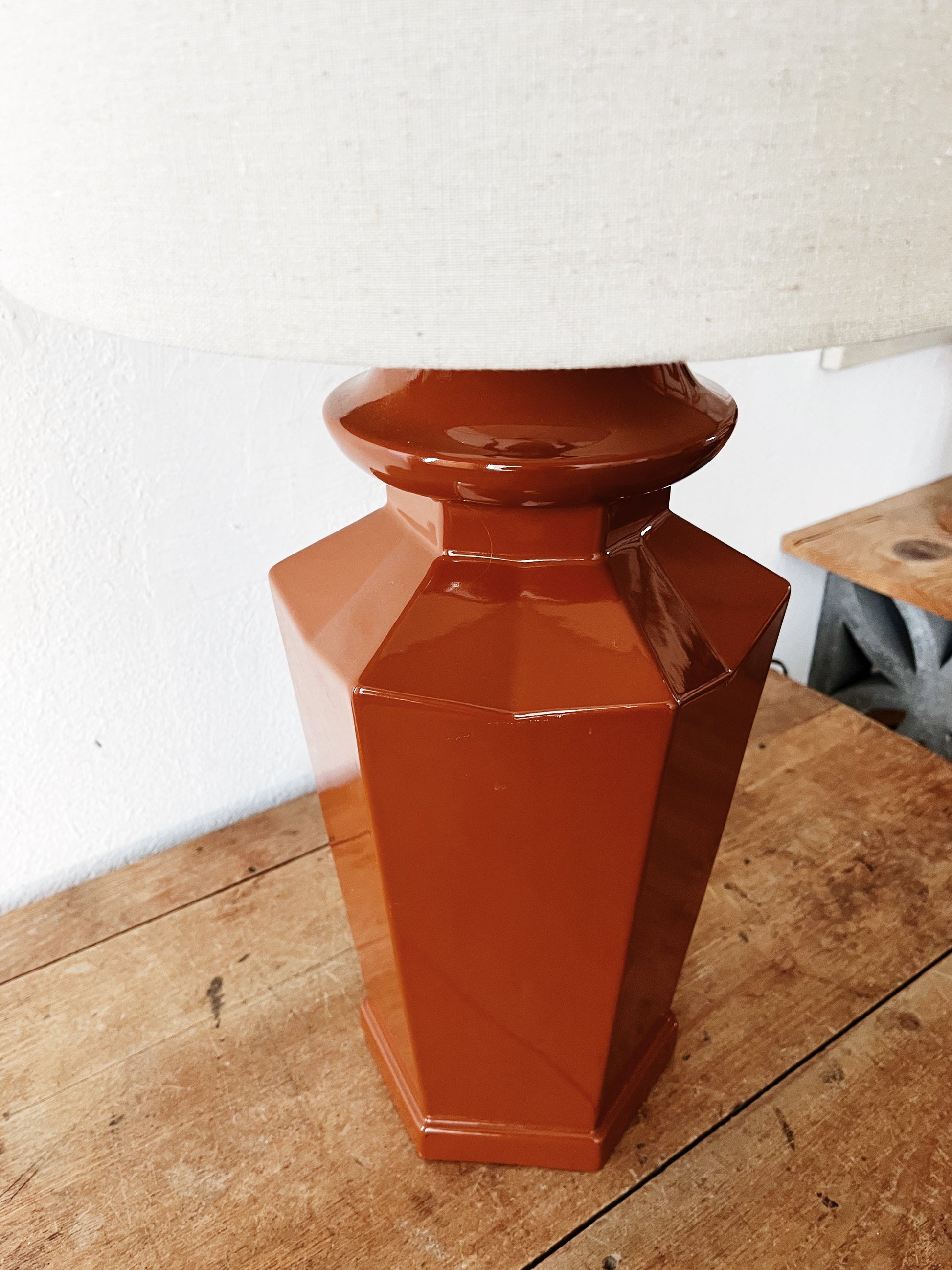 Large terracotta ceramic ginger jar style lamp. The geometric design is just enough to modernize this and make it interesting. The color is rich and deep. Topped with a linen drum shade. We noticed a hairline crack late in the game and therefore priced accordingly. Crack doesn’t seem to compromise use or aesthetic and lamp works beautifully