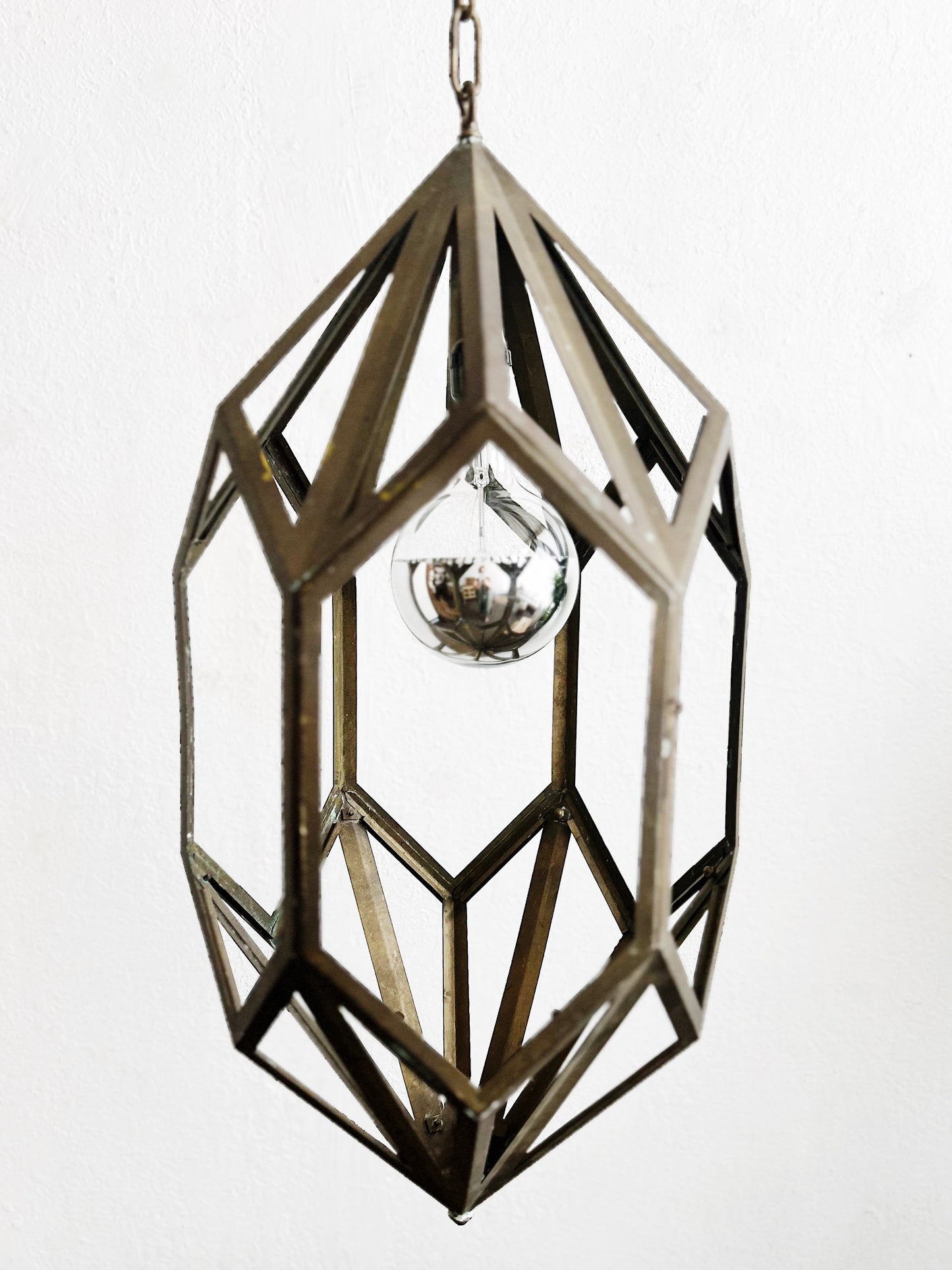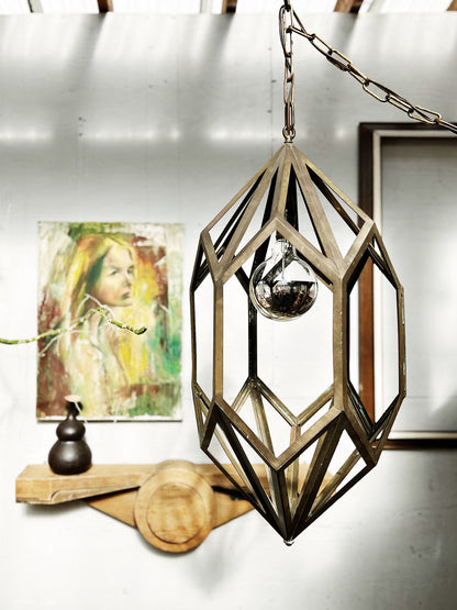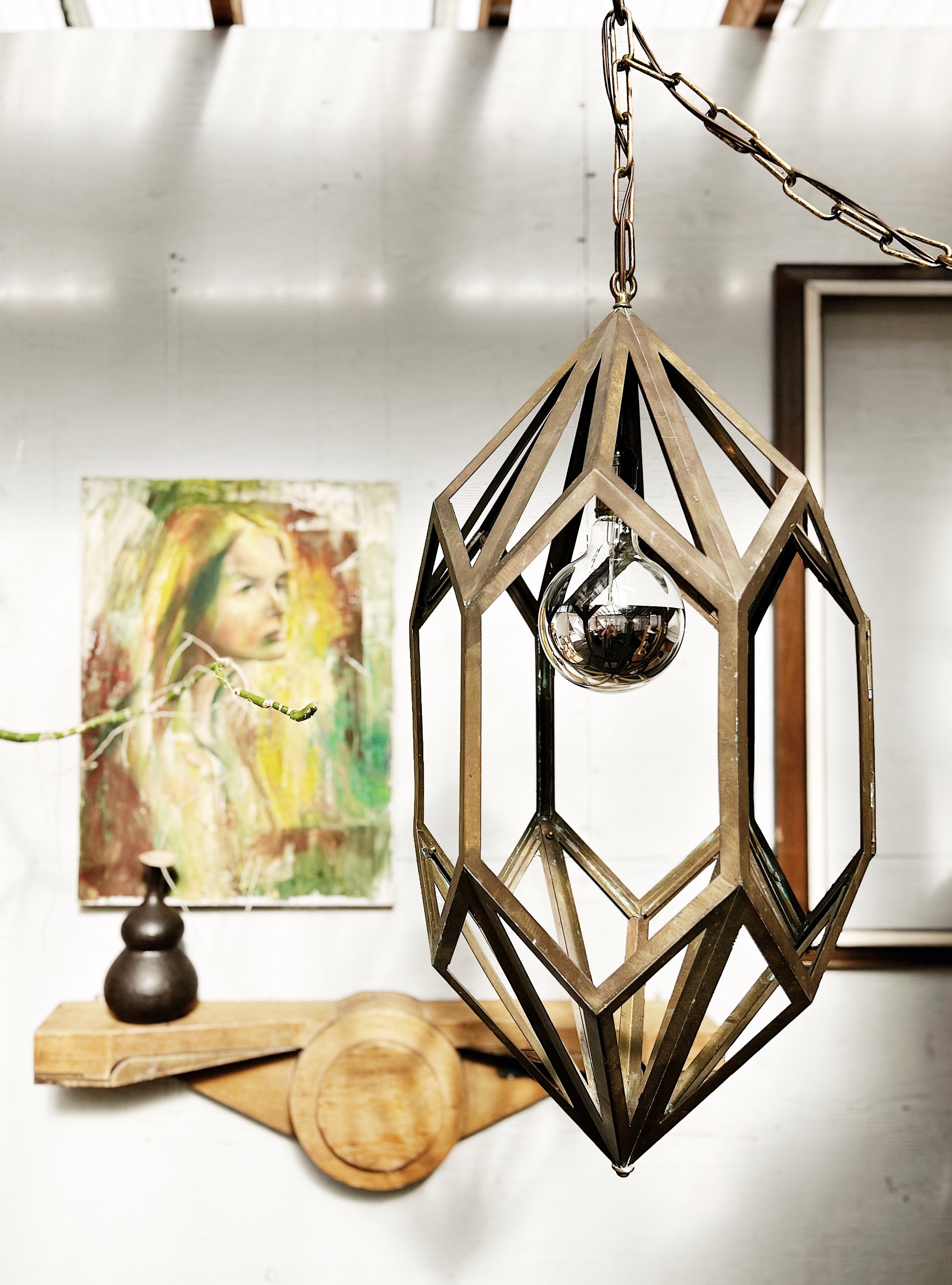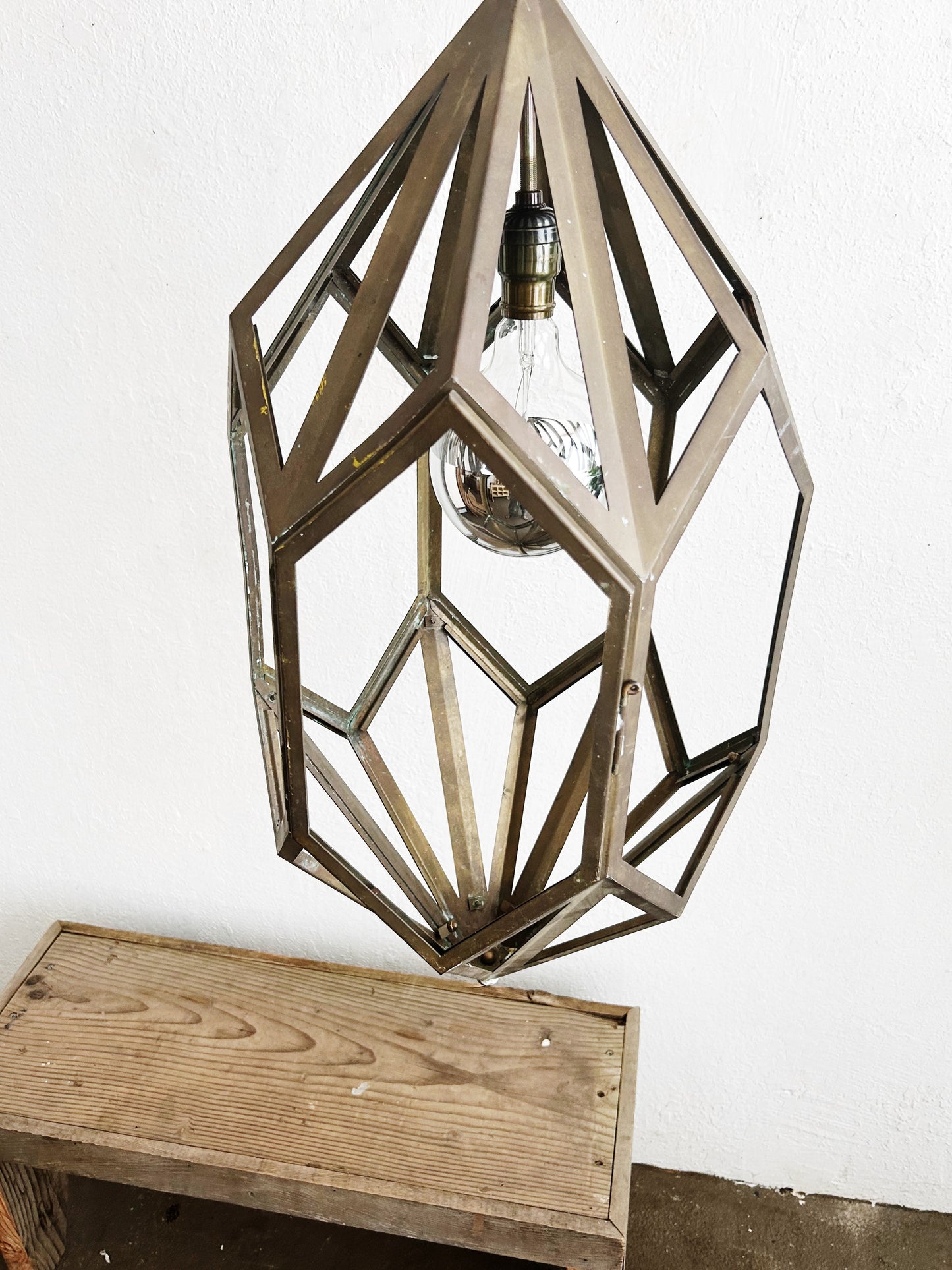 Extra large tin lantern skeleton has been electrified to cast the best shadows. Hangs from an old brass chain. Plug end. Plenty of cord to swag this. We’d love it hanging from a big old tree in the garden but you do you.