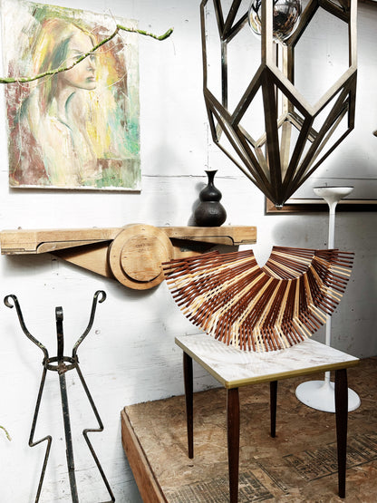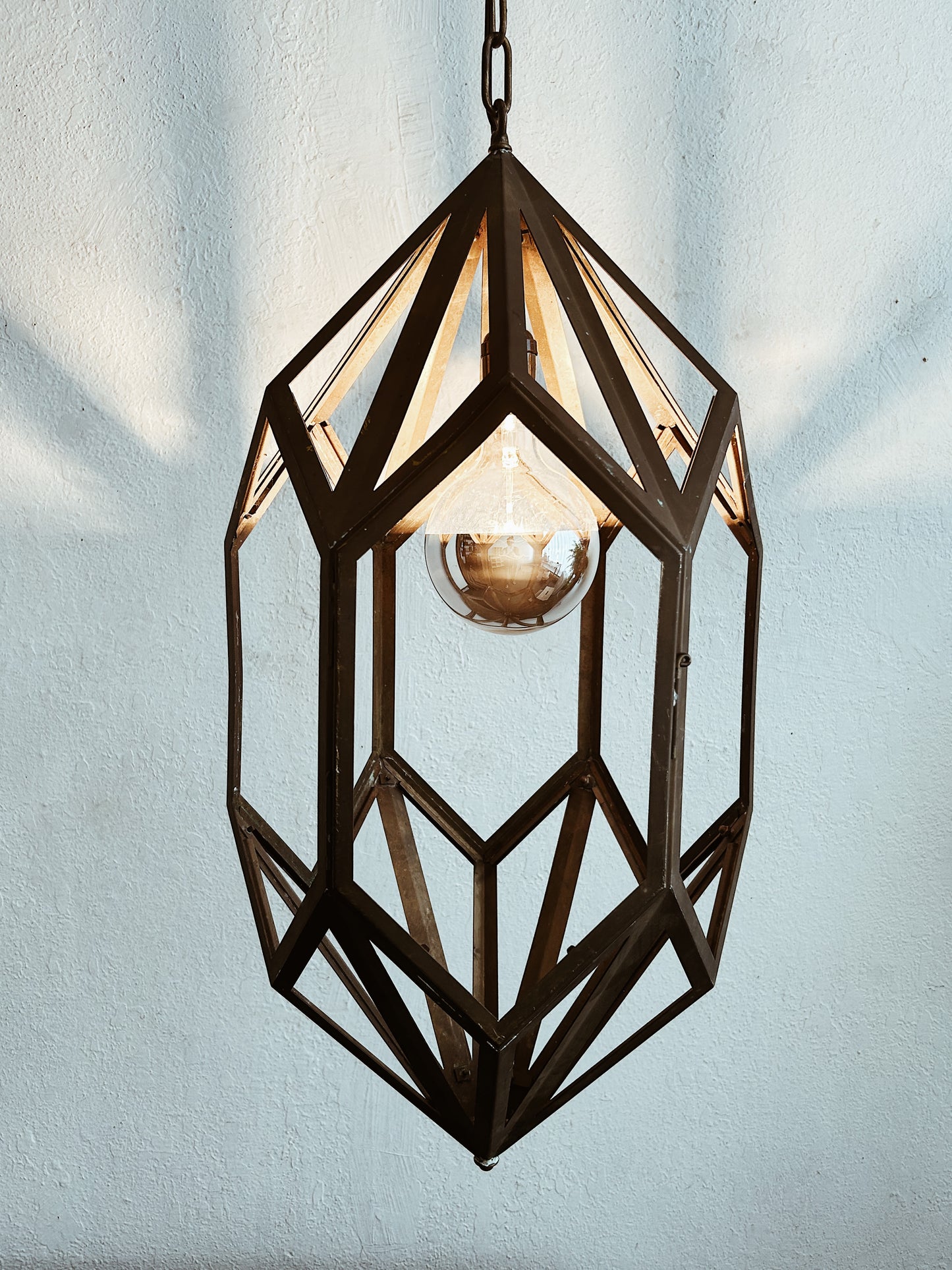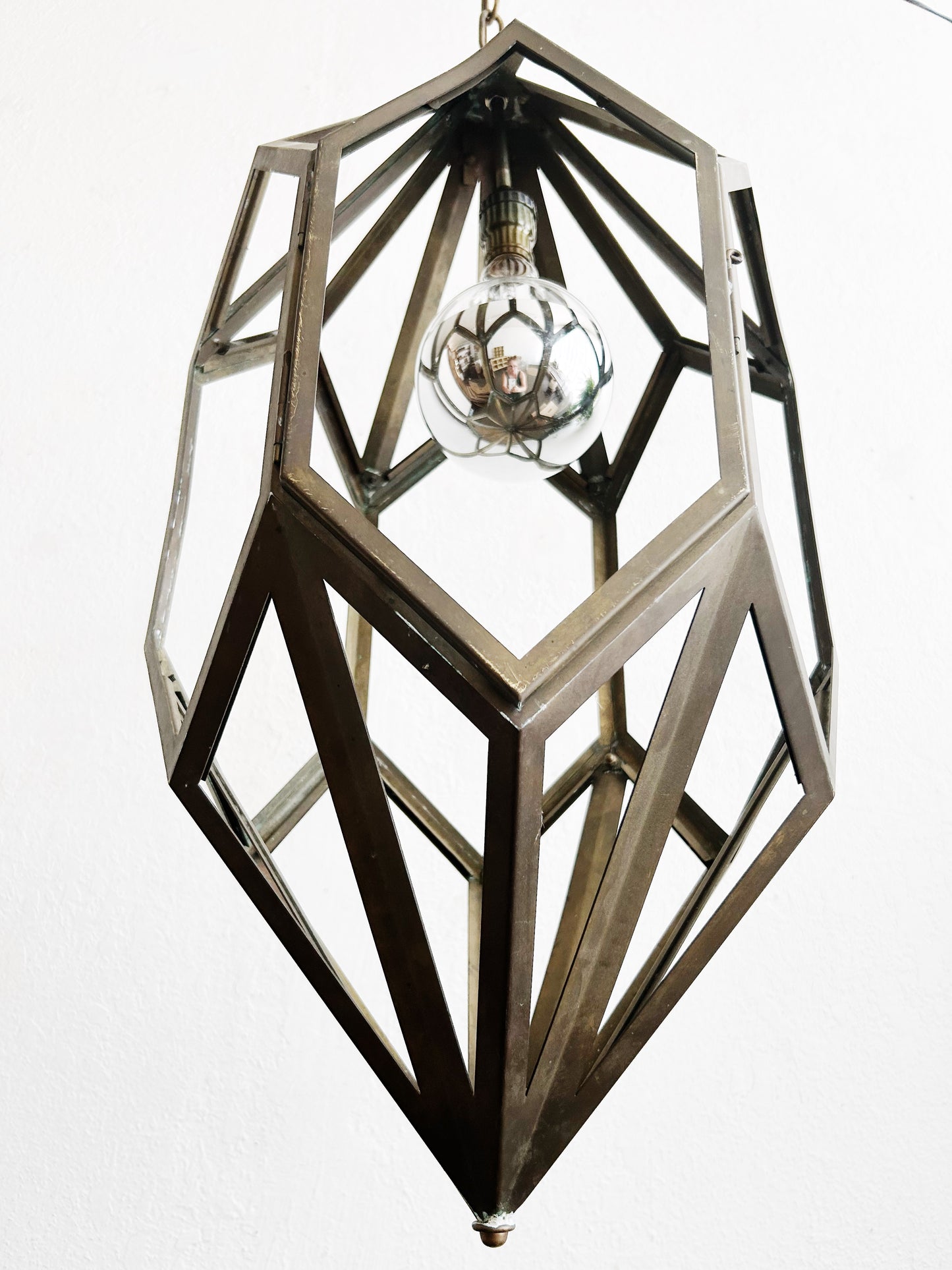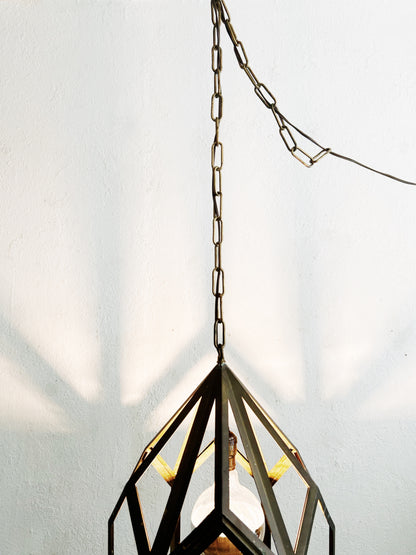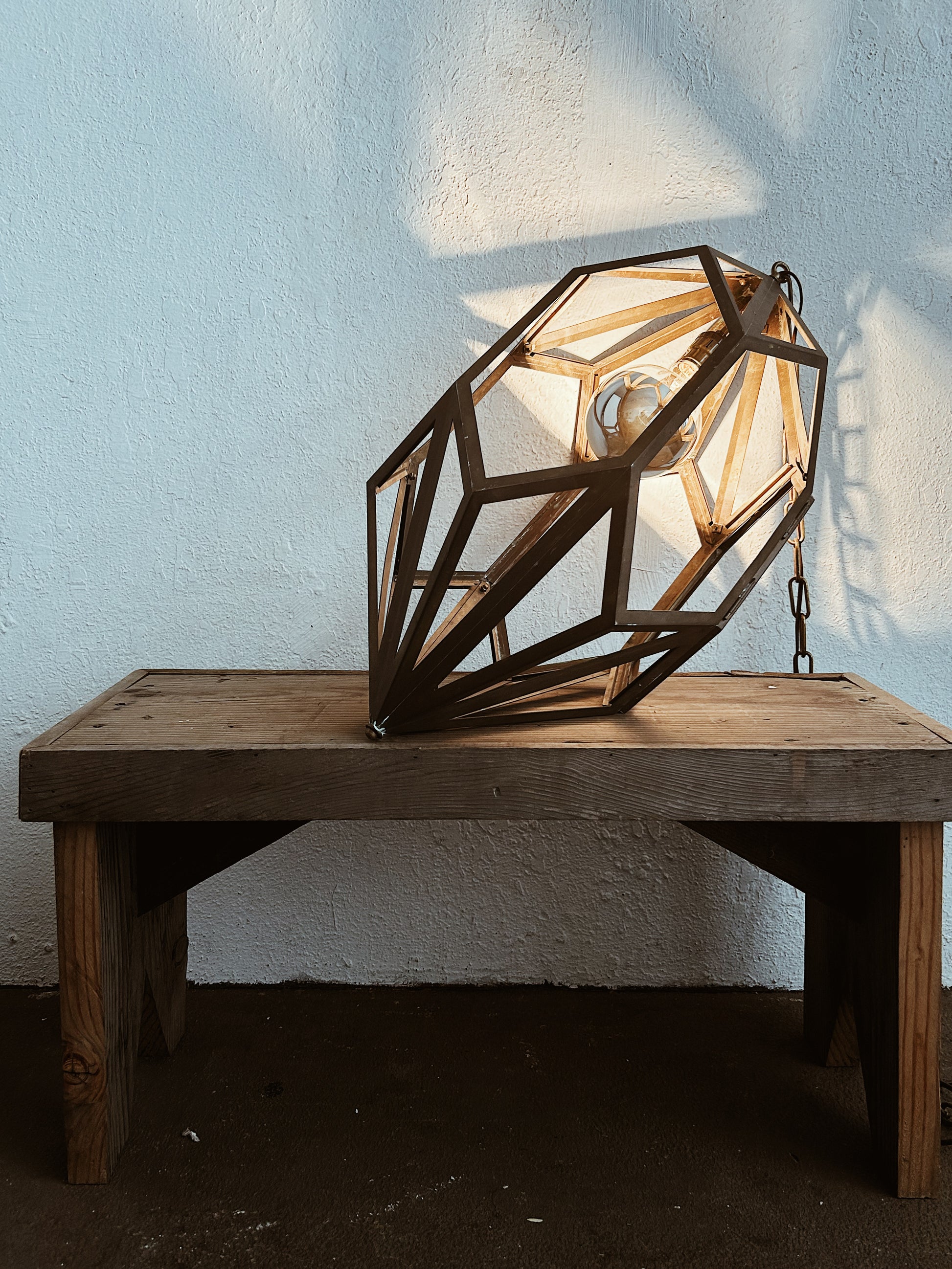 Extra large tin lantern skeleton has been electrified to cast the best shadows. Hangs from an old brass chain. Plug end. Plenty of cord to swag this. We’d love it hanging from a big old tree in the garden but you do you.