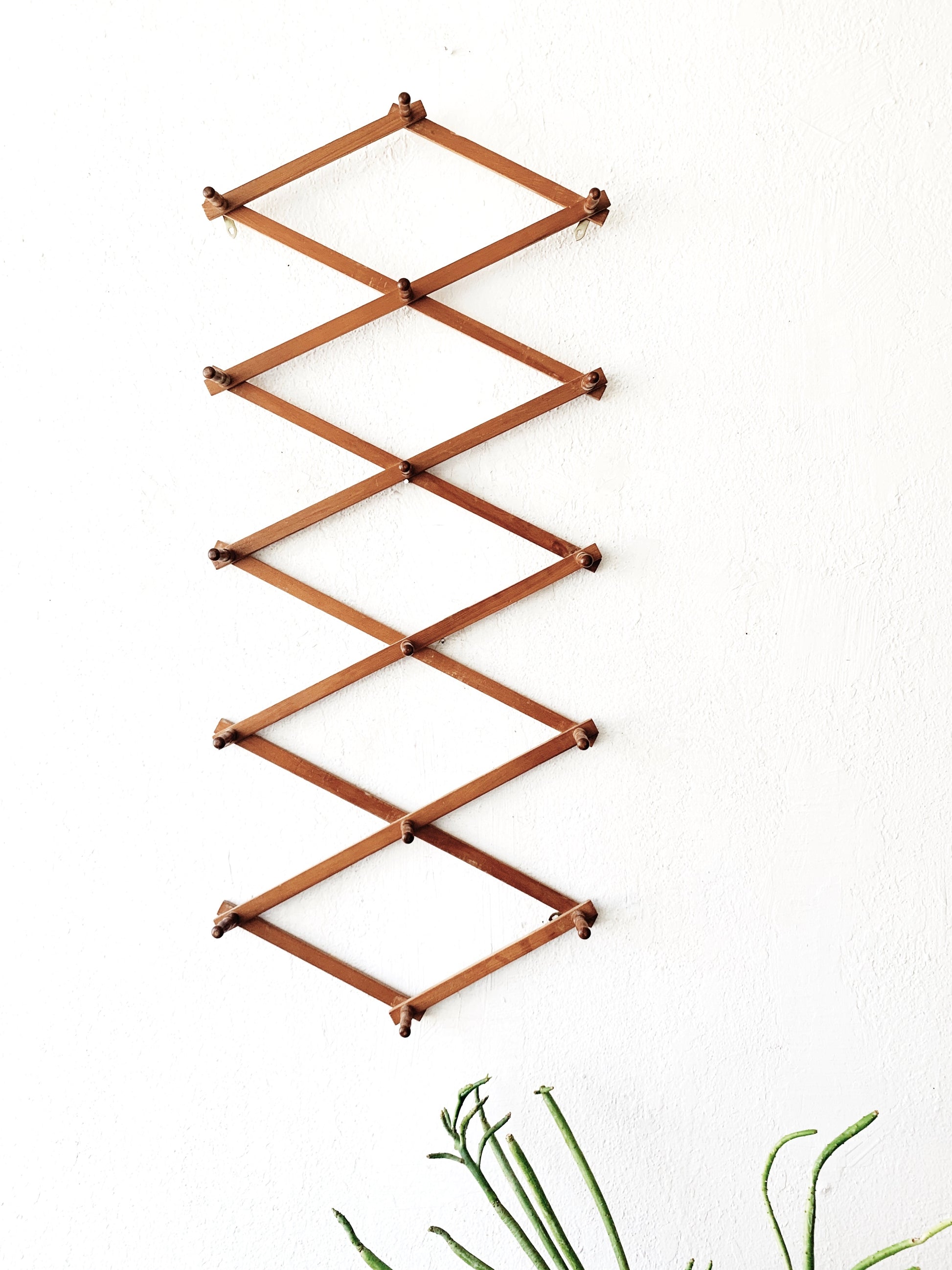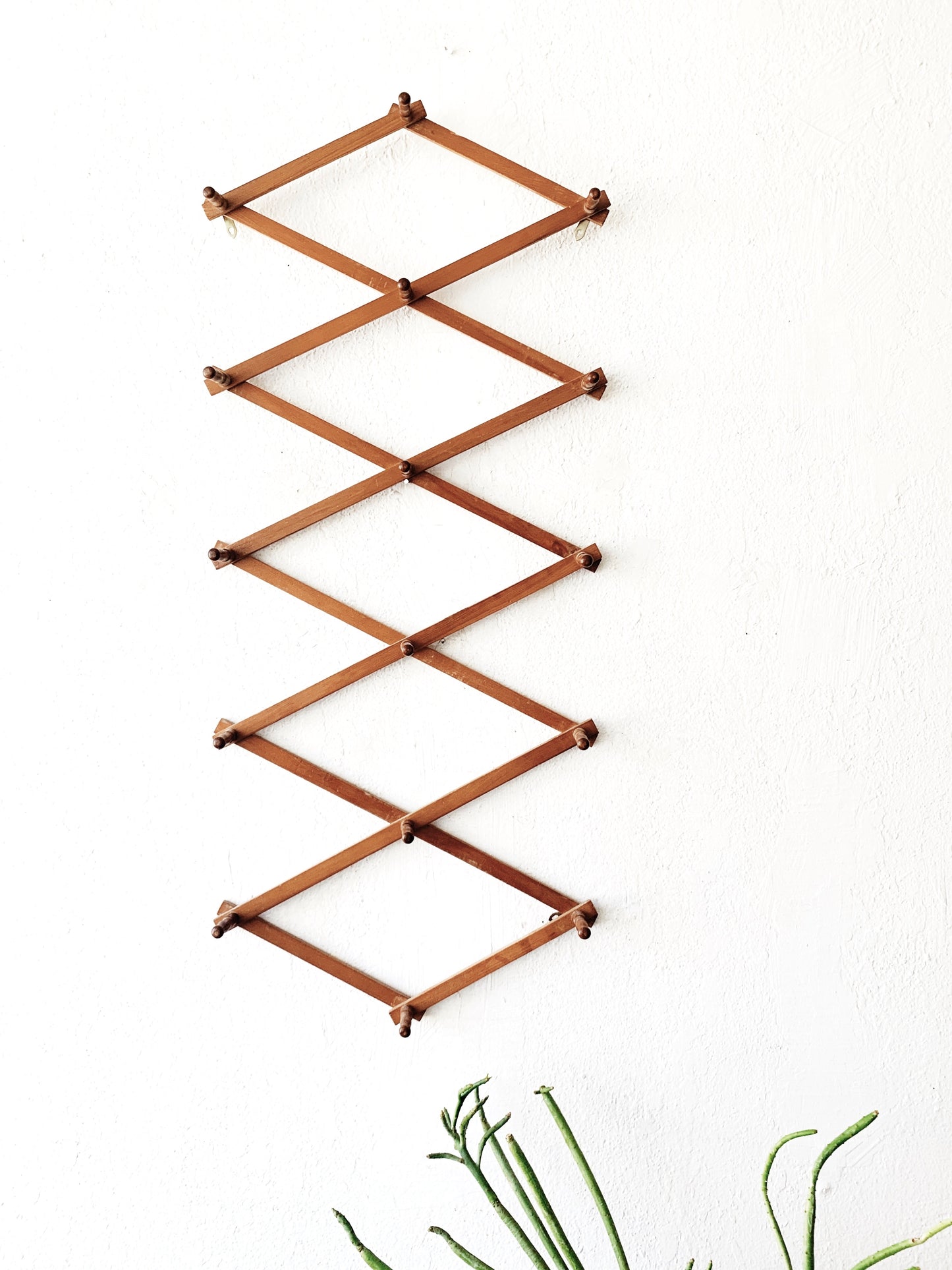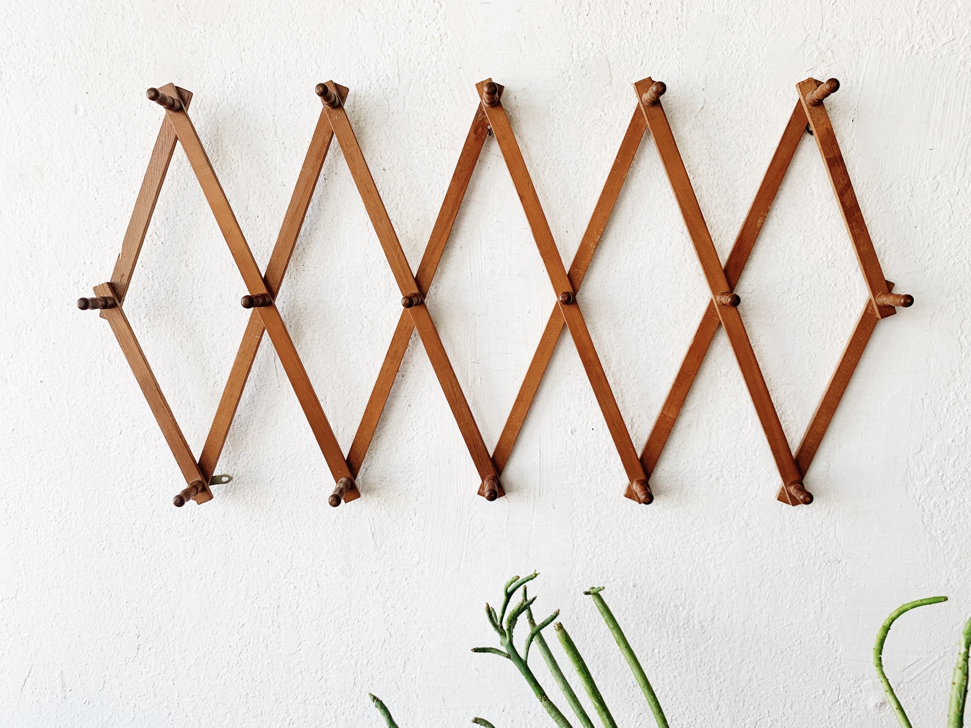 Nice large size peg rack that has brass hangers to orient it horizontally or vertically. Great condition, 16 pegs!