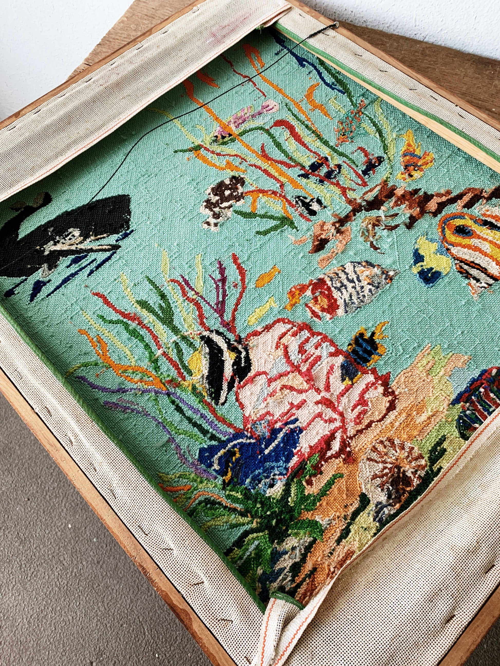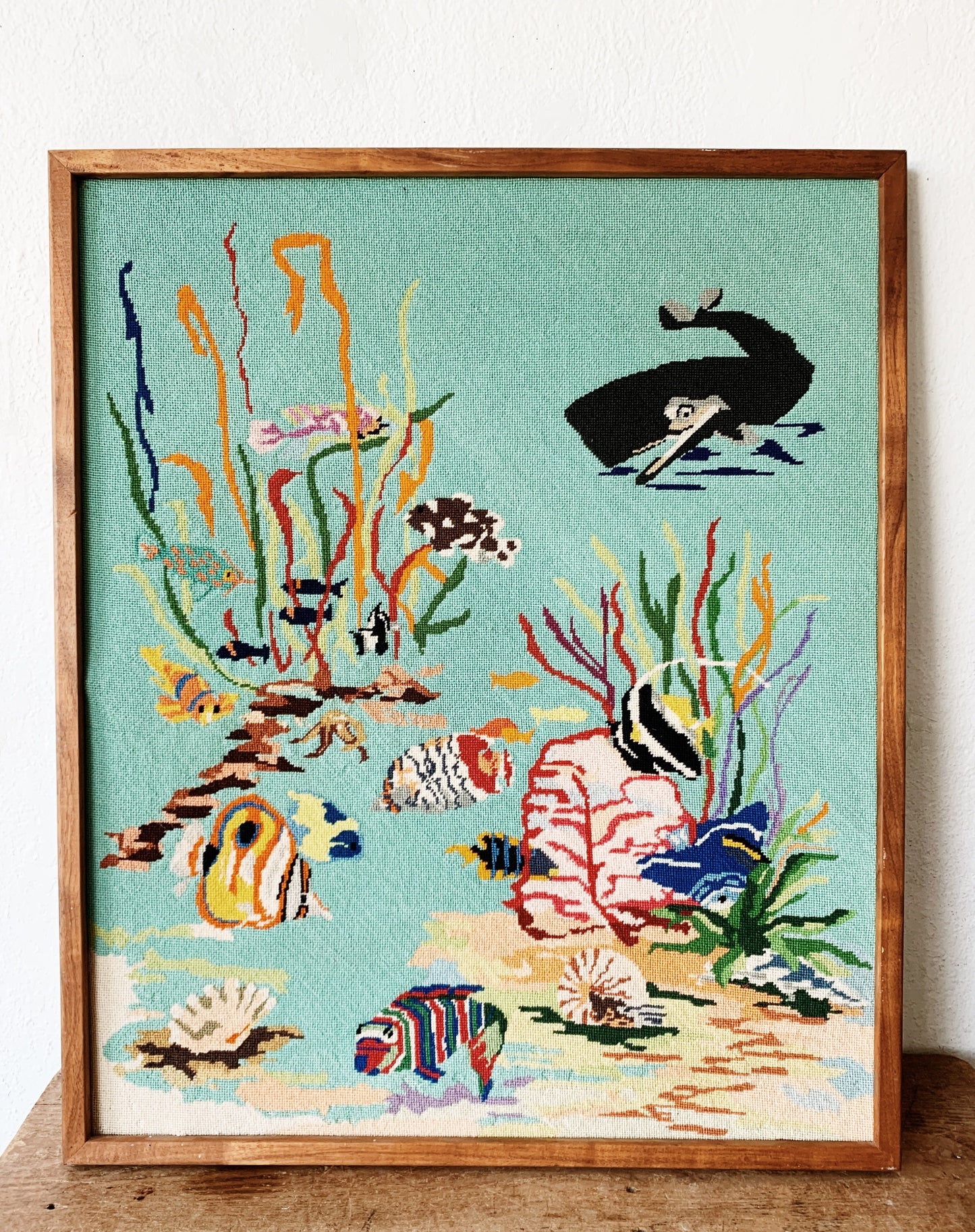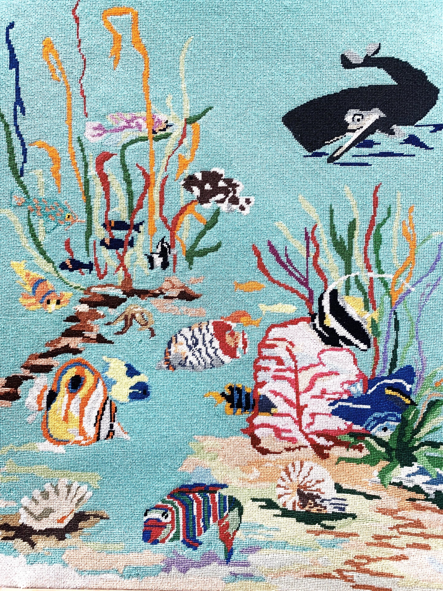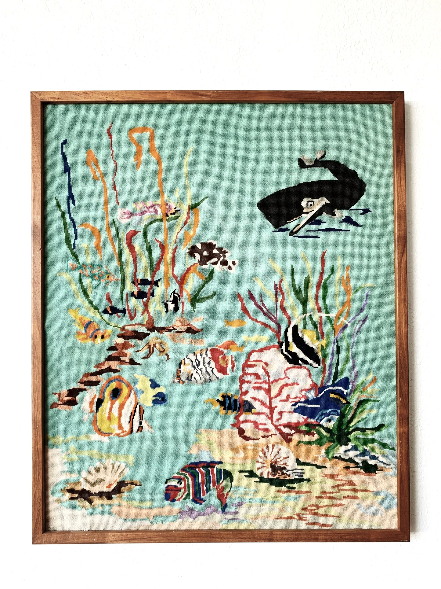 Incredible large sea life needlepoint framed in natural wood with wire hanger on back. Beautifully done! Such a fun piece.