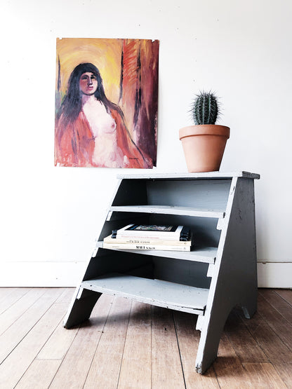 Fantastic old step ladder with pale grey blue painted wood. Very heavy and very sturdy! A nice alternative to a typical shelf unit. Quite large too!