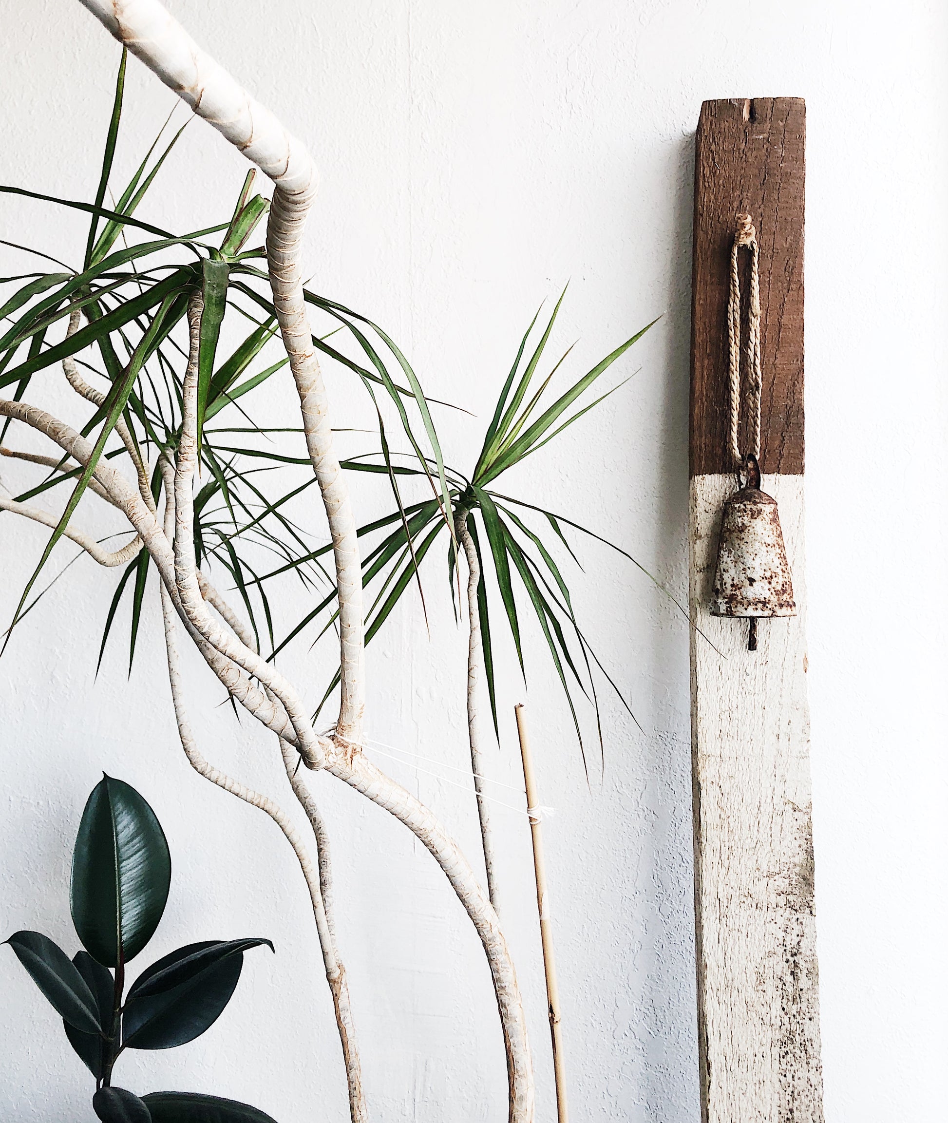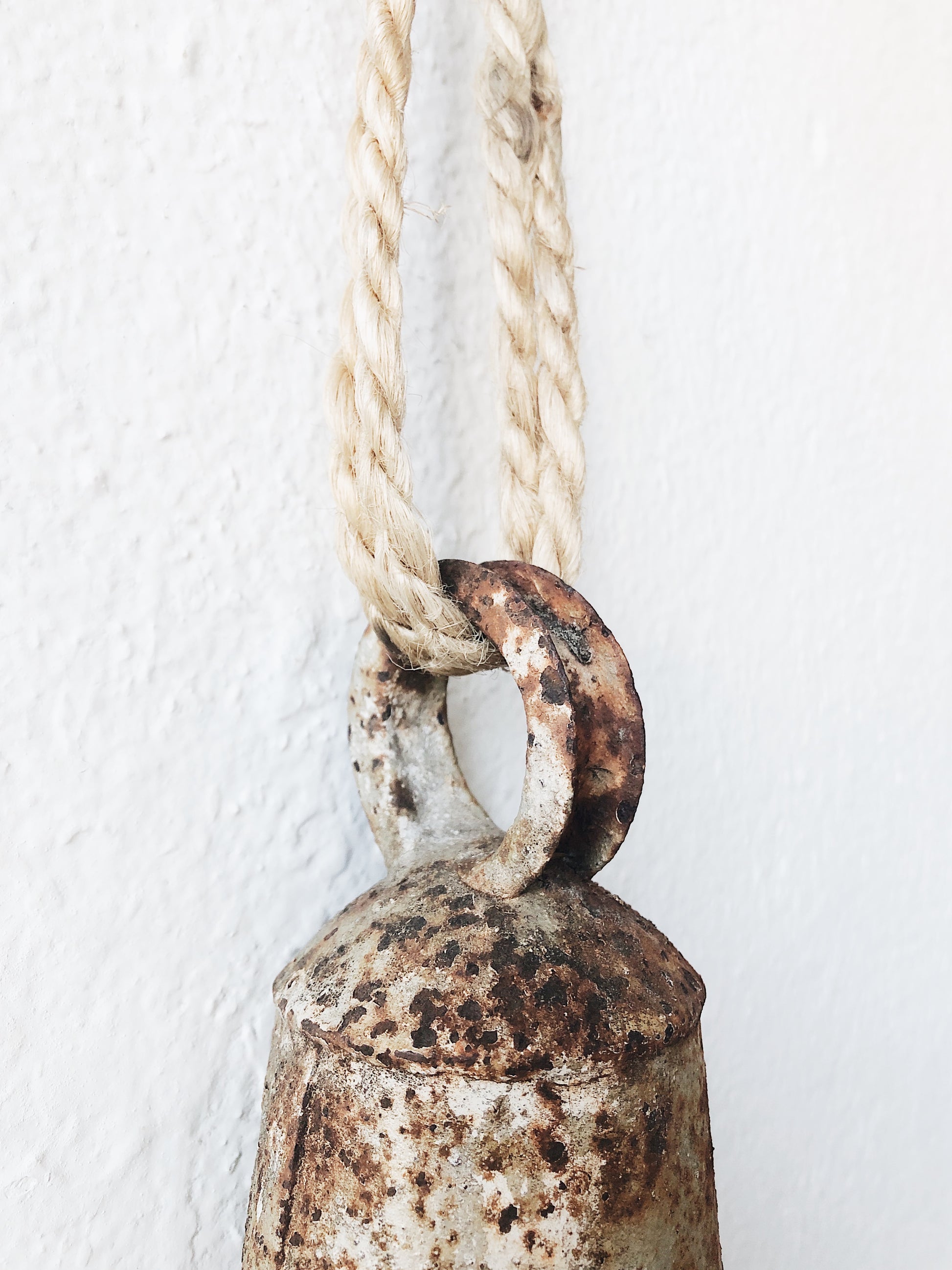 A large zinc bell with wonderful patina. Slim strike and a clanging chime. Hangs from worn rope. Great for the front porch