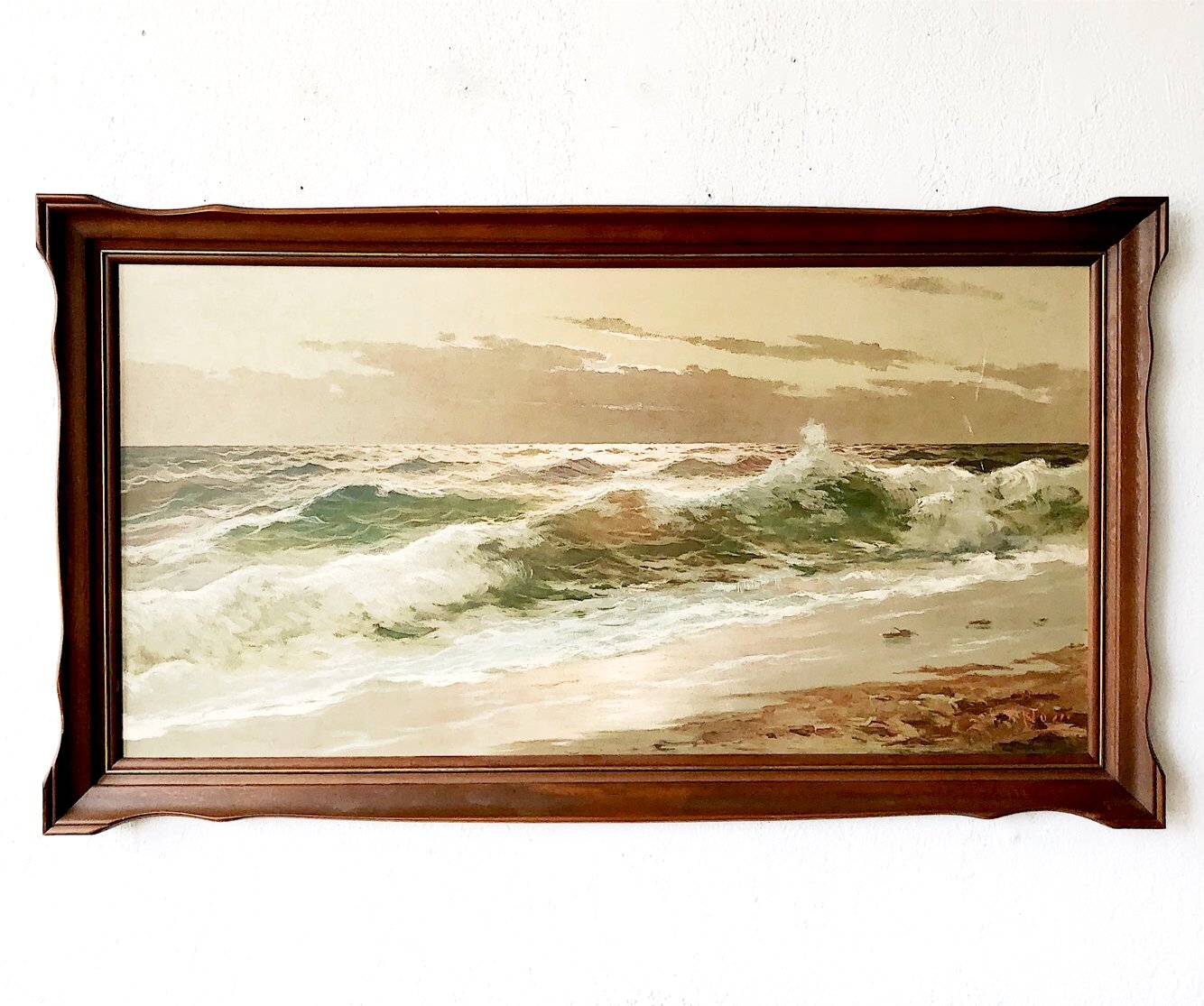 Pressed lithos came into their own in the 1930s-50s as an affordable way to obtain artwork. This large scale seascape retains the chiaroscuro of the original. Framed in nice scalloped wood