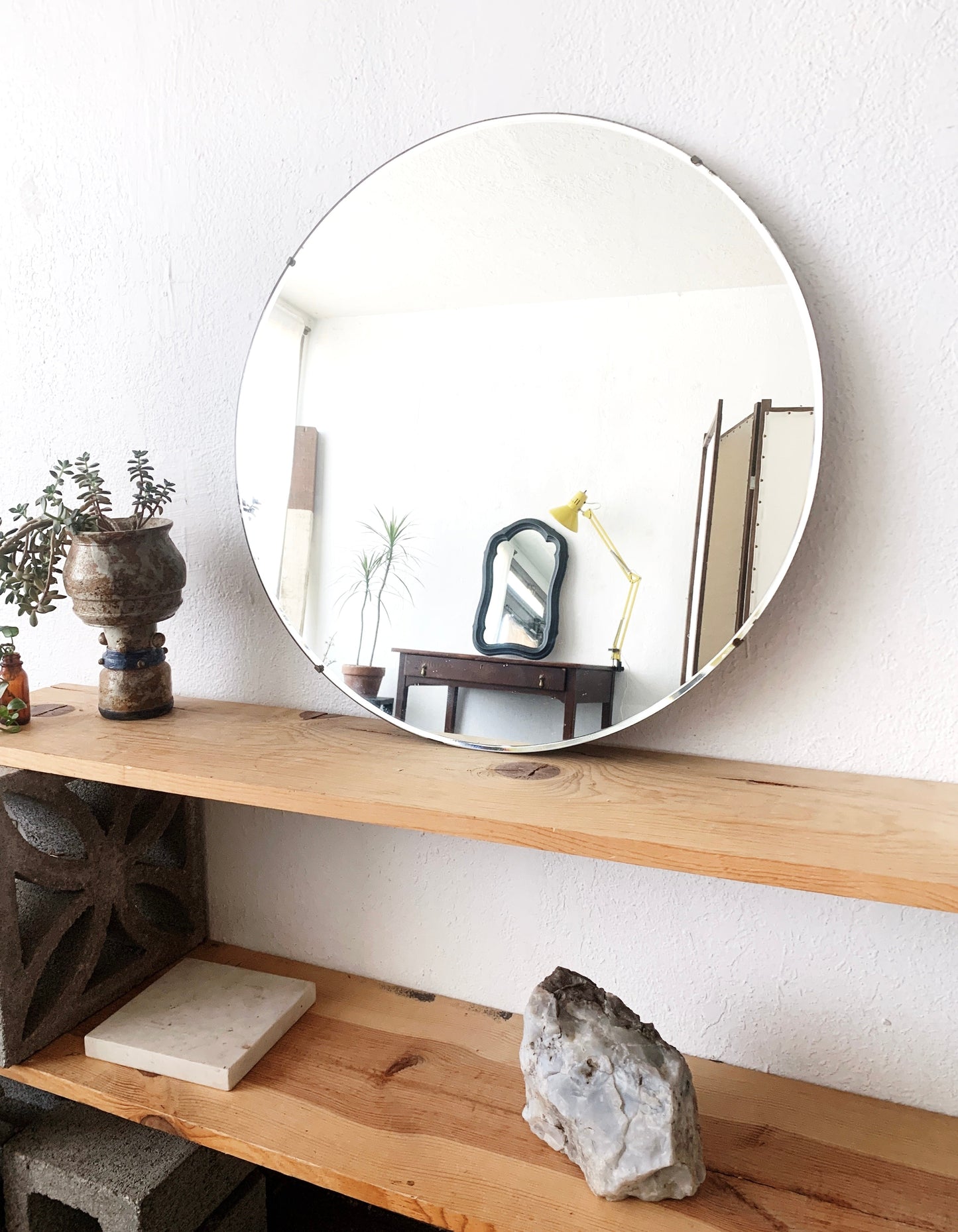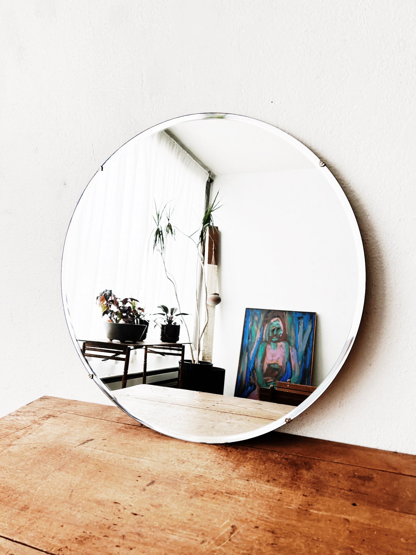 Vintage modern at its best. Nice round mirror with a clean edged bevel and industrial clips. Hanger on the wooden back