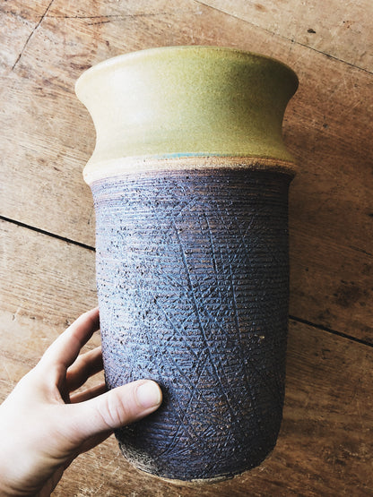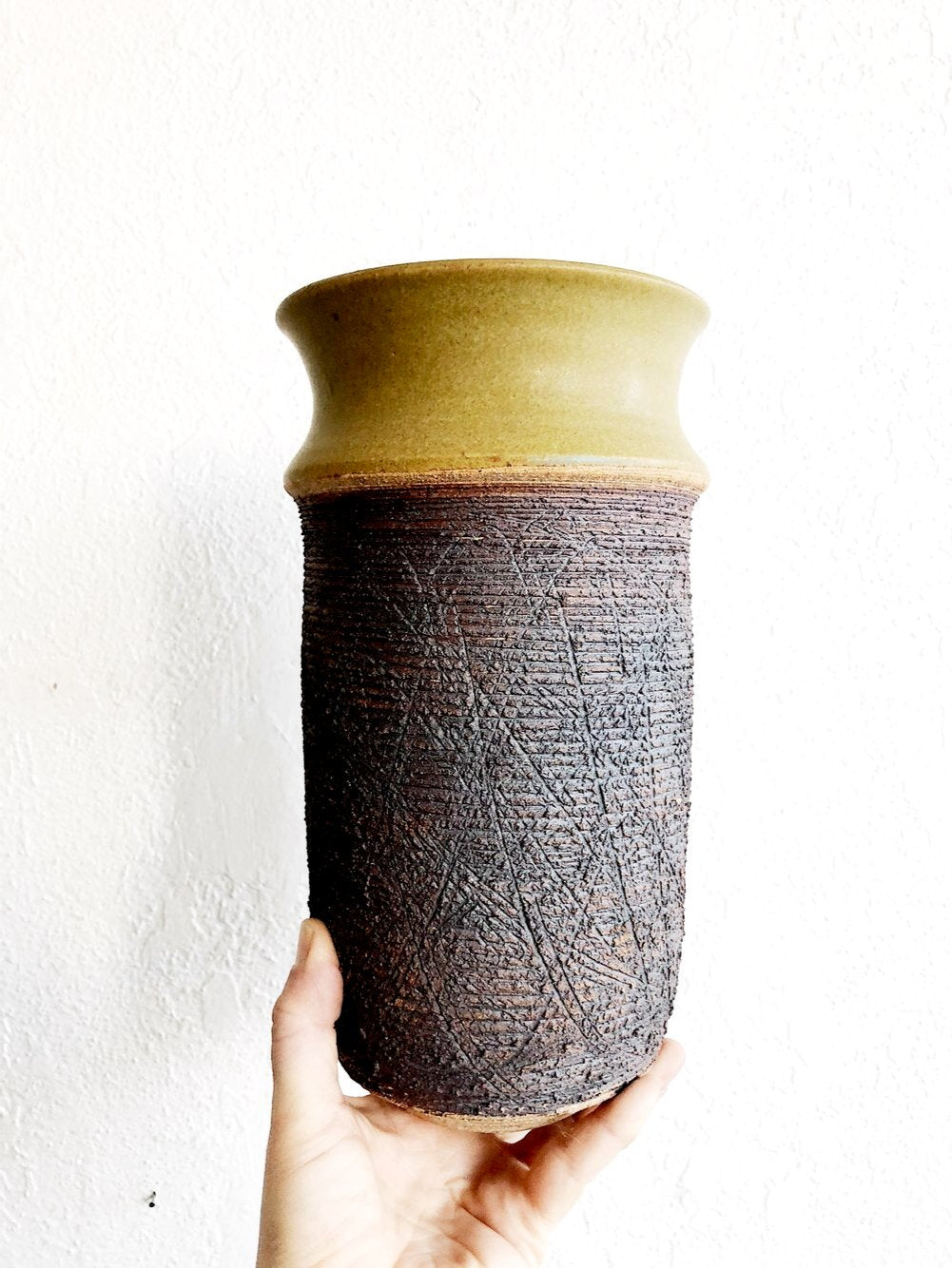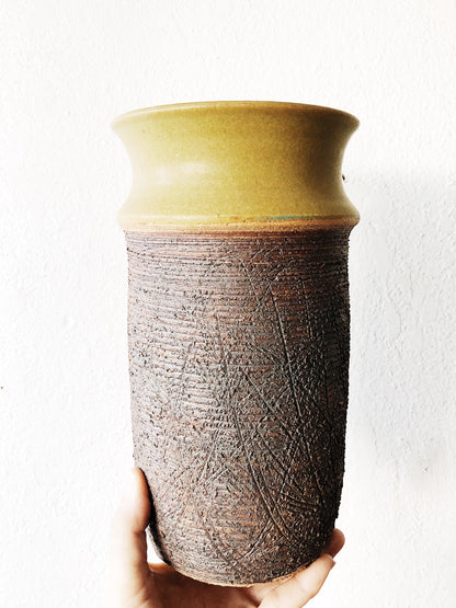 A nicely sized vintage pottery vase with fab colors, mustardy chartreuse and earthy brown. Matte and unglazed finishes. Picturing tall stems of dill weed and summer grasses in this one