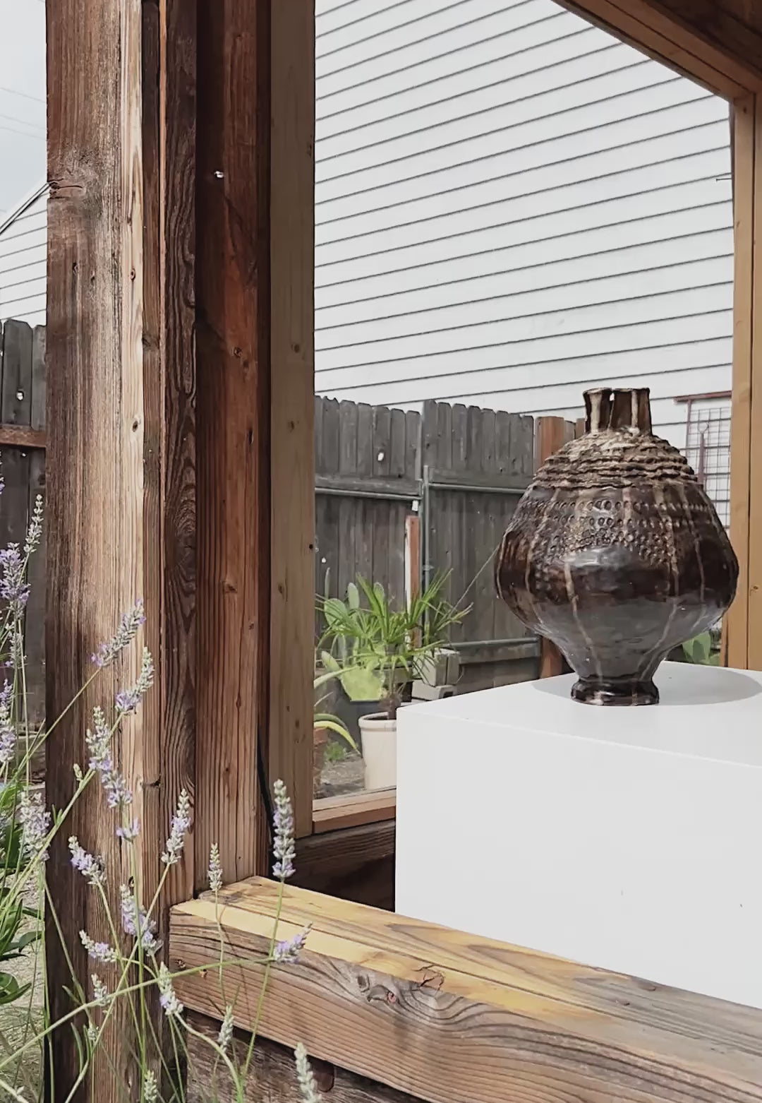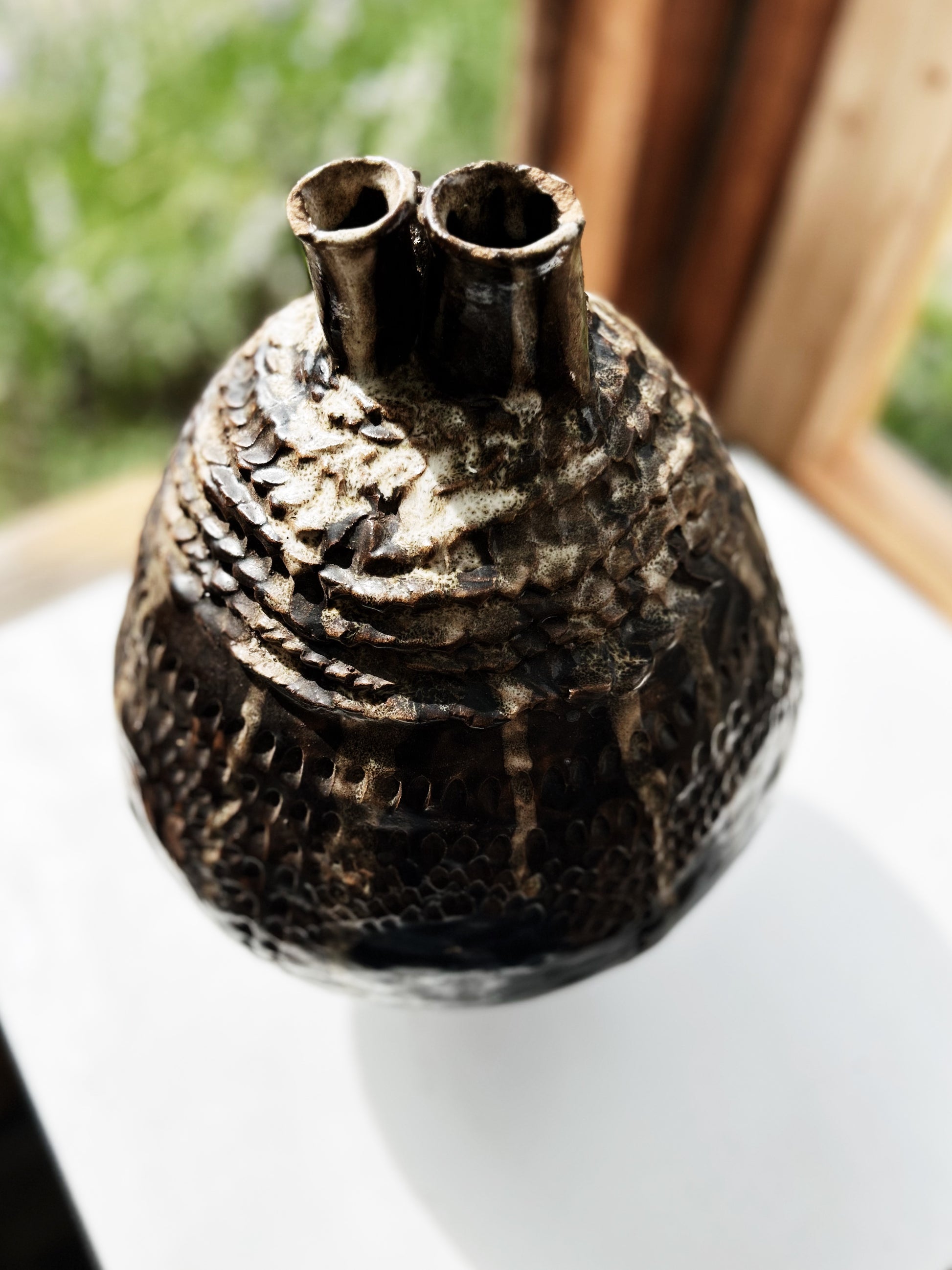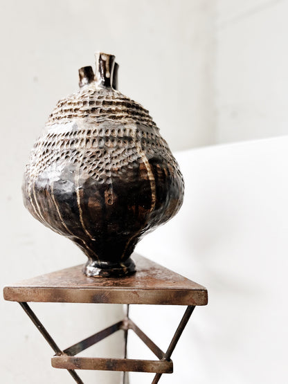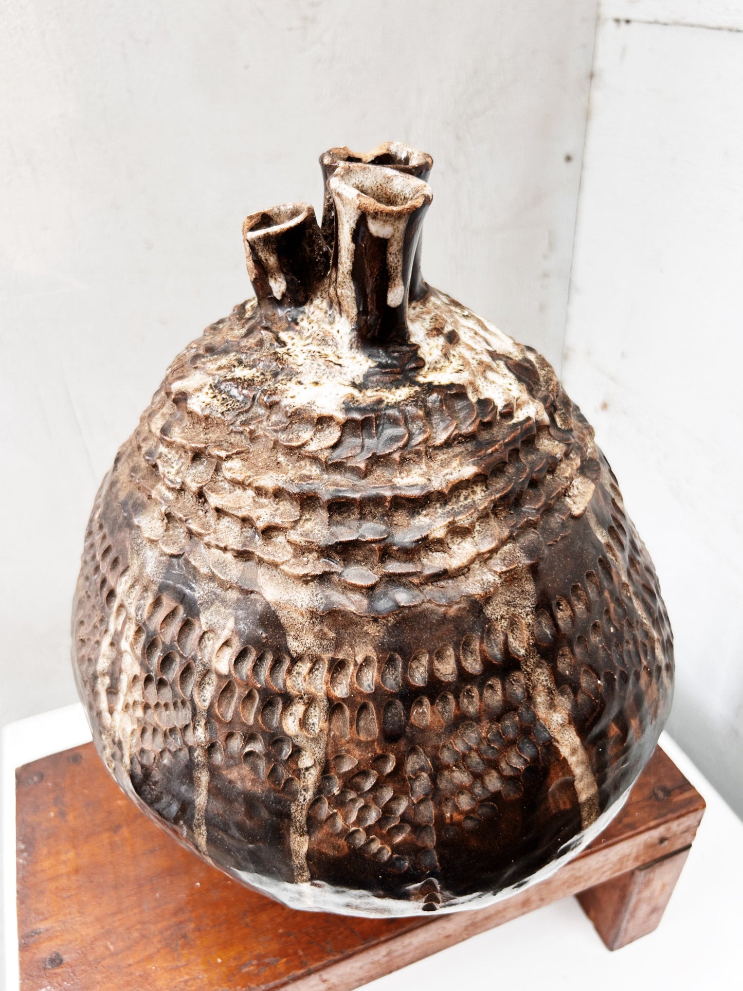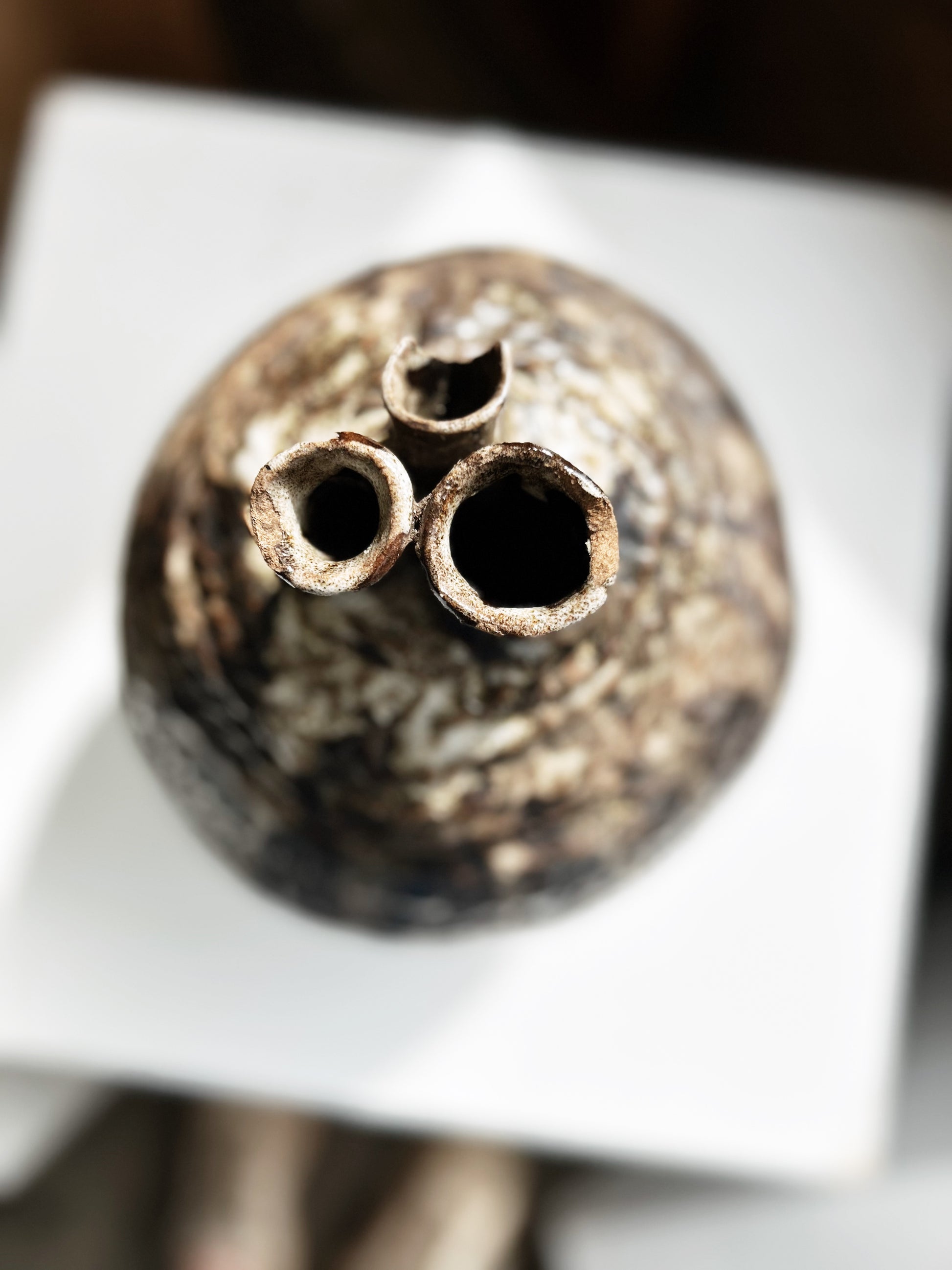Large hand built ceramic vessel. Three spouts for arranging stems. The rims have some old chipping. This doesn't bother us. Really lovely piece