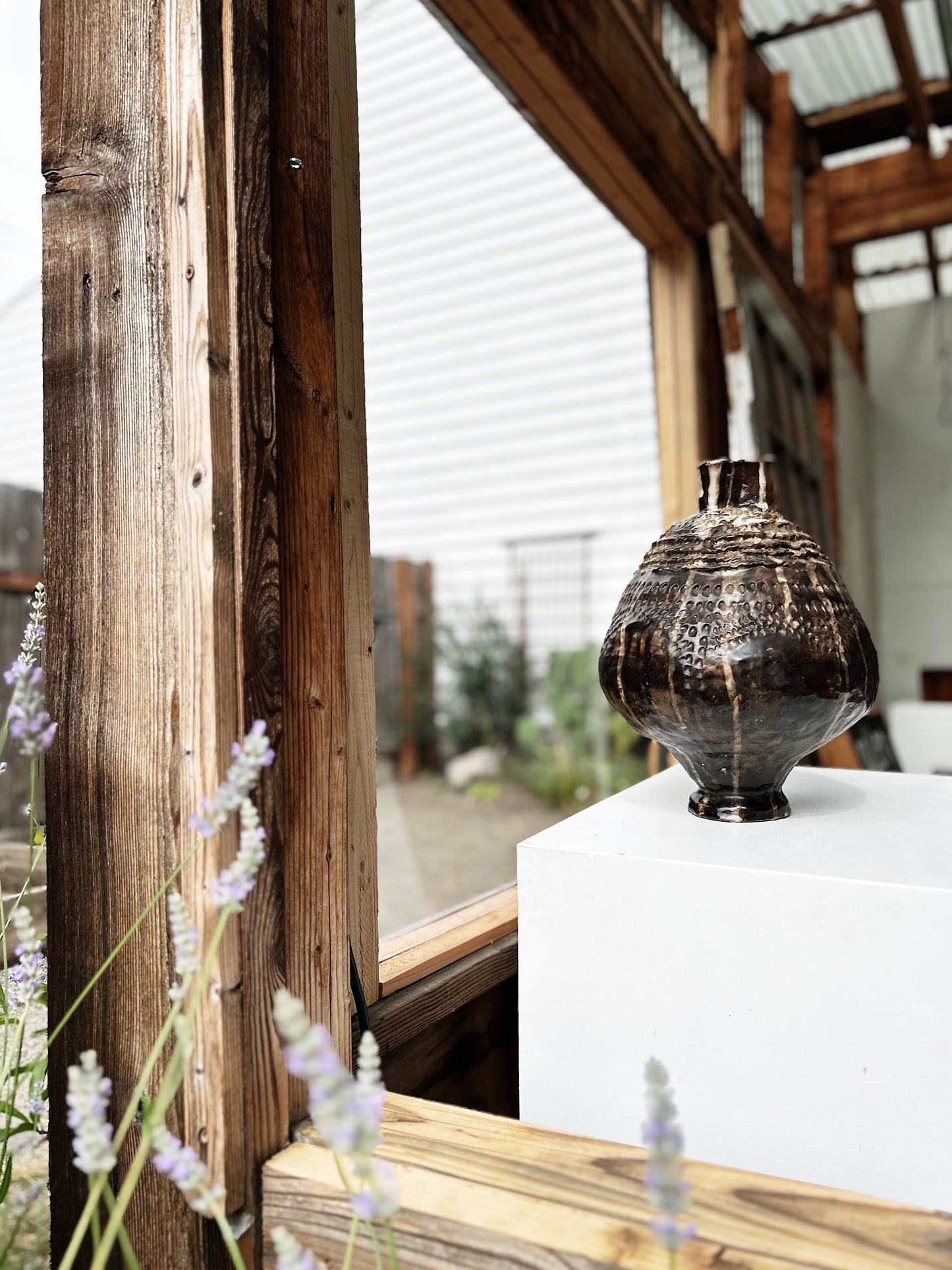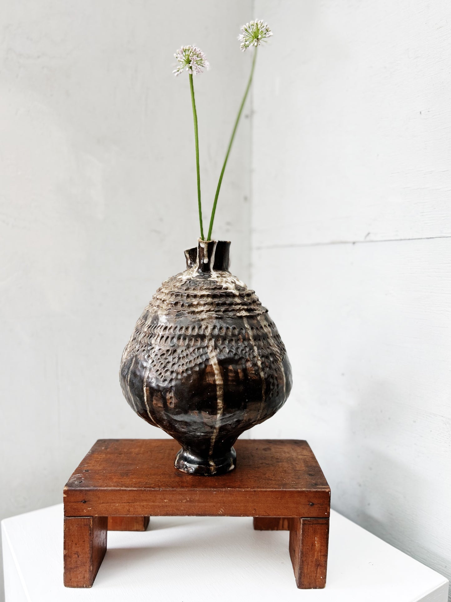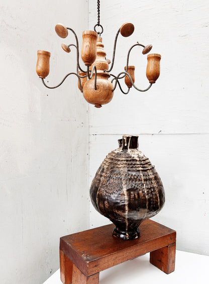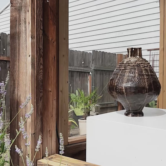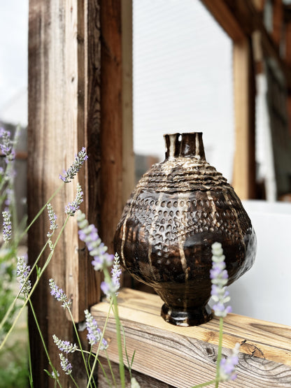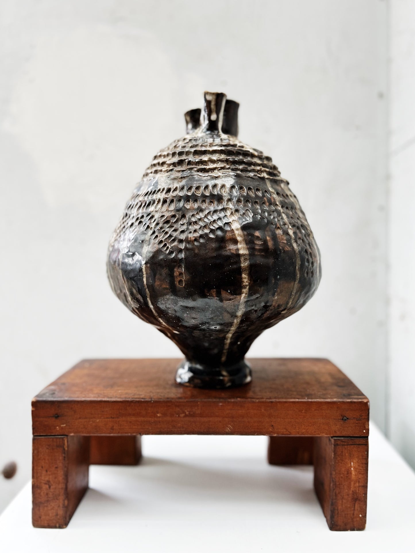 Large hand built ceramic vessel. Three spouts for arranging stems. The rims have some old chipping. This doesn't bother us. Really lovely piece