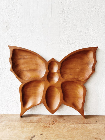 Love very divided teak butterfly dish in a larger size that’s great for jewelry or other small catchalls. Can also be used as a dried snack tray.
