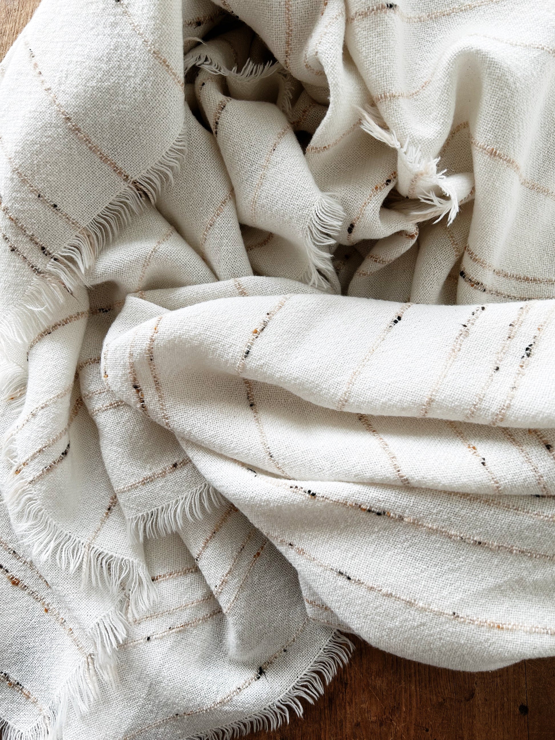 Really pretty vintage table cloth in creamy white with nubby brown stripes. Washable, soft acrylic blend in nice condition with no noticeable stains or other flaws.