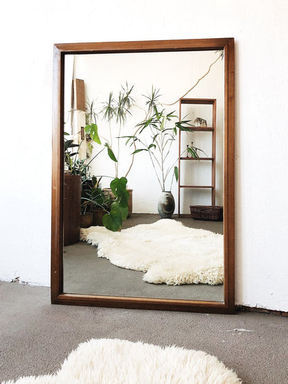 Beautiful walnut wood framed mirror in a larger size. Simple and pretty. Vintage from the mid century. Great for over a mantle or bedroom dresser, entry area. Lovely in either direction