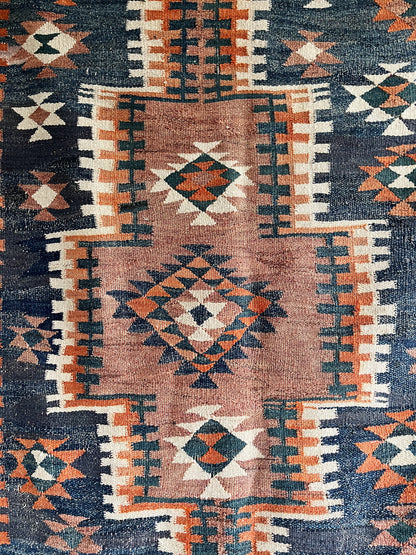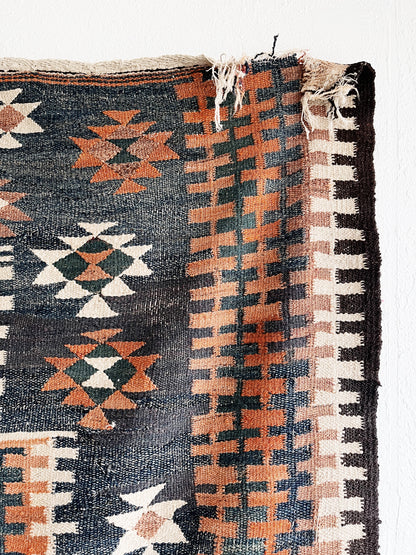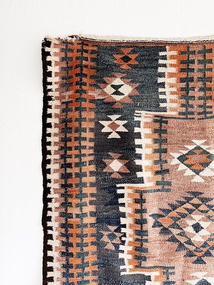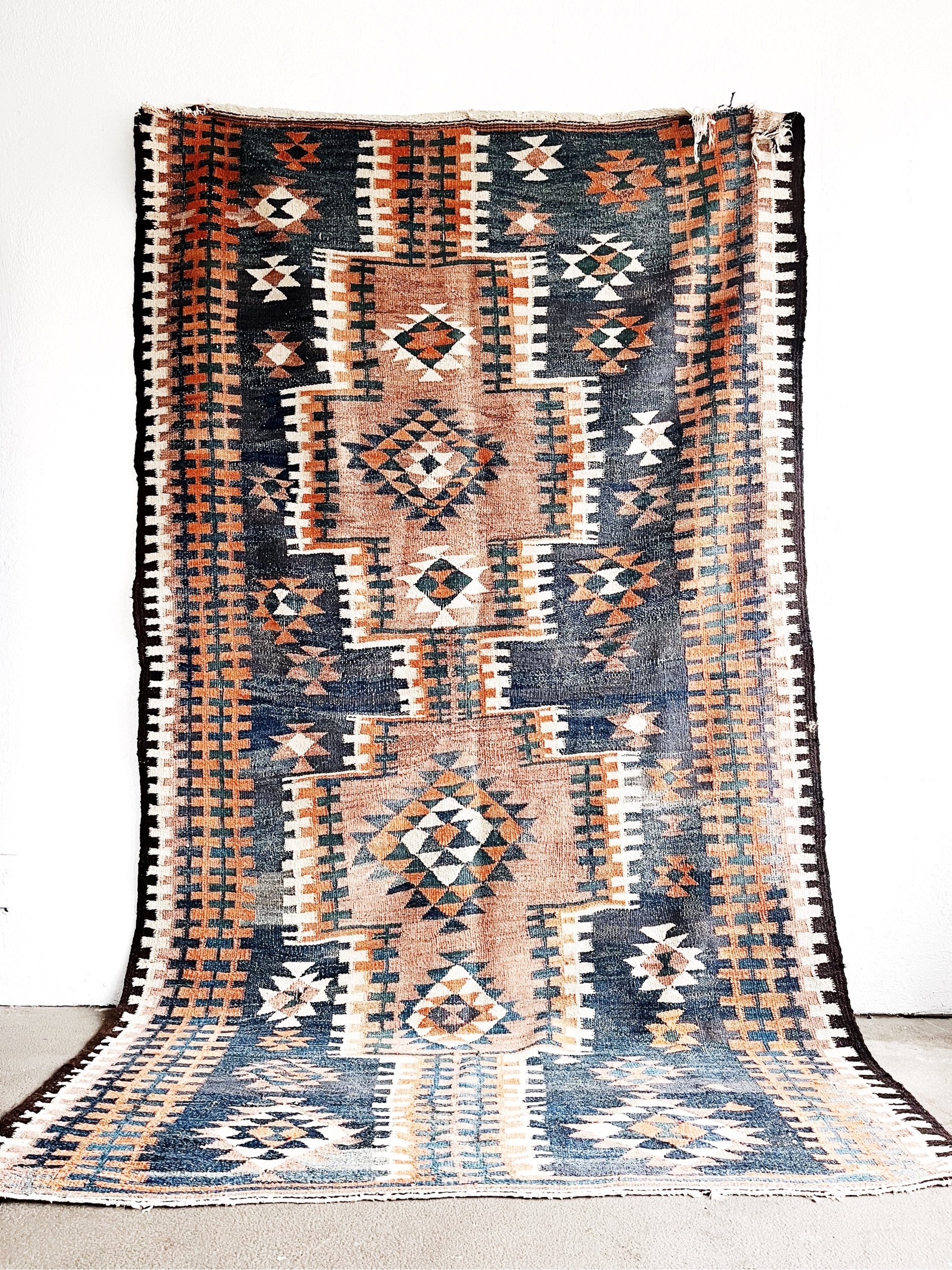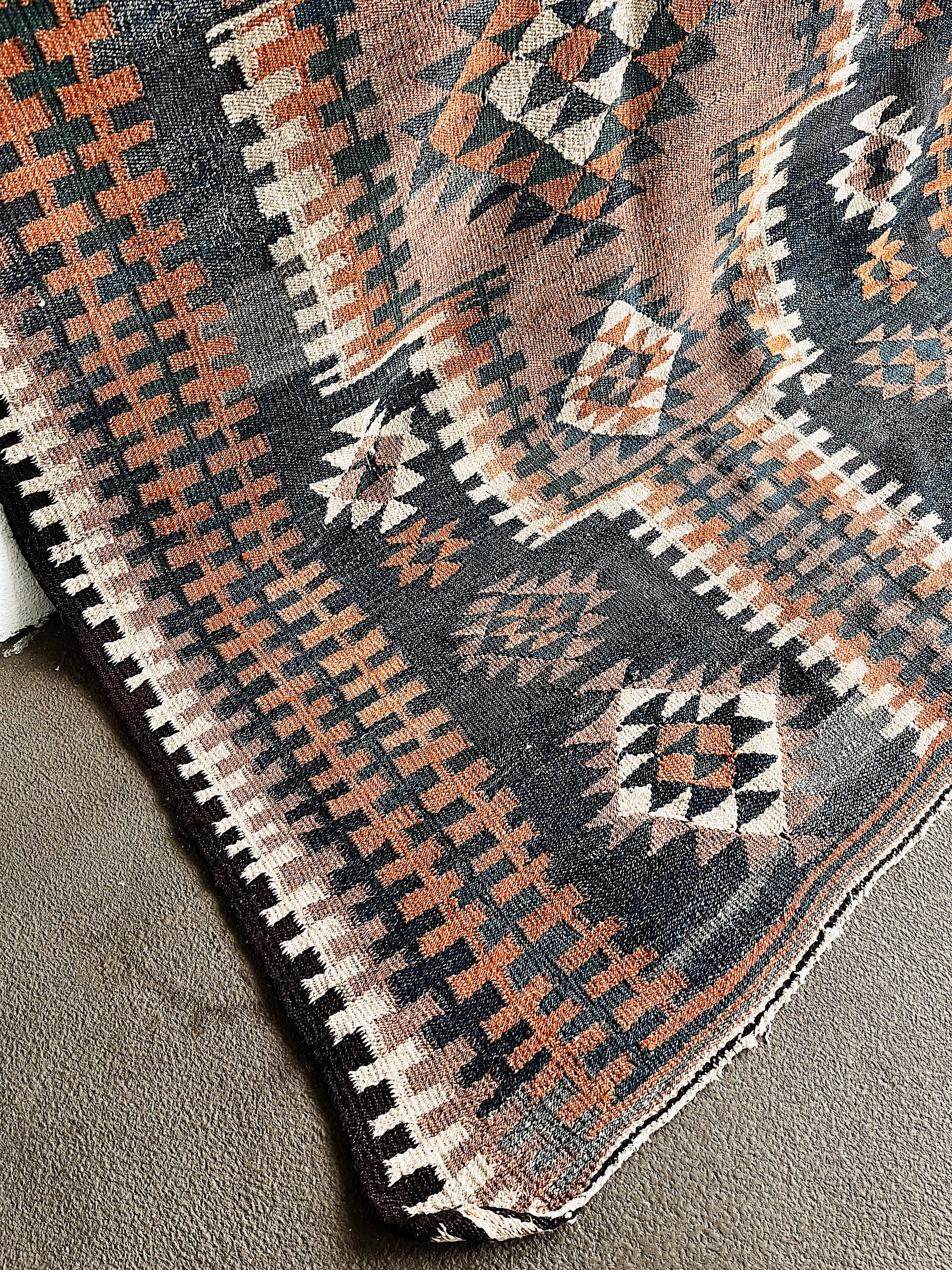 Amazing patterning and colors. Flat weave woven wool. Slightly rough but not scratchy. Weighty. Looks like the original weaver put two smaller rugs together. We love the slightly wonky piecing.