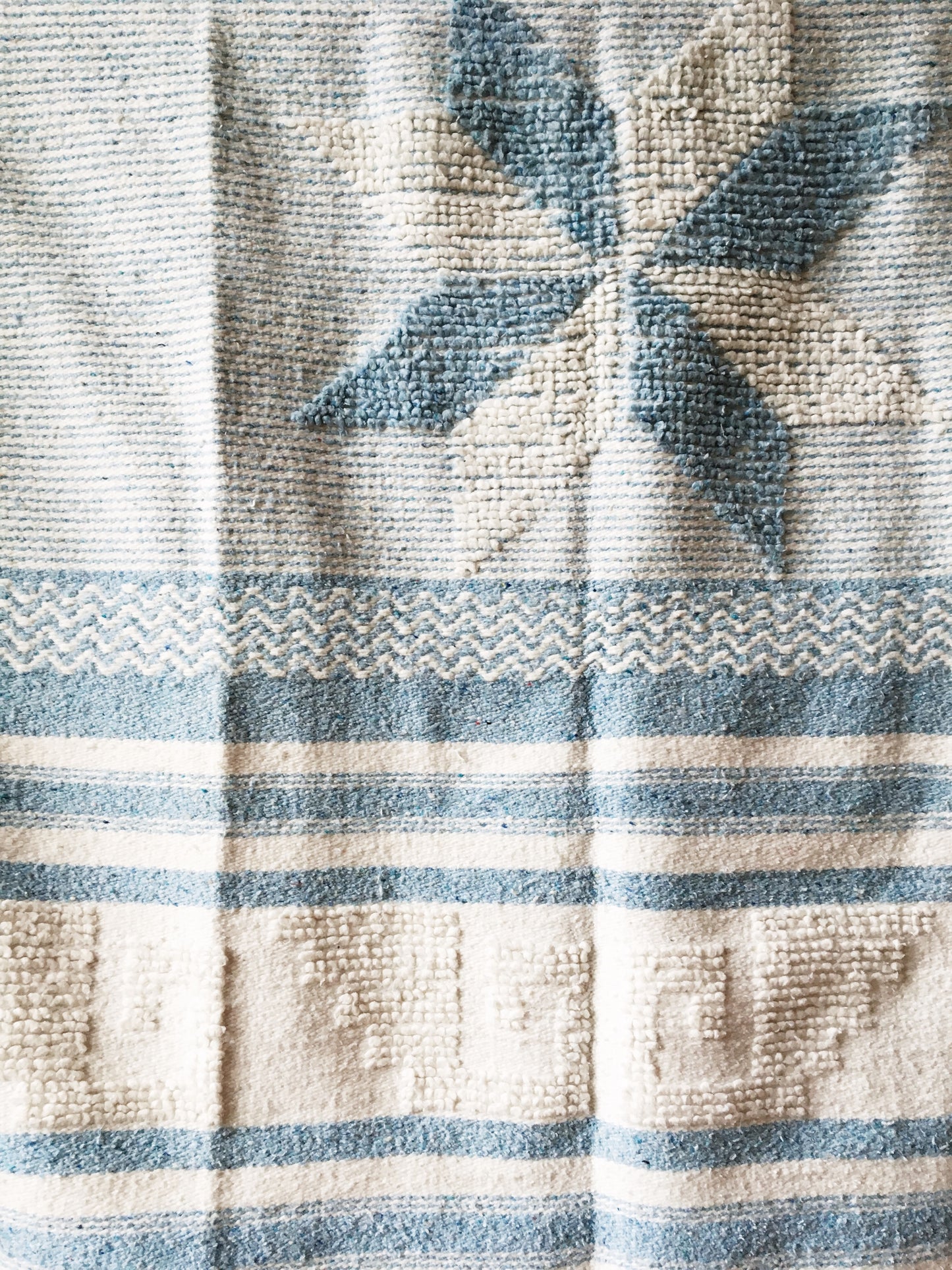 Large weighty cotton blend textile that could be used as a rug with a rug pad or at the end of the bed or as a couch cover.
