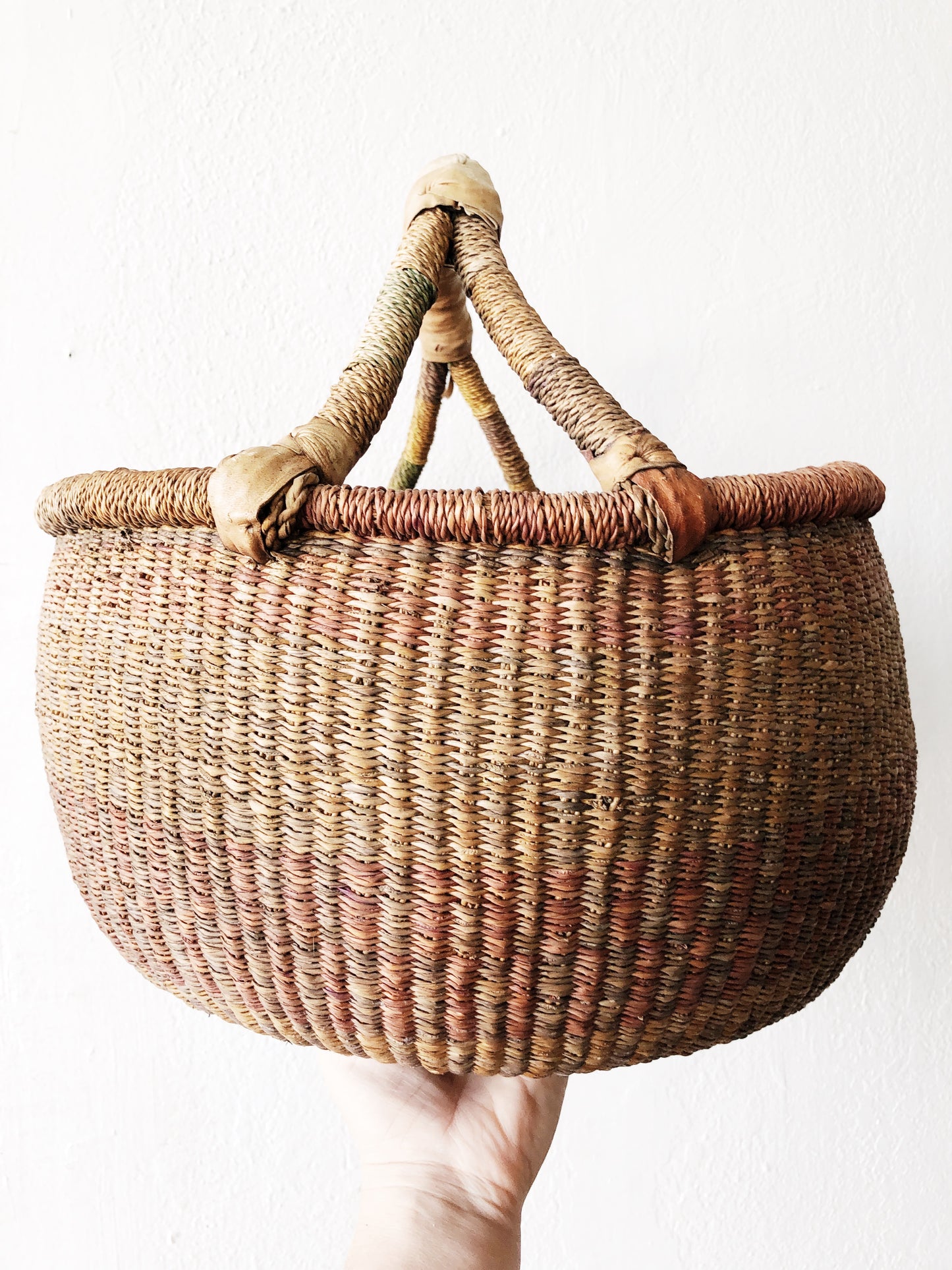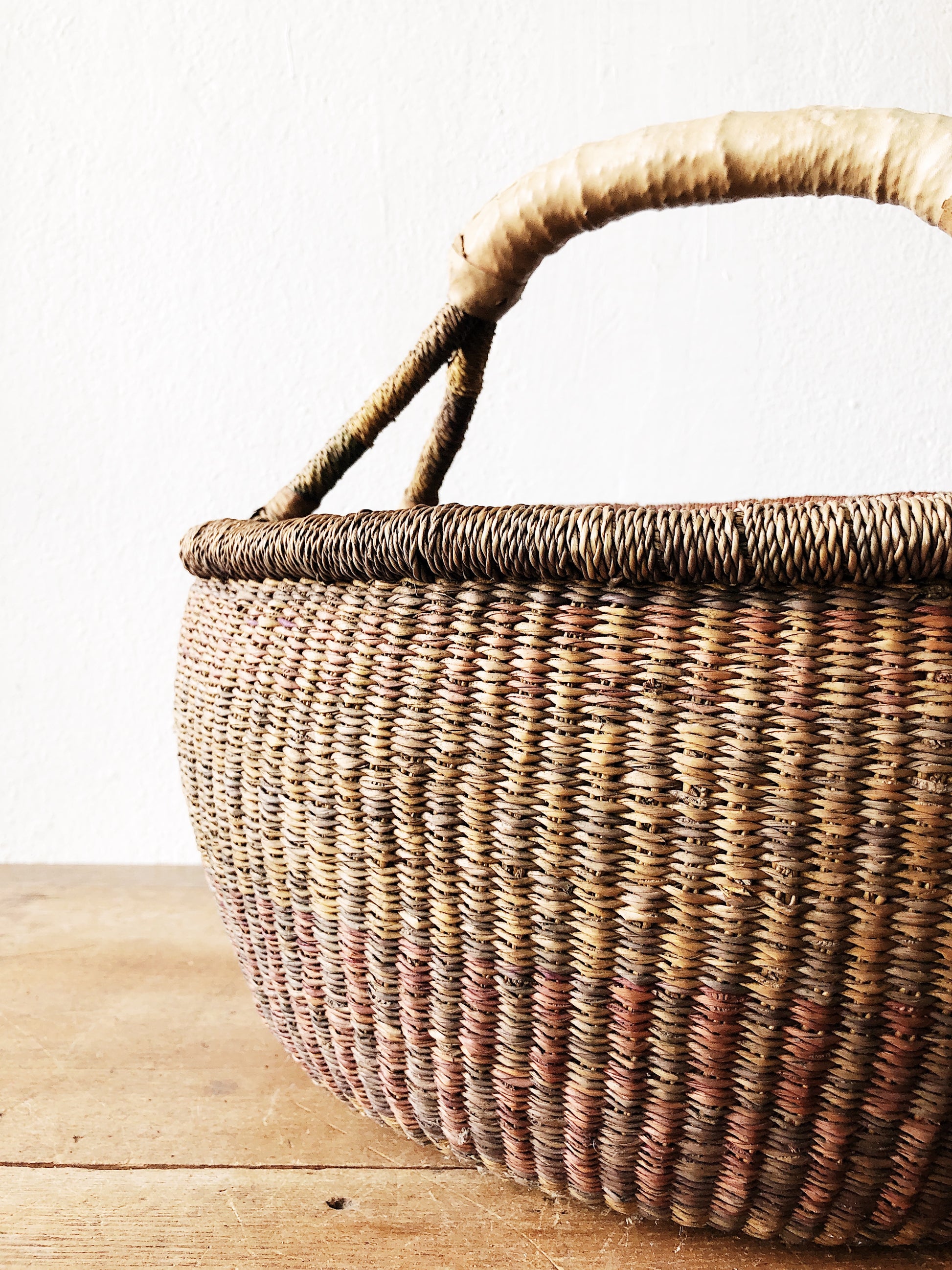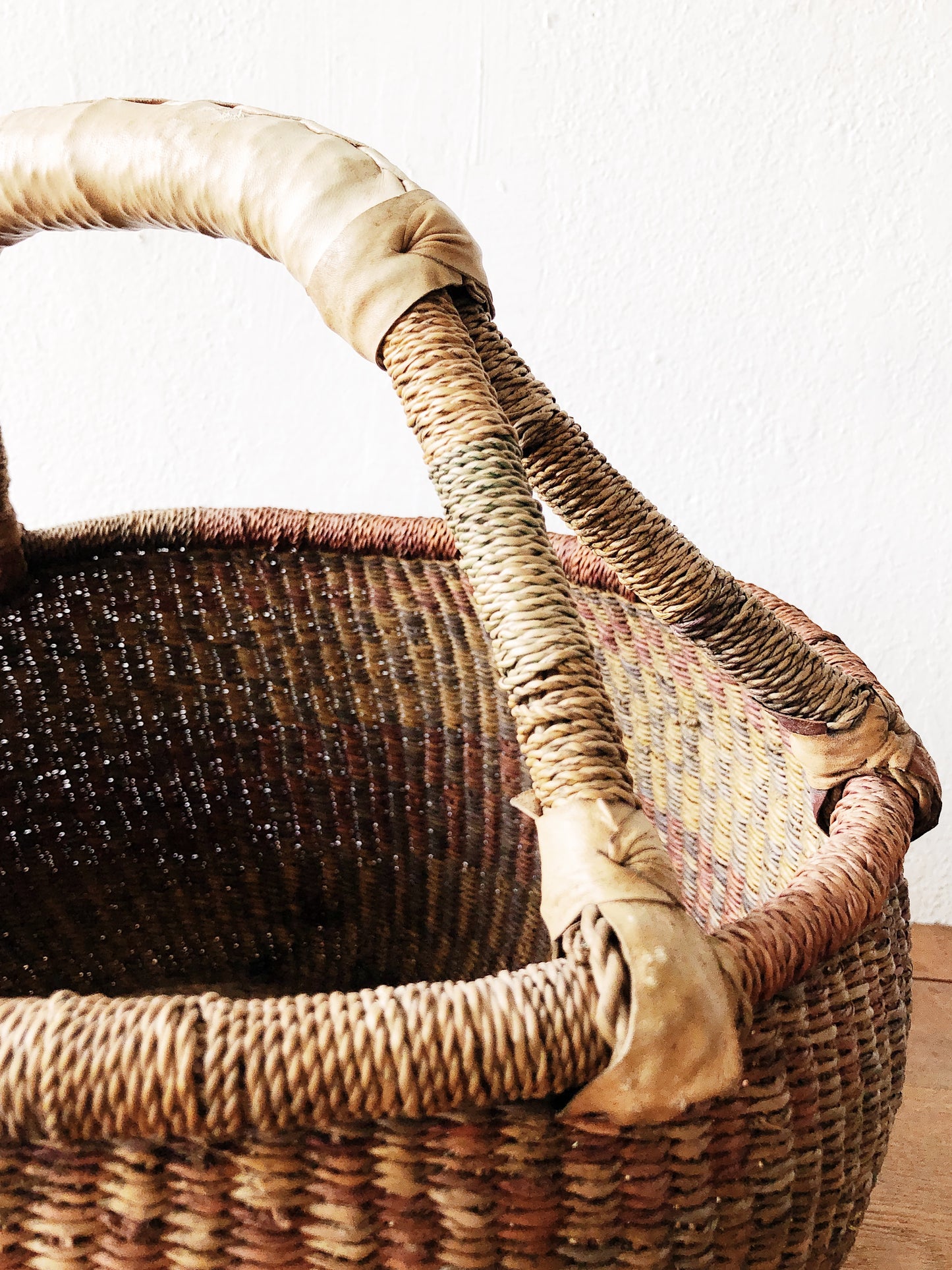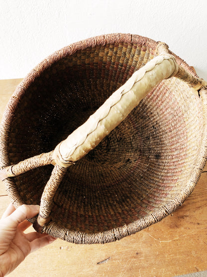 Lovely woven colors in this large bolga basket. Leather wrapped details. The while thing a nice timeworn appeal