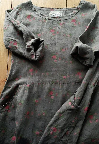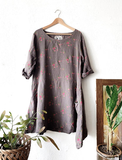 Grey linen smock dress with floral print and pockets! Super cute and easy to wear. Great with tights/boots or over jeans. Great look and in great condition.