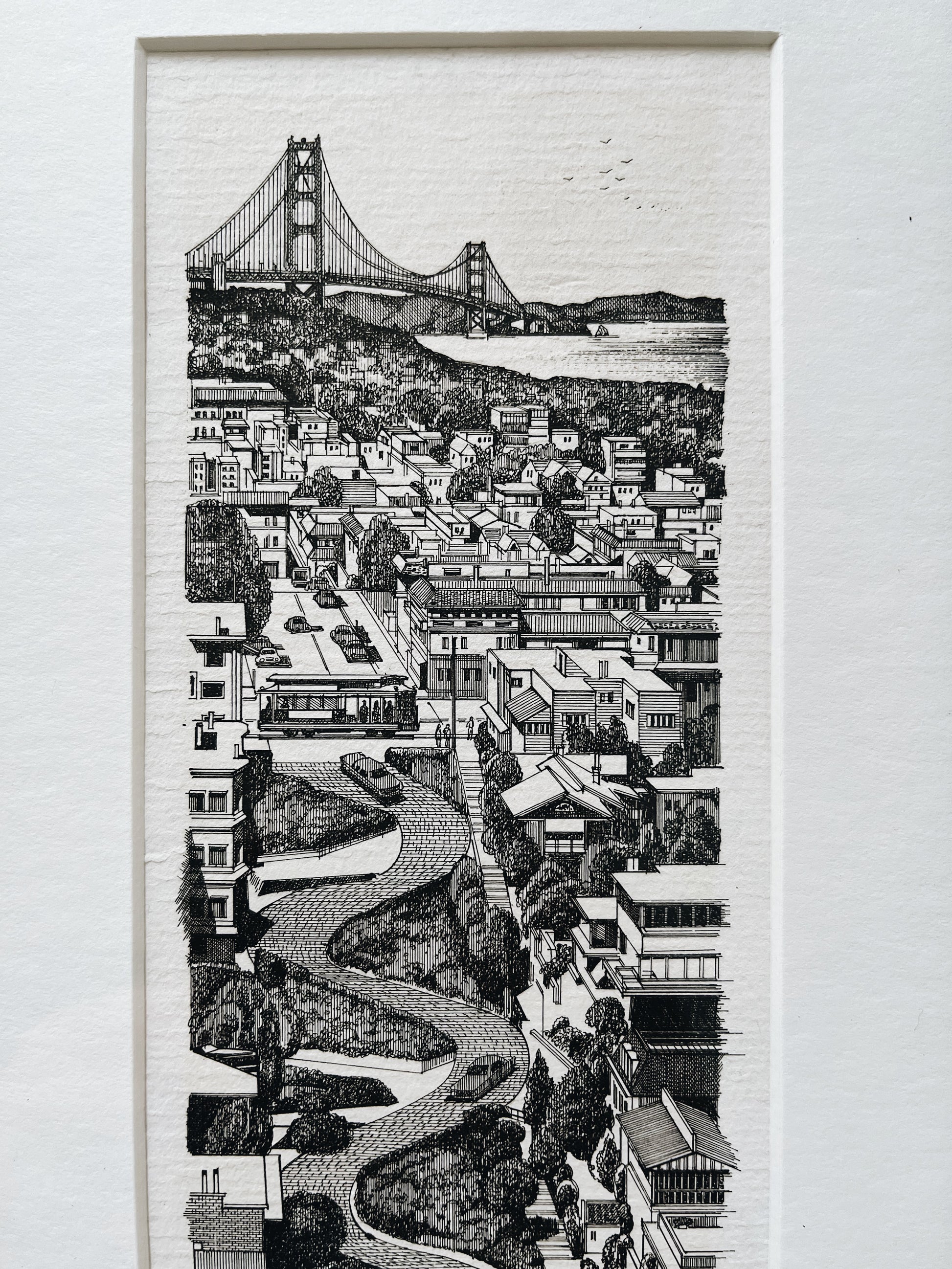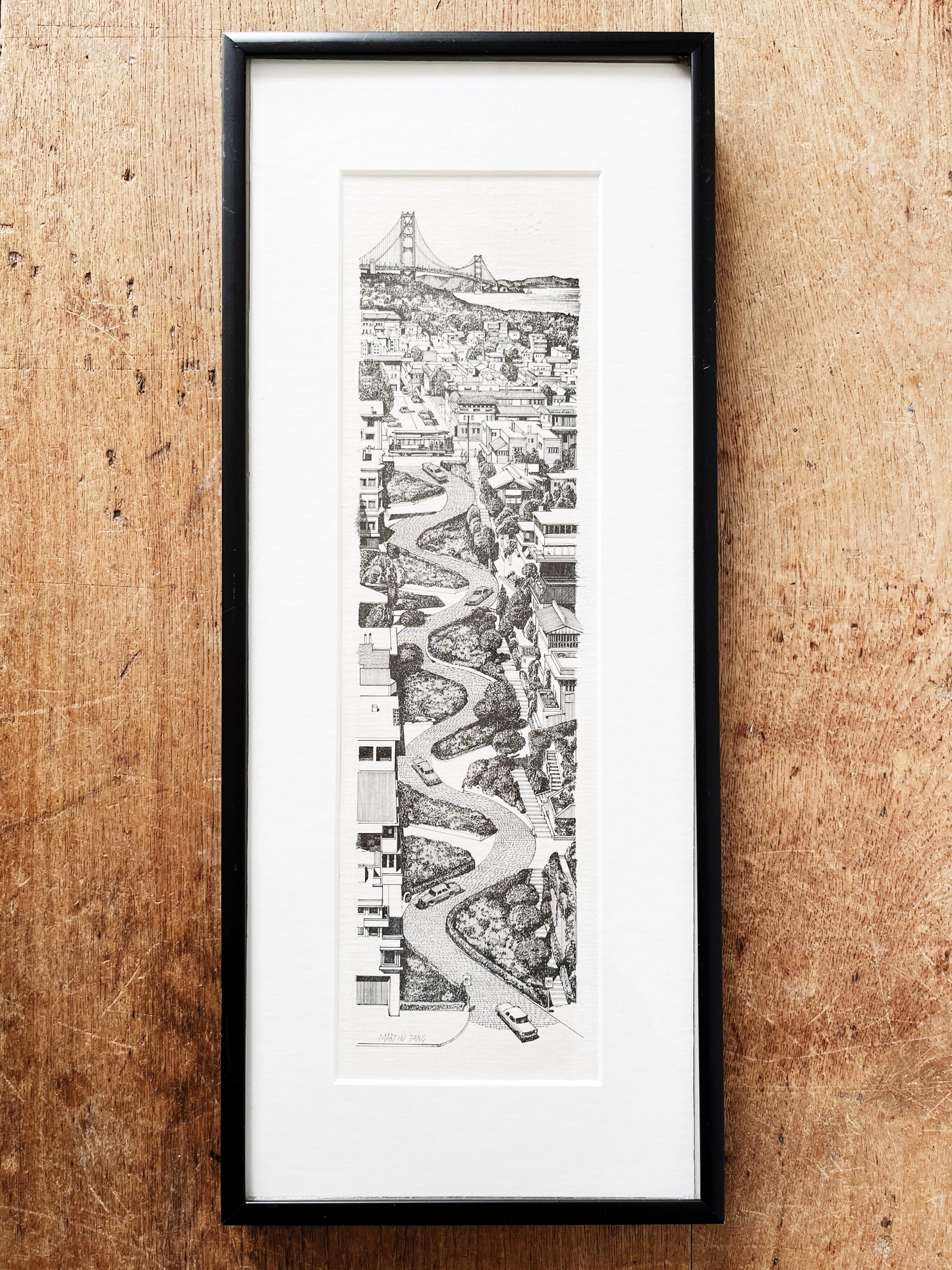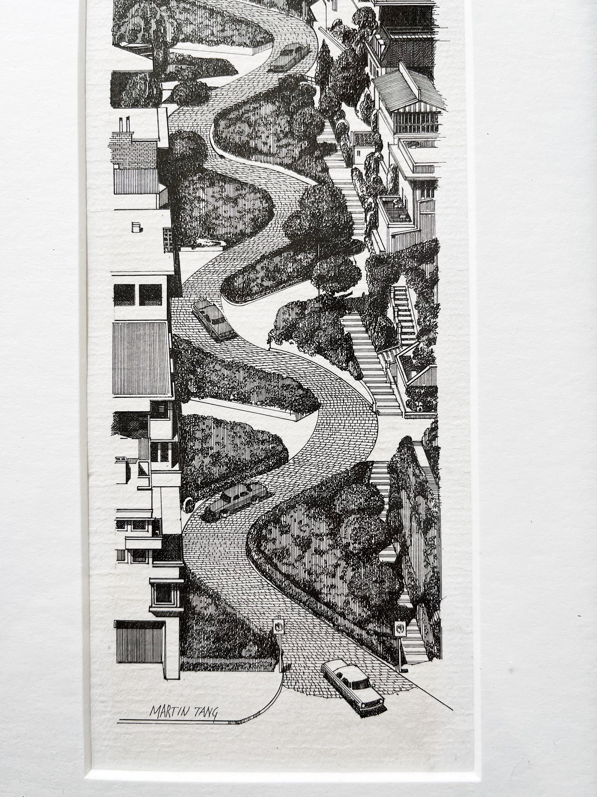 Early 1980s lithograph by Martin Tang. Finely detailed rendering of one of the most famous streets in the world, Lombard Street. Framed nicely in a metal museum mount under glass. Signed.