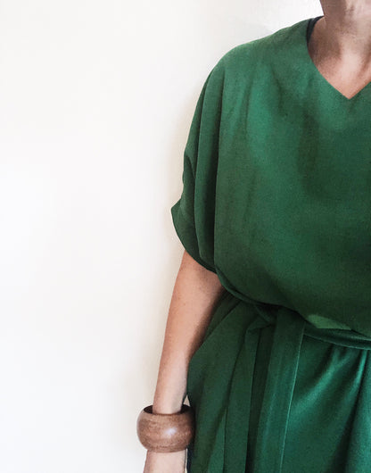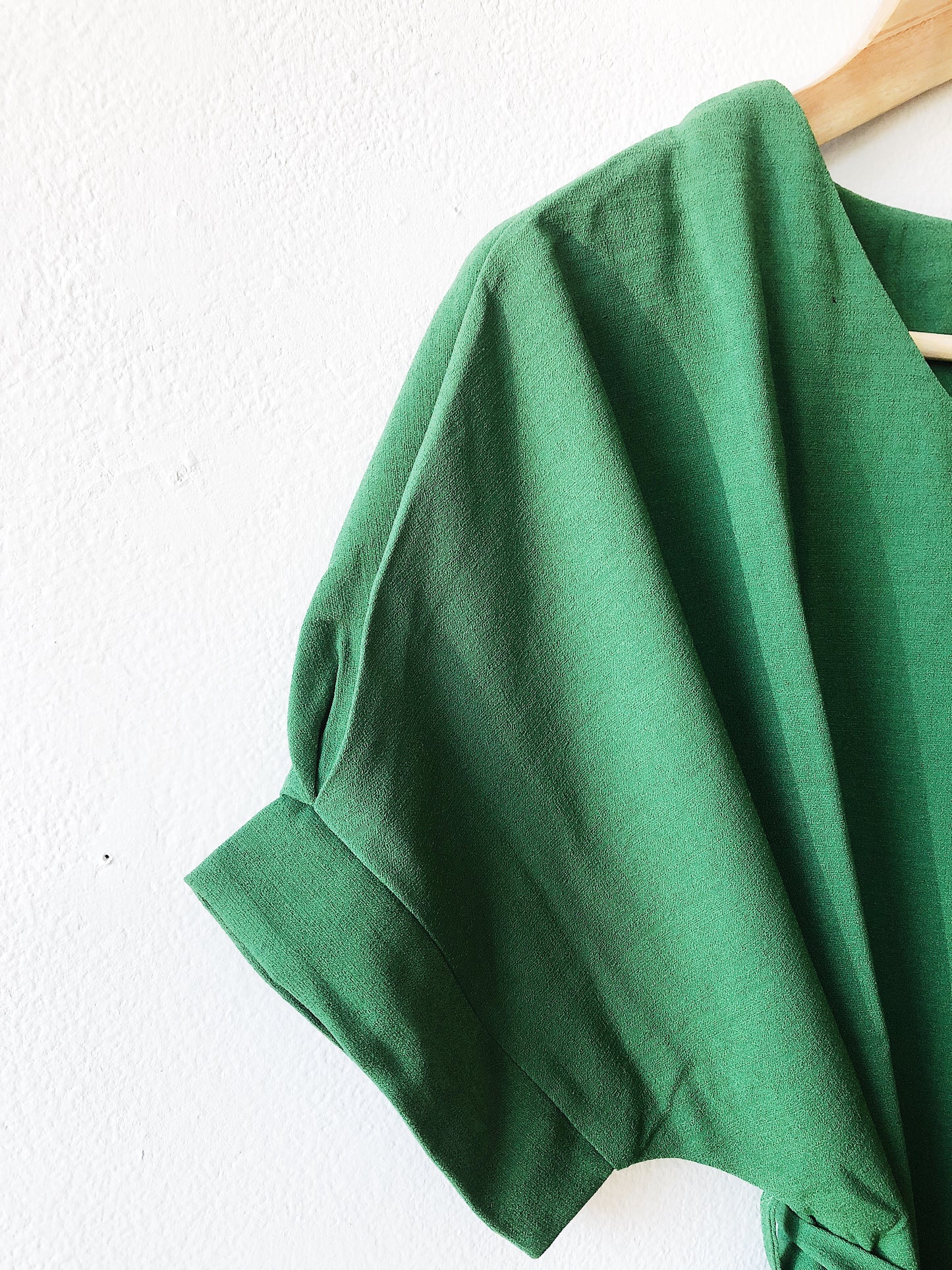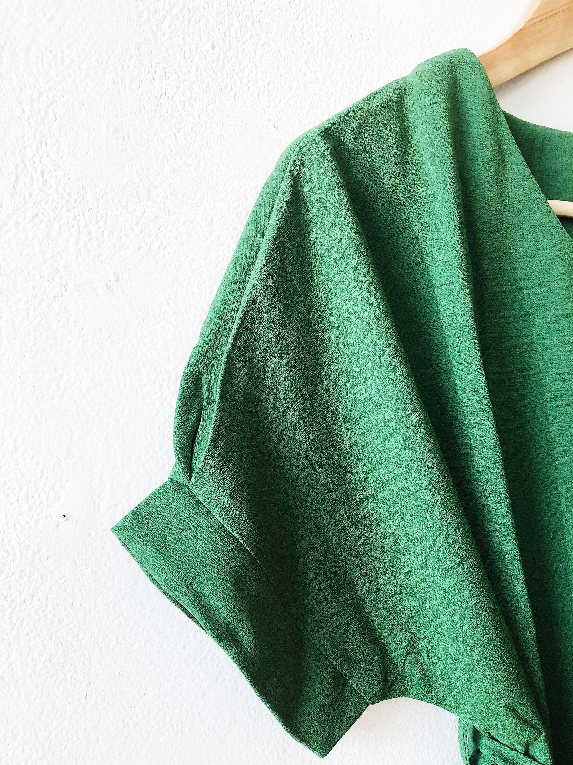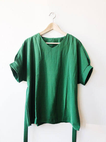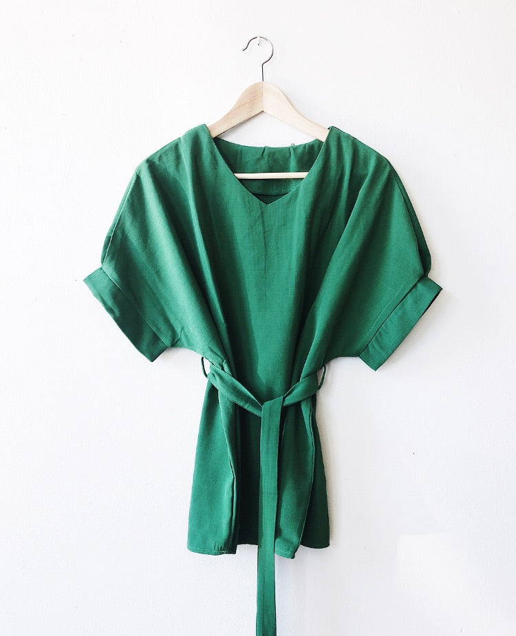 Loose fitting tunic style blouse with a handmade feel. Looks best belted. Great sleeve detail. Cotton poly crepe.