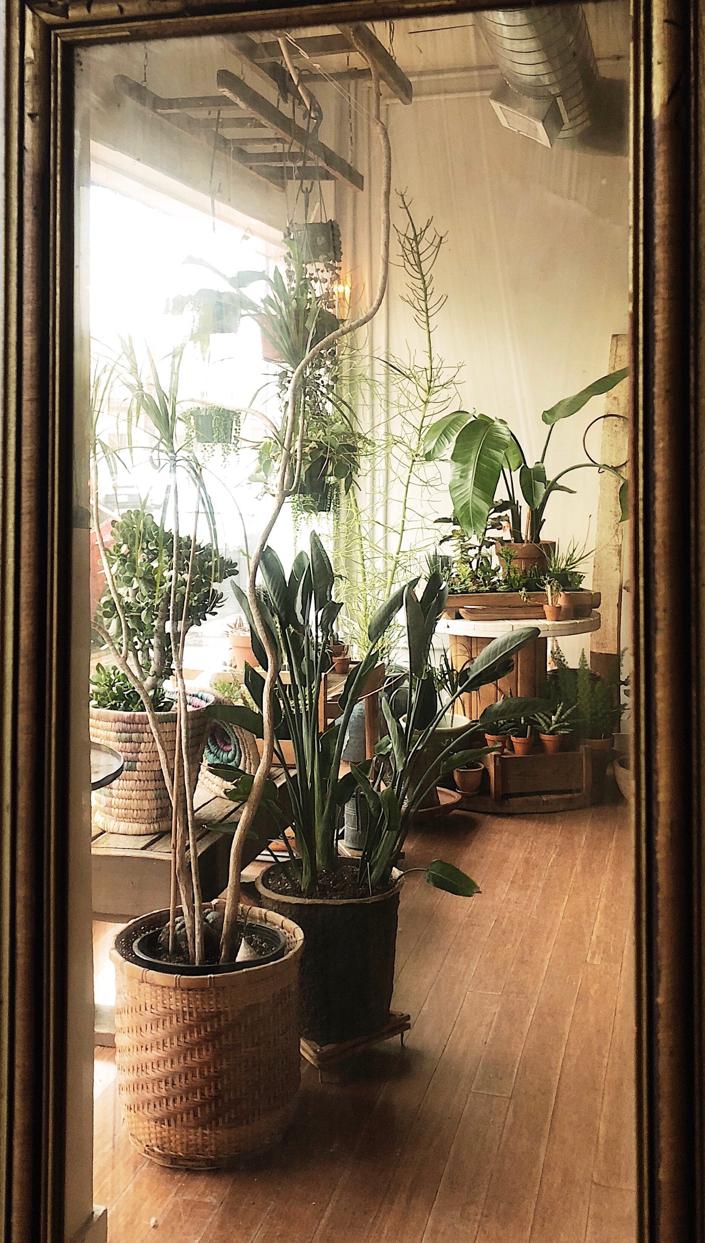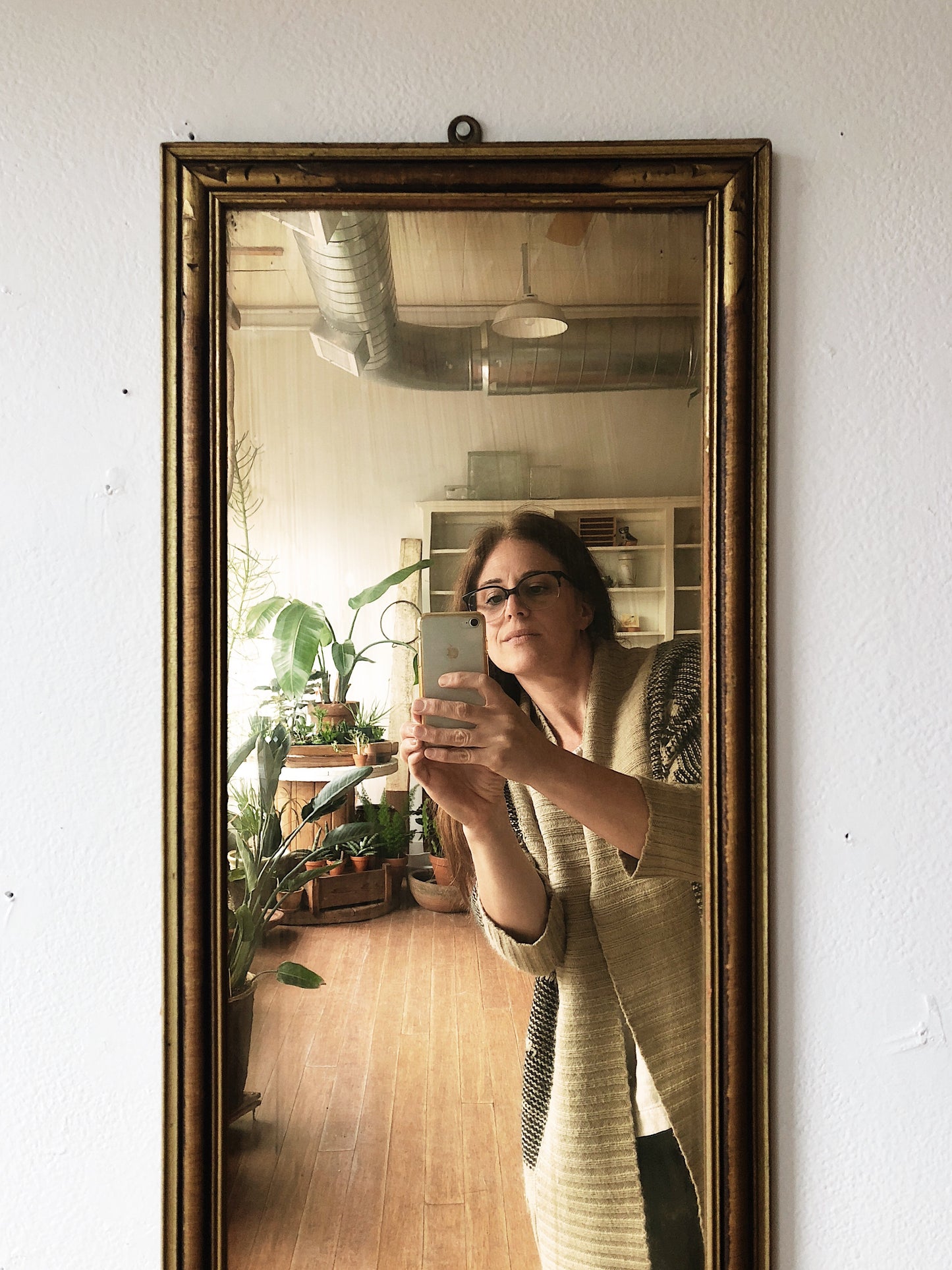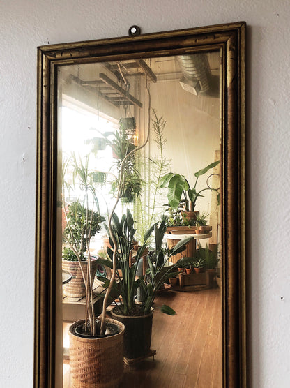 A lovely full length mirror with aged gold leaf frame. The glass is slightly wavy and clouded with a faint sepia tone. Lightweight with hanging hook.