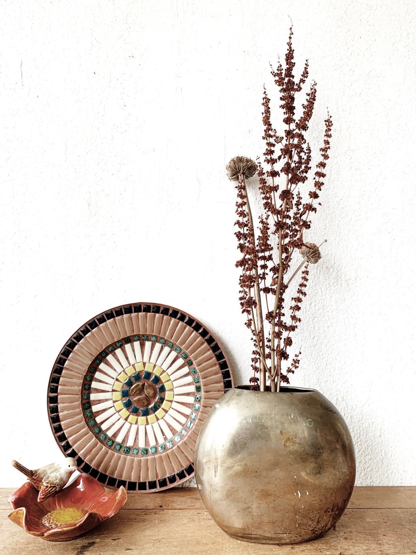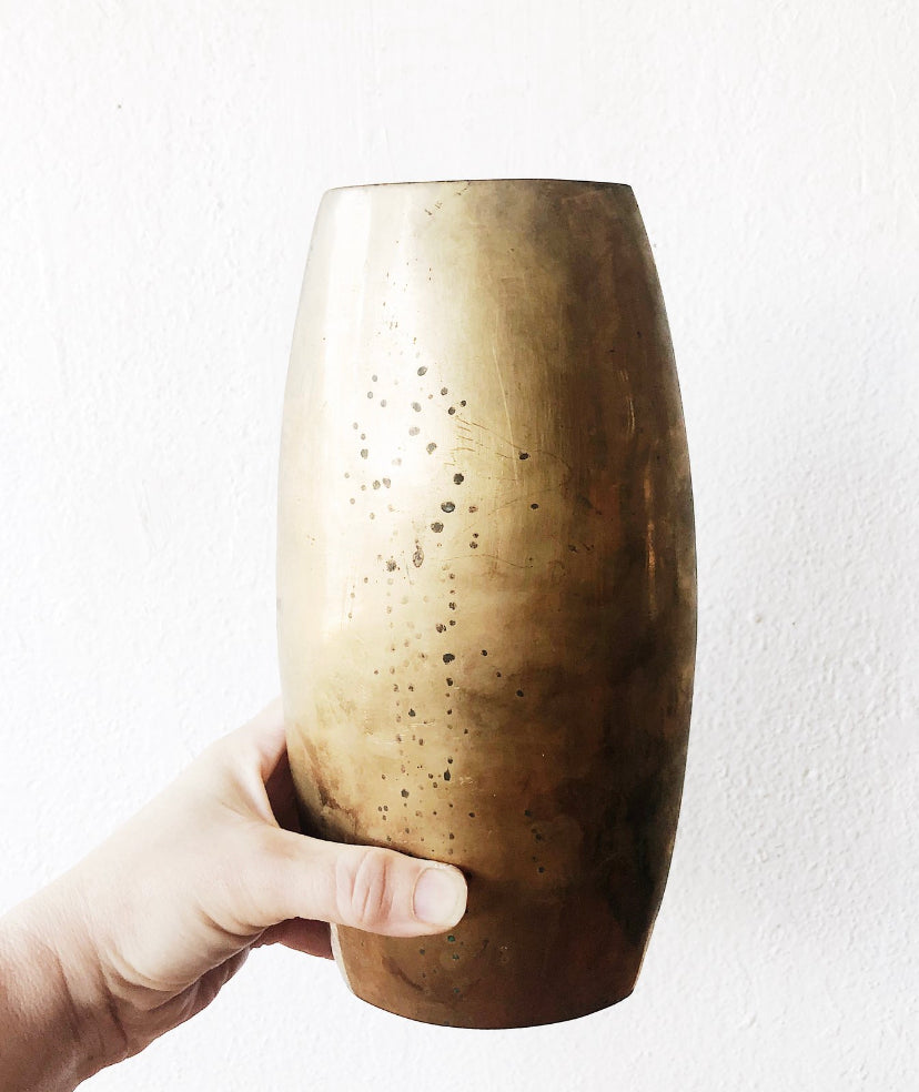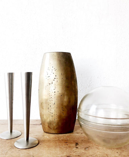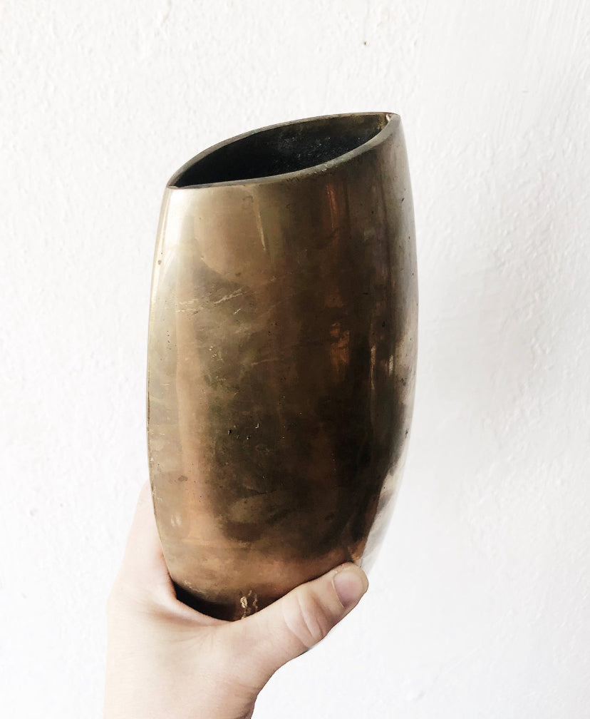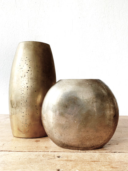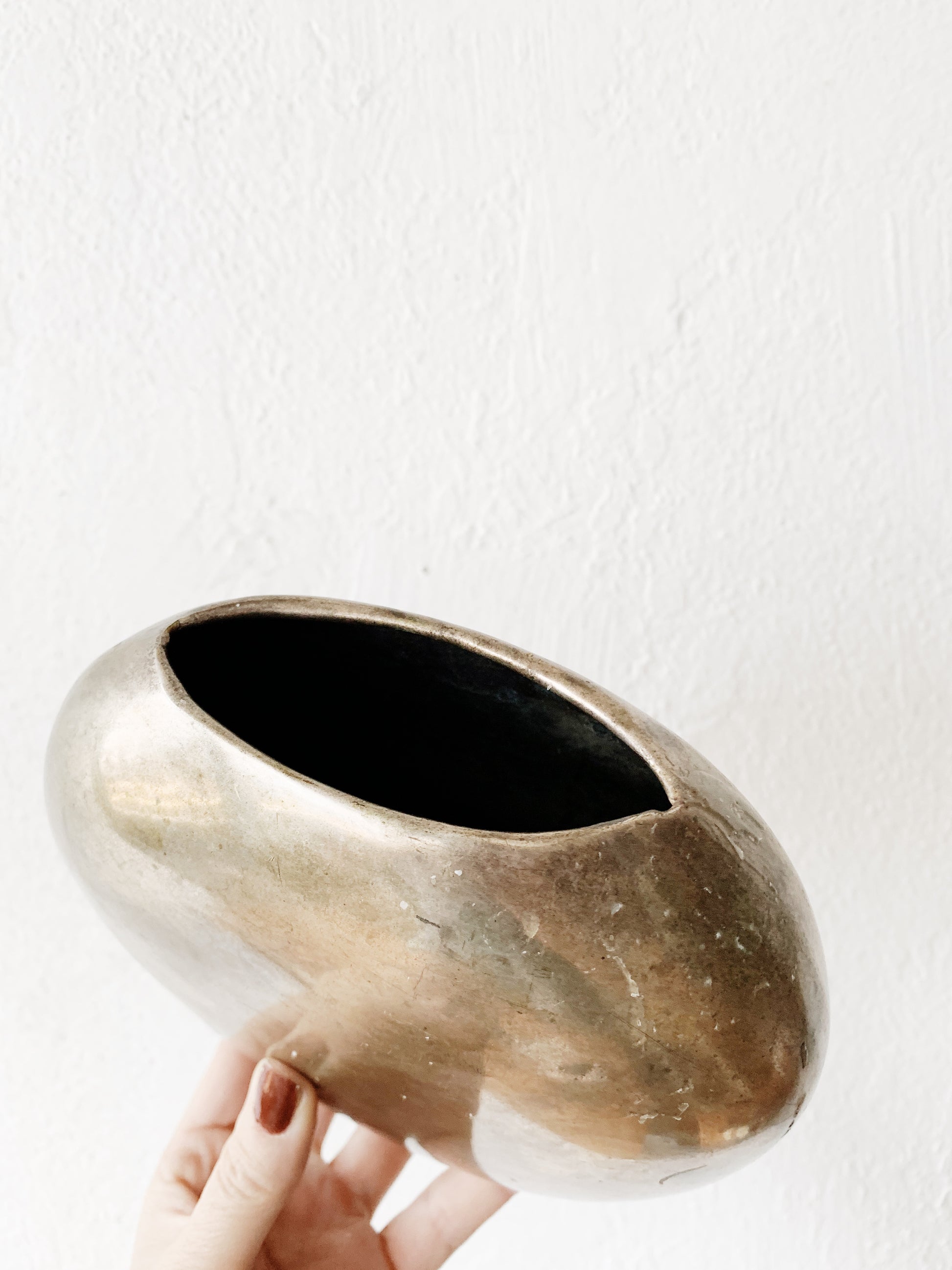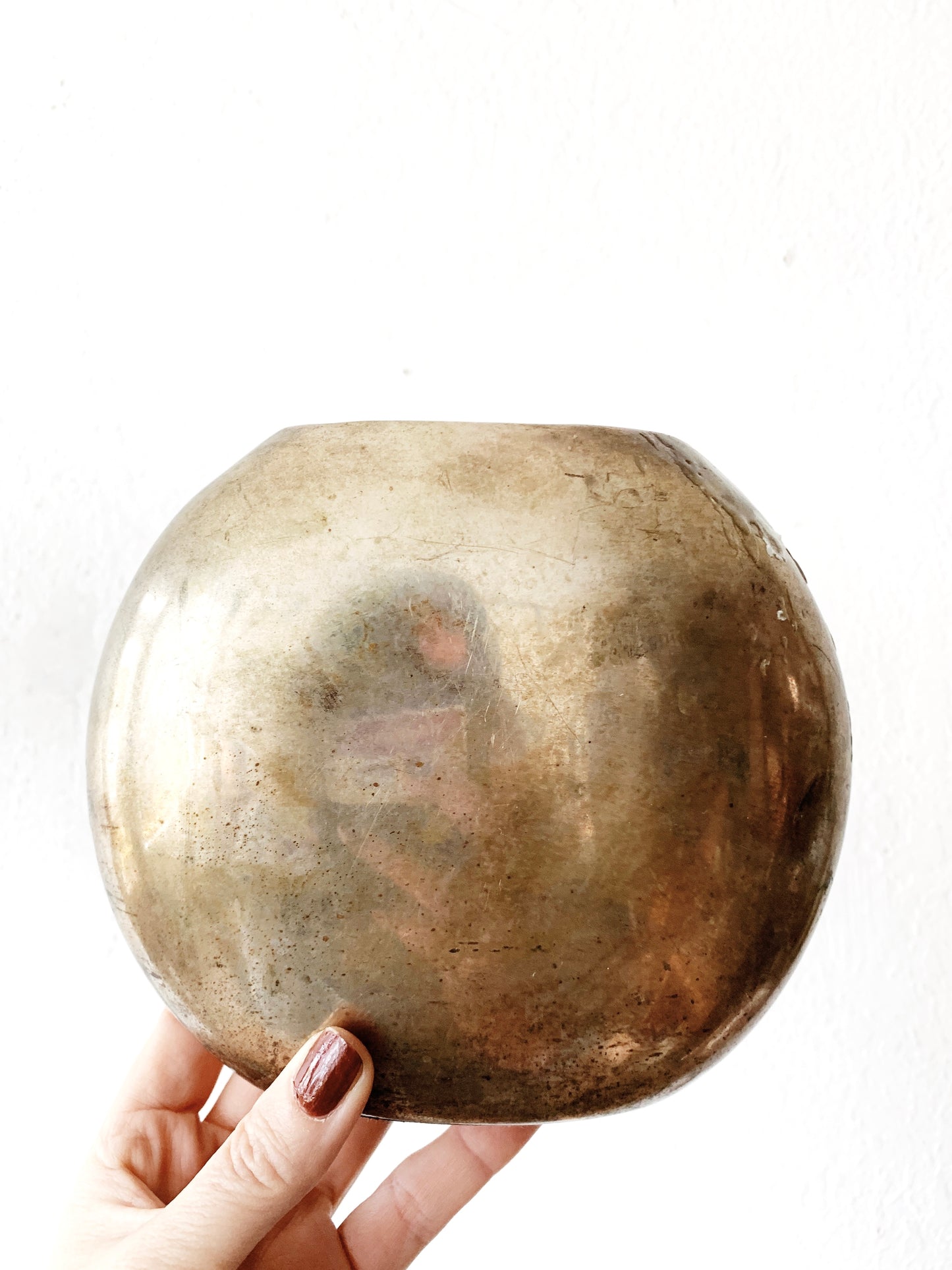 Great shape to this orb metal vase and nice aged patina. We love the look! 6x8”