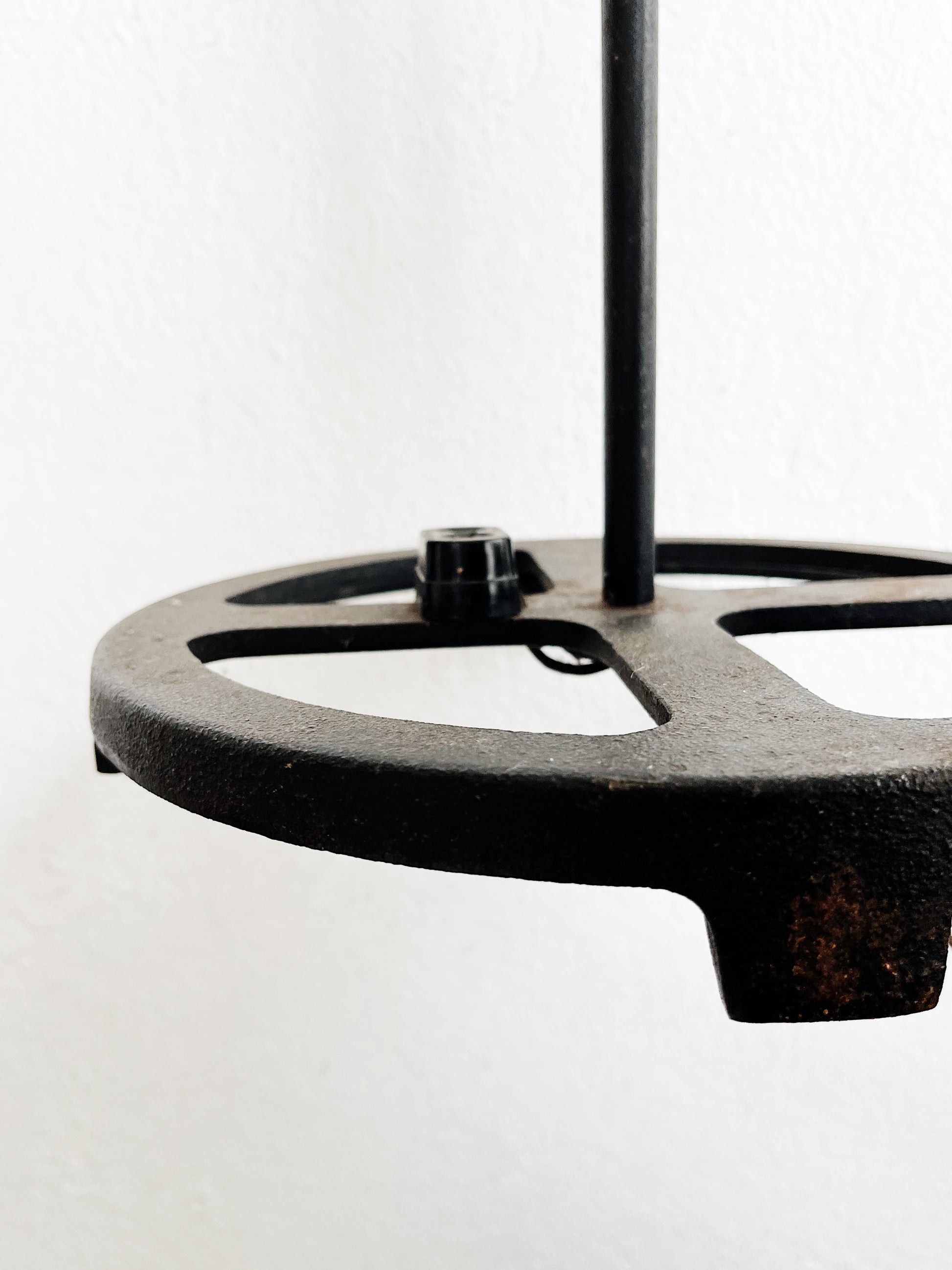 Simple industrial age floor lamp that leans modern. Hand forged iron base with extra plug outlet (genius). Brass fittings. Topped with a white linen shade and brass finial. Shade has some very minor discoloration but towards the back