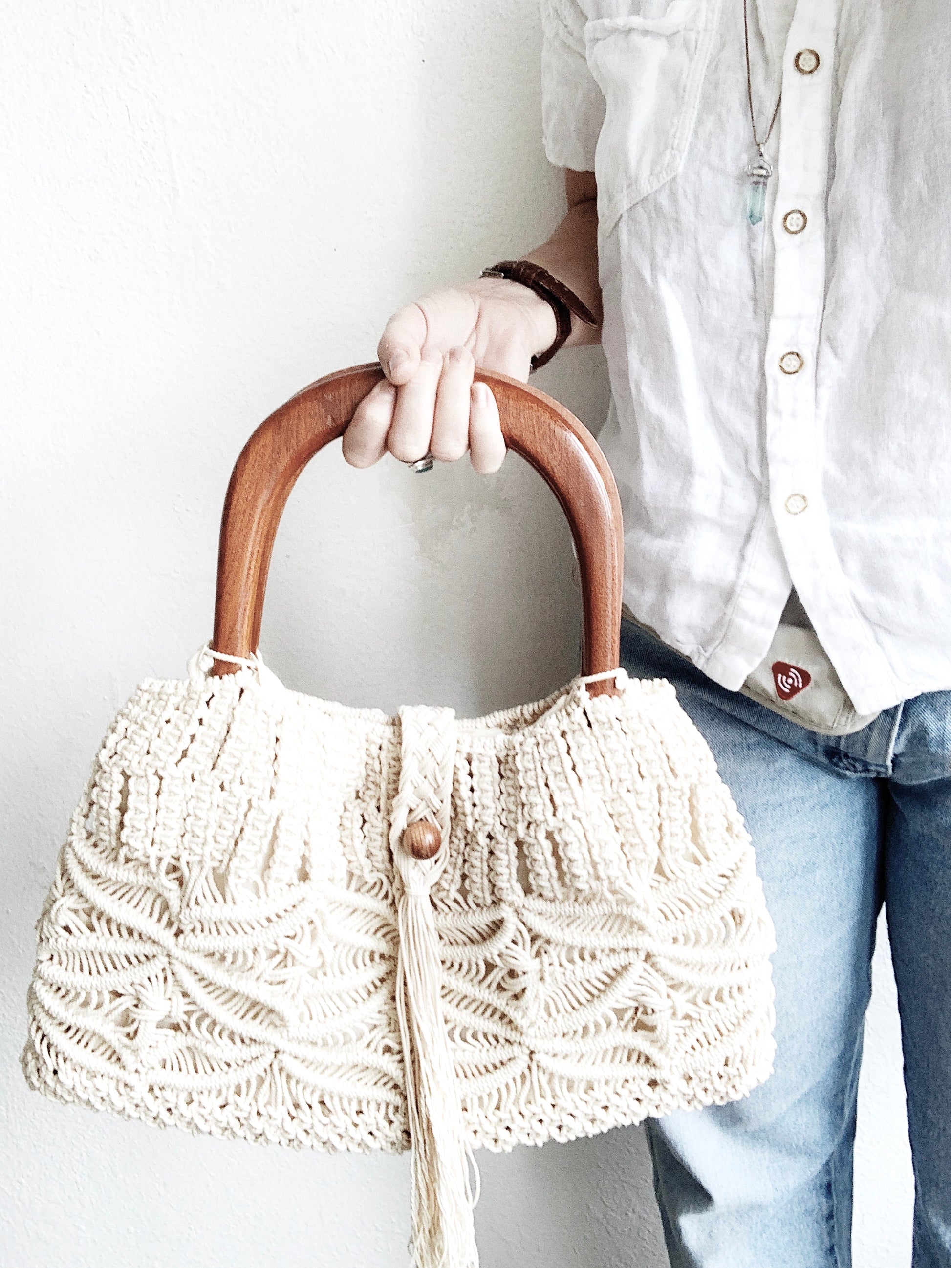 1) This is a beautiful macrame bag with leather wrapped handles. Lined in cotton. I bought this new at the Banana Republic store in Corte Madera, CA about 20 years ago. Not quite vintage yet but getting there ;)