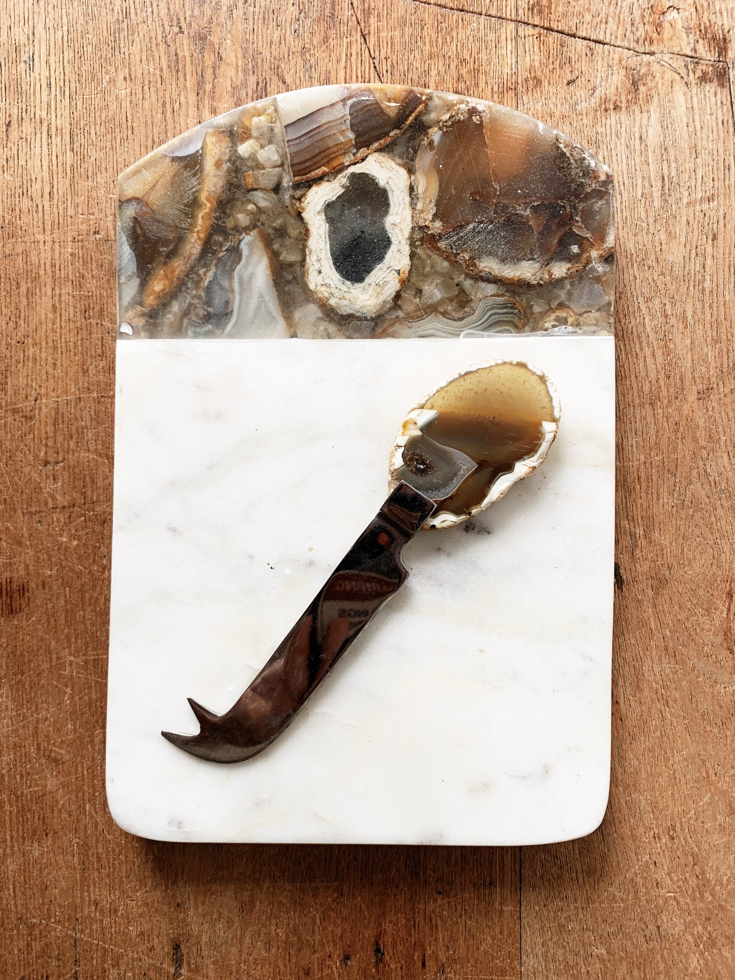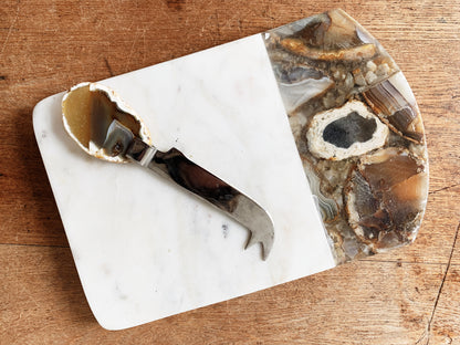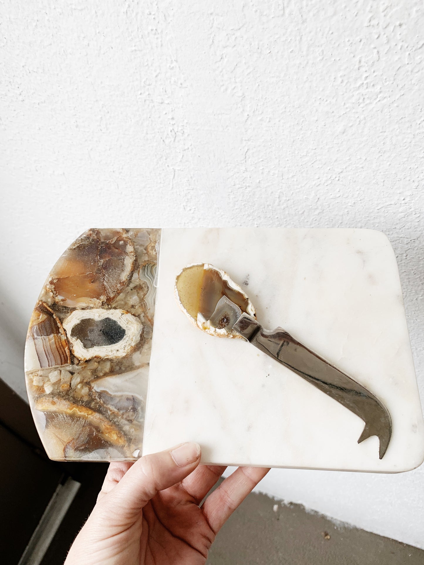 Such a great duo! Marble with agate resin edge cheeseboard with coordinating knife with agate handle.